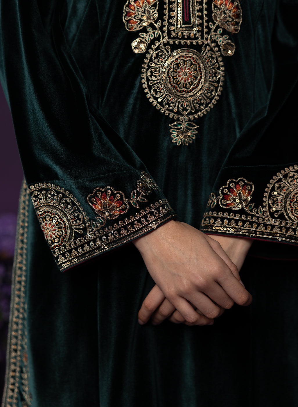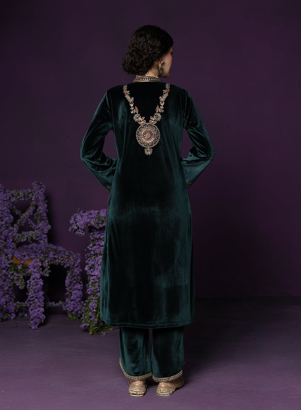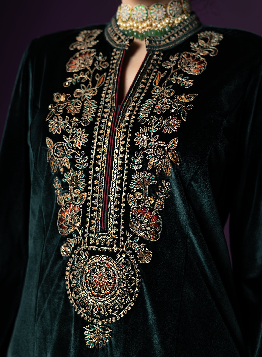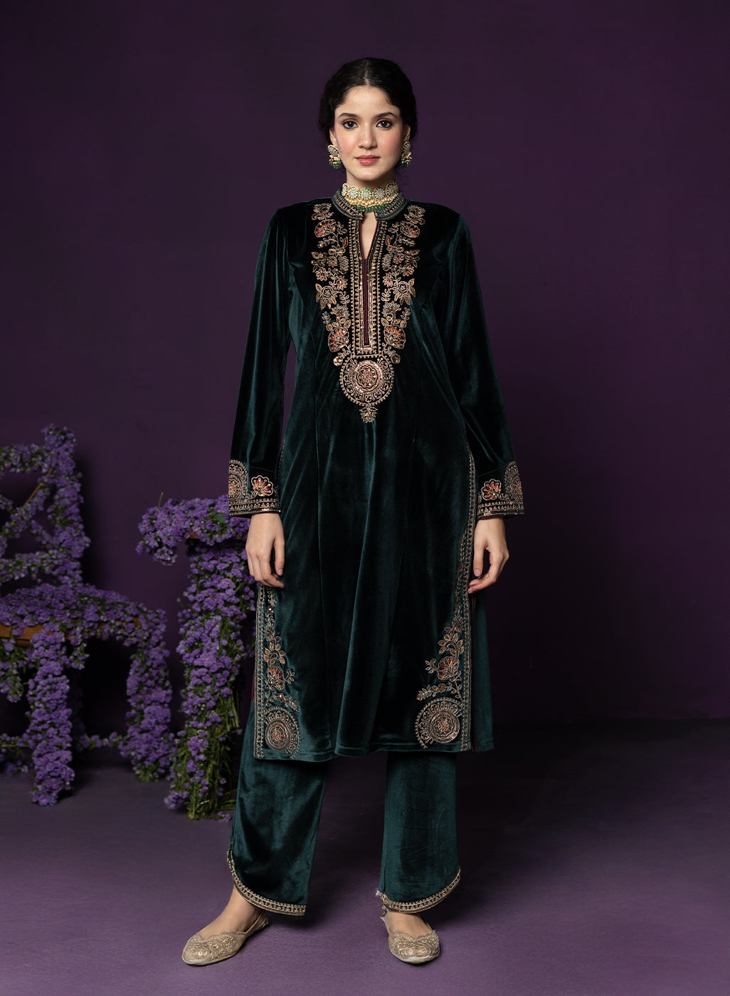Eshira Emerald Green Embroidered Velvet Suit Set with Banarasi Dupatta