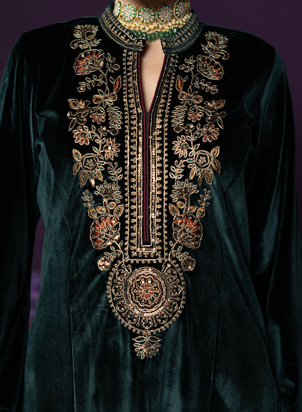 Rich, refined, and quietly striking, this emerald green velvet suit set is all about old world charm with a modern edge. The plush velvet base catches the light beautifully, while intricate dori embroidery with resham and sequin highlights lends it an additional shimmer. Finished with maroon contrast piping, a mandarin collar, and graceful bell sleeves, the look comes together to serve as the perfect base for the majestic banarasi dupatta.