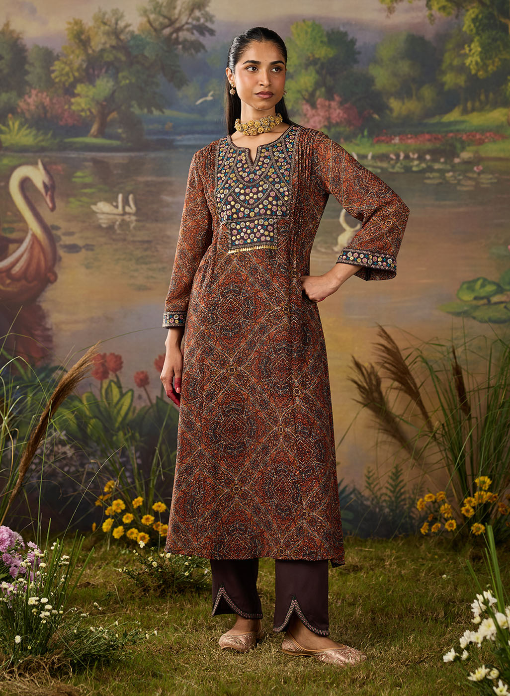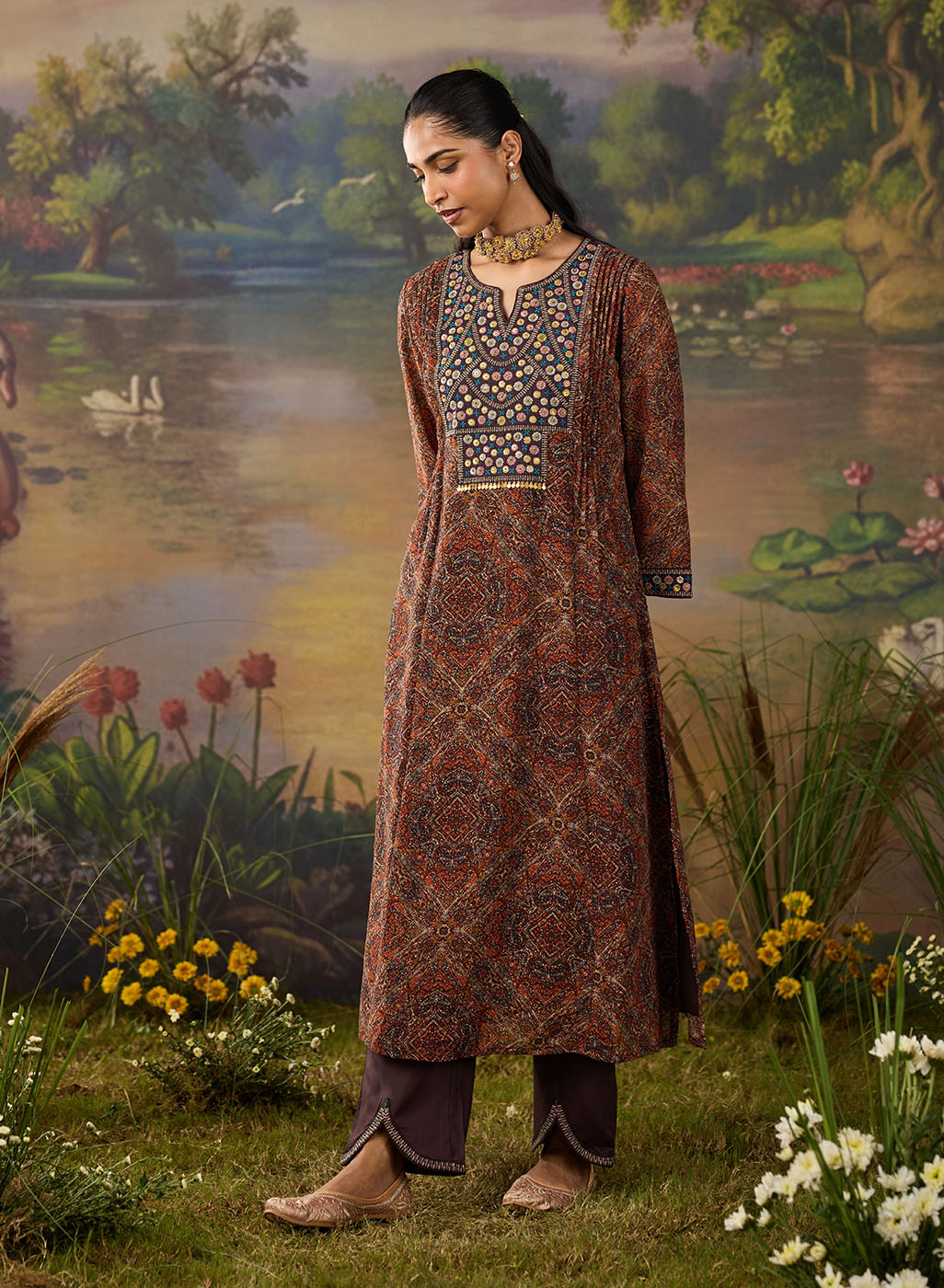 Earthy tones meet boho elegance in this brown georgette kurta set, perfect for making a subtle yet striking statement. The straight kurta showcases a tribal-inspired print, elevated with thread embroidery and playful coin accents on the notched neckline, sleeve hems, and bottom hem. Pintuck detailing on the princess panel creates a graceful silhouette, while the lightweight, fully-lined georgette drapes beautifully, offering both comfort and charm. The solid straight pants feature thread embroidery on the hem and a matching printed dupatta, finished with delicate lace, completes this earthy, festive-ready ensemble.