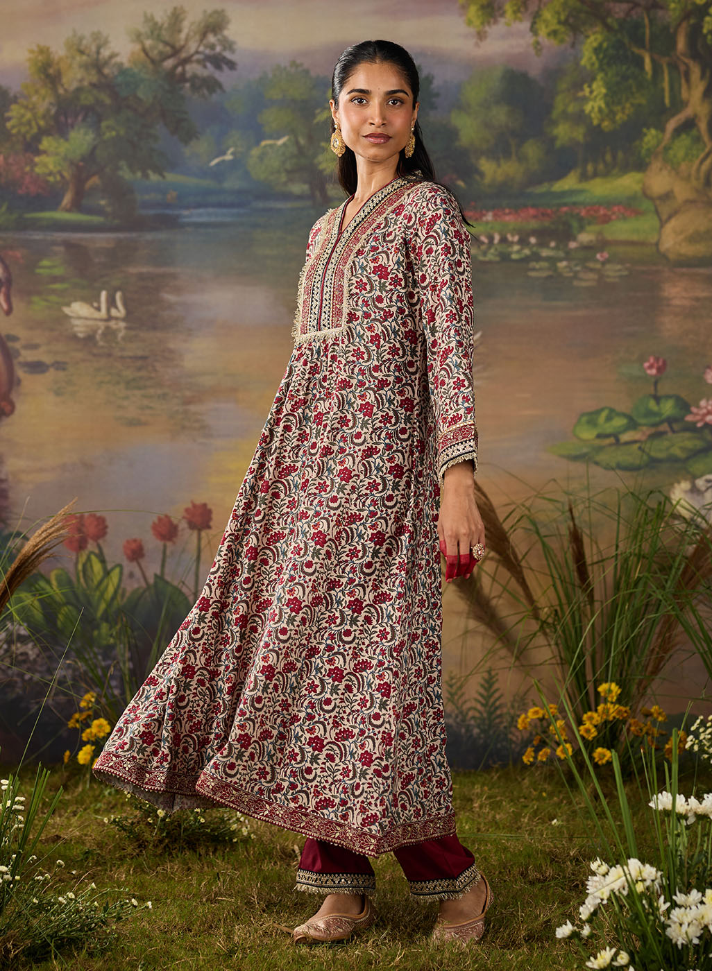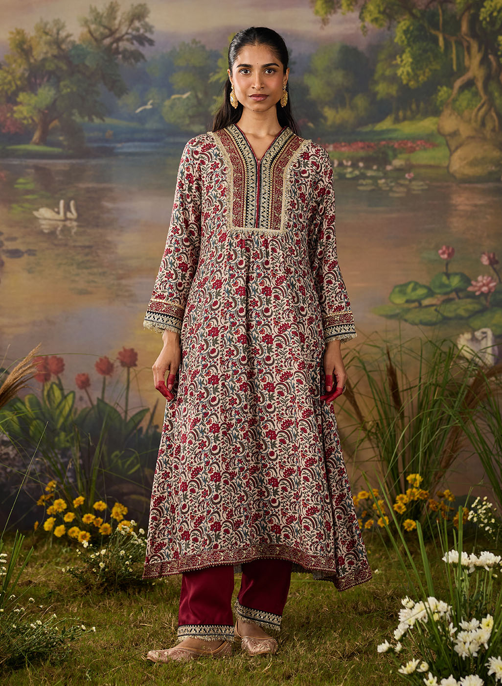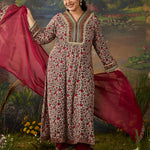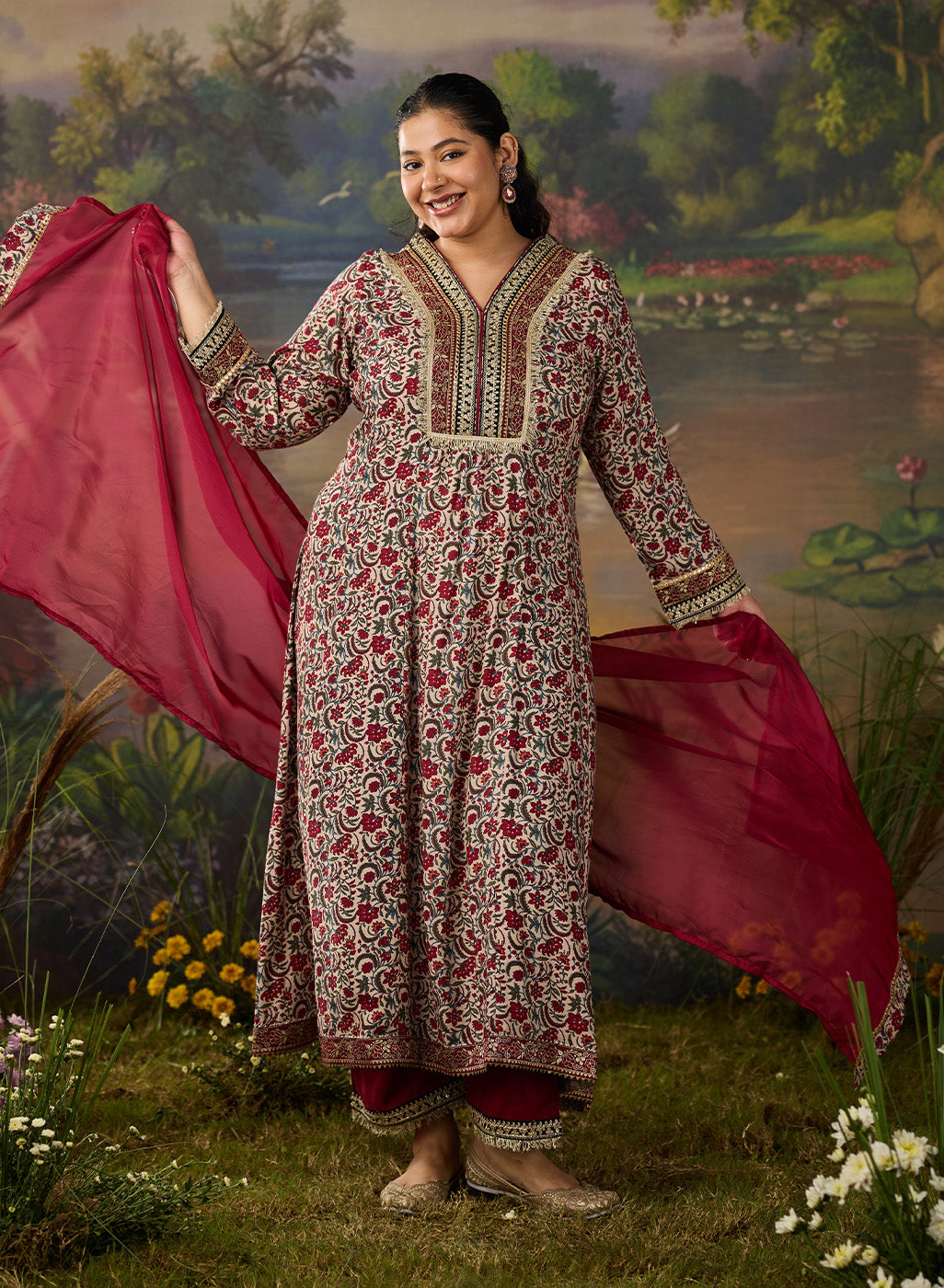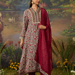 Kainat Maroon Traditional Floral Printed Viscose A-line Suit Set with Dupatta