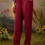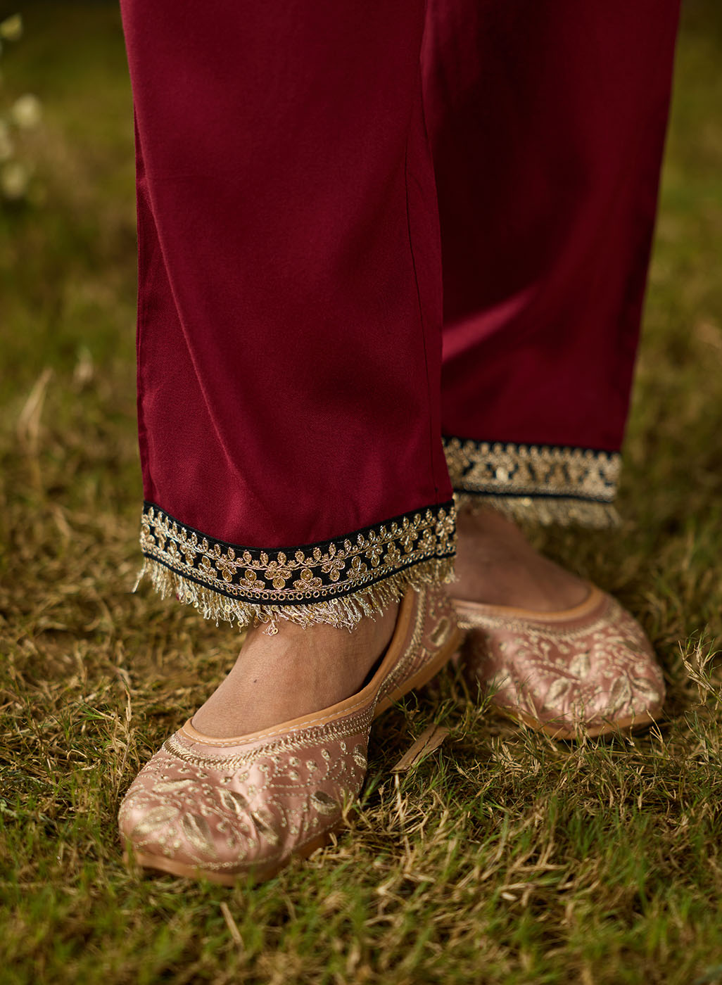 Rich, festive, and full of detail. This maroon viscose kurta set with dupatta brings together the charm of traditional prints and the sparkle of intricate embellishments. Crafted in a soft, breathable fabric, the A-line kurta features an all-over print accented with zariwork and sequins. The V-neckline, sleeves, and hemline are beautifully adorned with brocade lace, mirror details, and fringe lace, adding depth and texture to the silhouette. The solid straight pants balance the look with their refined finish, enhanced by delicate embroidery at the hem. Completing the set is a solid maroon dupatta with printed patches and mirror accents, and edged with lace trims tying the whole ensemble together.