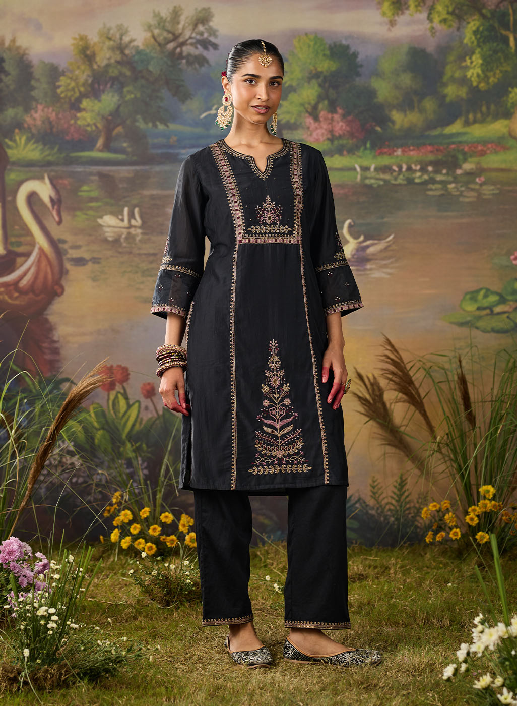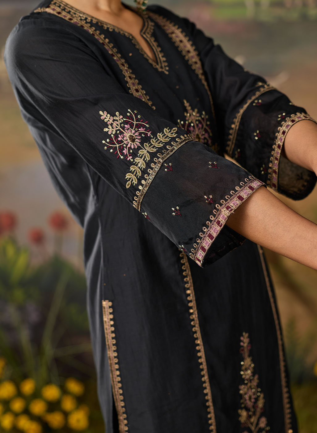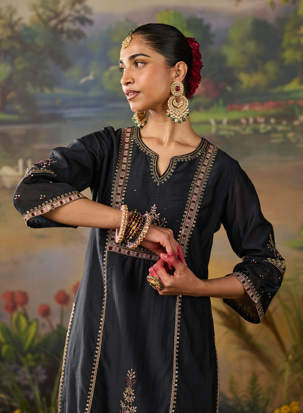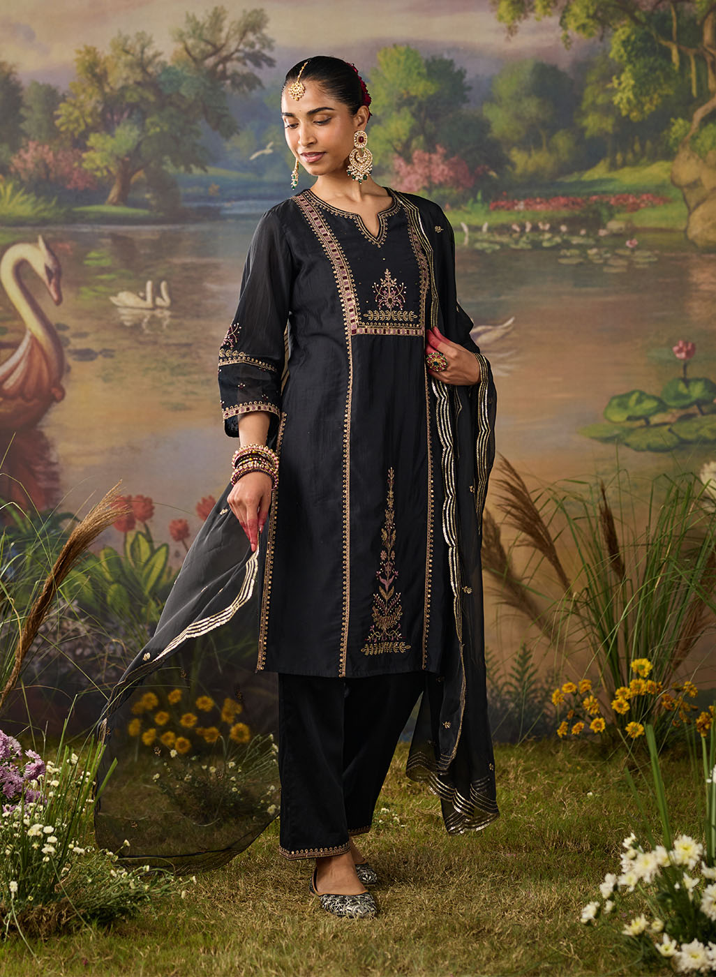 There’s nothing quite like a black Chanderi kurta set—timeless, elegant, and always a statement-maker. This zari embroidered kurta set in soft, breathable Chanderi is elevated with delicate sequin highlights that catch the light beautifully. The organza panels on the sleeves and back yoke add a soft sheer detail, while the matching dupatta, finished with scalloped edges and all-over zari bootis, ties it all together seamlessly. Paired with sleek straight pants, this straight kurta set brings the perfect balance of festive charm and everyday sophistication, making it a true classic ethnic outfit you’ll keep reaching for.