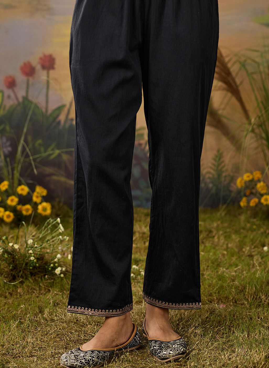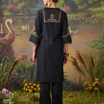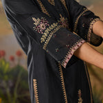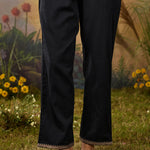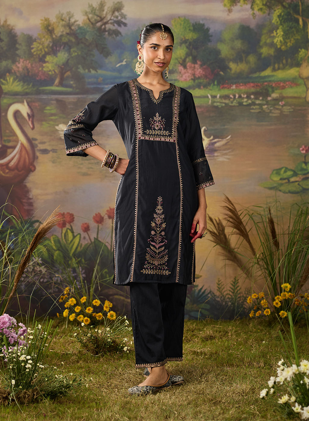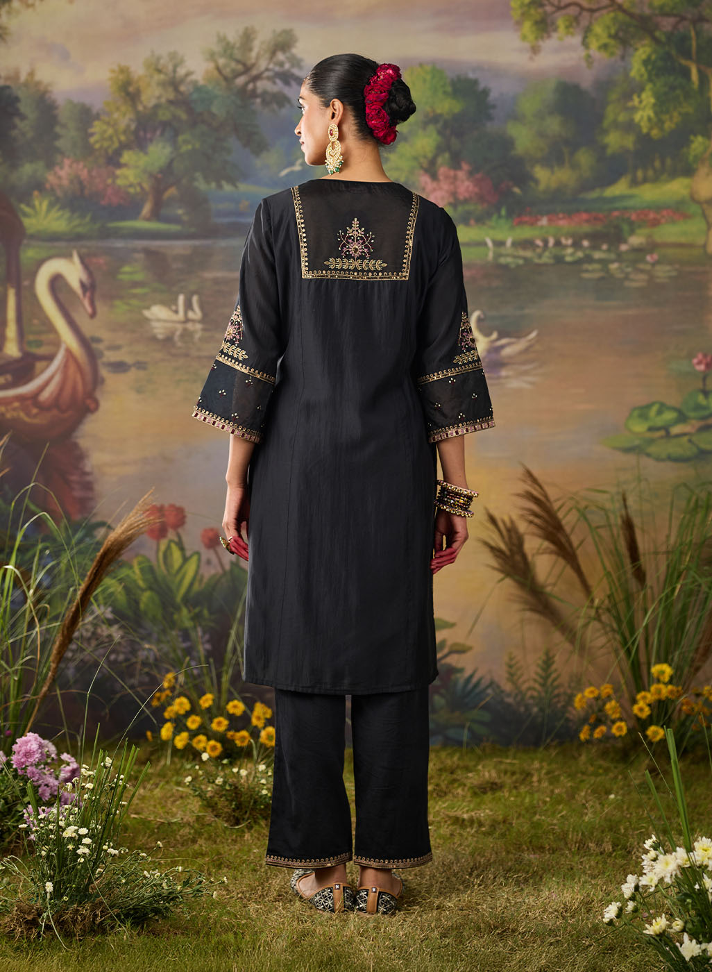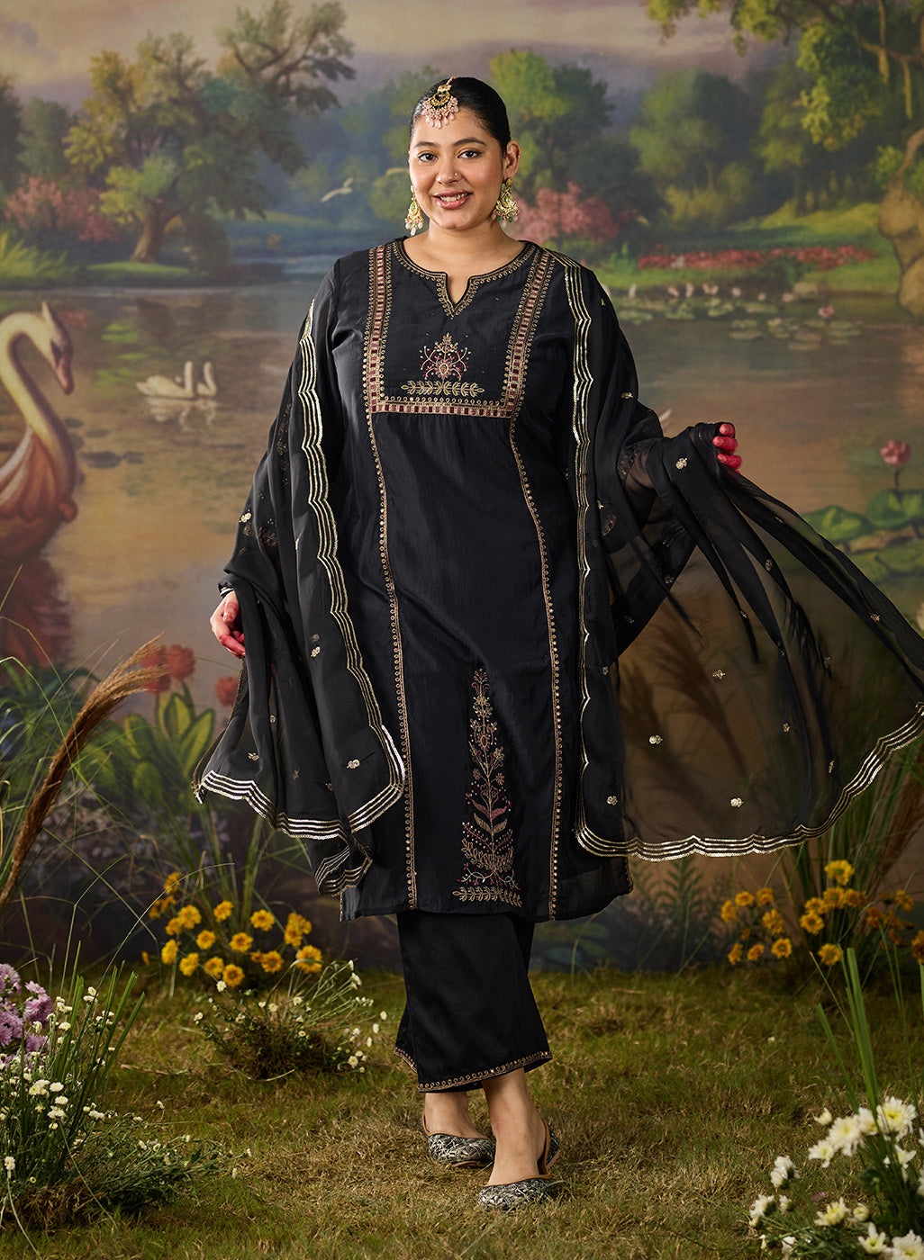There’s nothing quite like a black Chanderi kurta set—timeless, elegant, and always a statement-maker. This zari embroidered kurta set in soft, breathable Chanderi is elevated with delicate sequin highlights that catch the light beautifully. The organza panels on the sleeves and back yoke add a soft sheer detail, while the matching dupatta, finished with scalloped edges and all-over zari bootis, ties it all together seamlessly. Paired with sleek straight pants, this straight kurta set brings the perfect balance of festive charm and everyday sophistication, making it a true classic ethnic outfit you’ll keep reaching for.