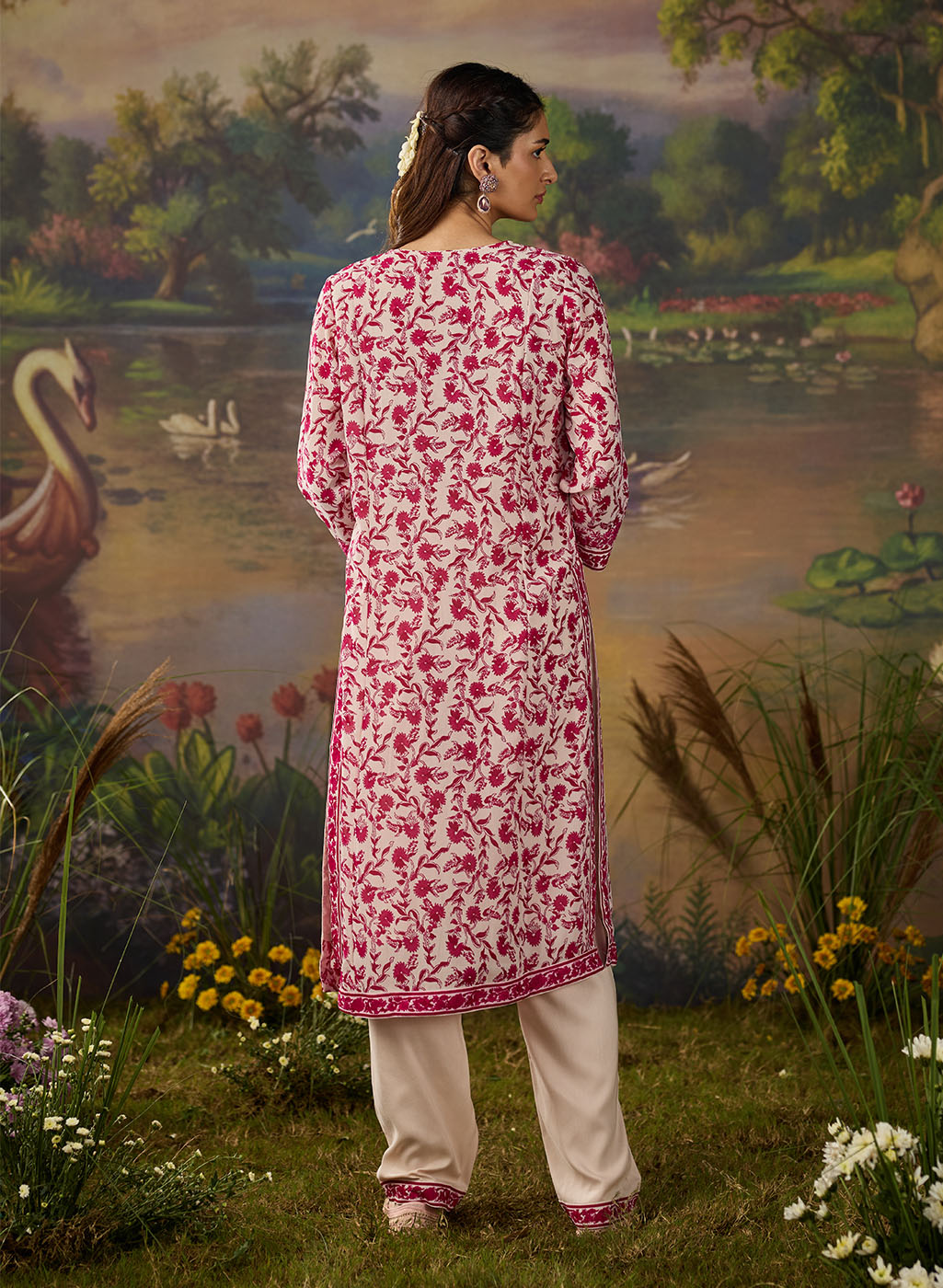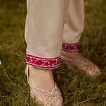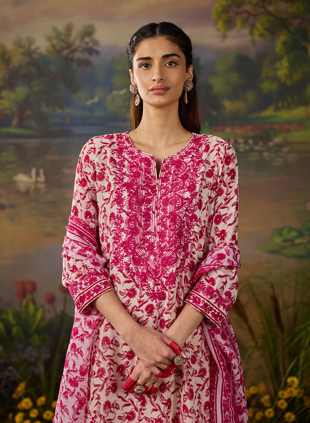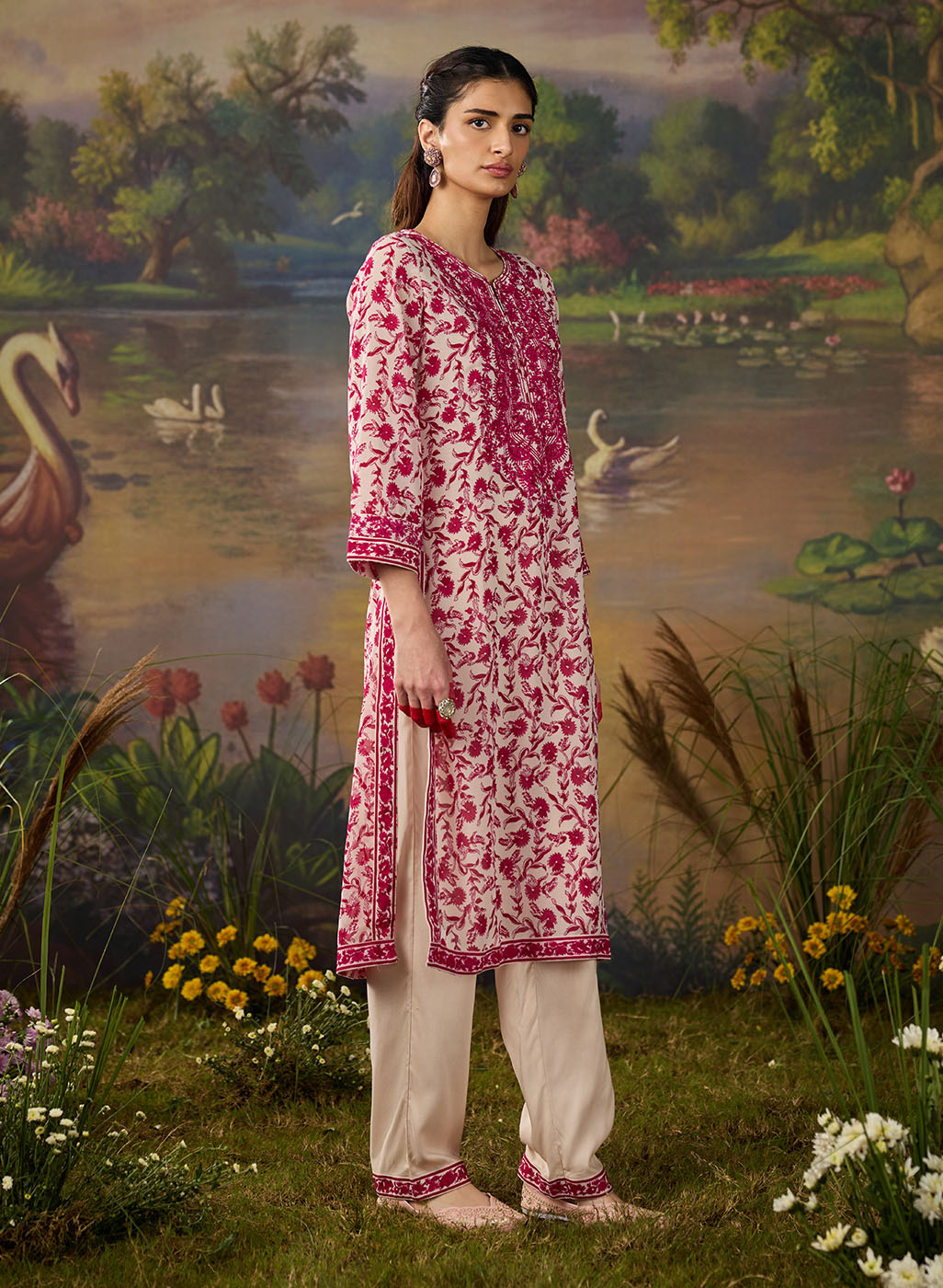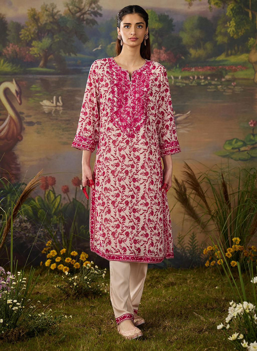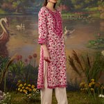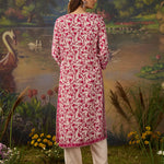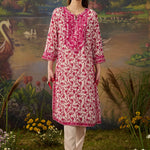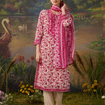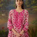 Fresh, breezy, and beautifully detailed. This vibrant fuchsia floral printed viscose georgette kurta set is made for days when you want to look put-together without trying too hard. The straight kurta features an all-over floral print, brought to life with intricate thread embroidery and rhinestone embellishments along the neckline, sleeve cuffs, and side slits. The solid cream bottoms, finished with lace at the hem, keep the look balanced and elegant, while the printed dupatta finishes the look with a flair of romance. Easy, breathable, and perfect for day events or casual festive looks.