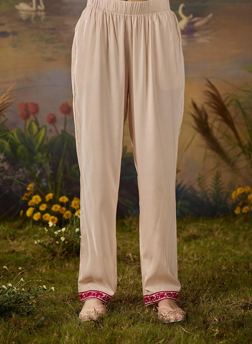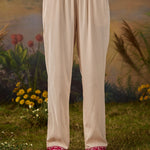 • Solid cream straight bottoms with lace-detailed hem, mid-rise elastic waist, and pockets
