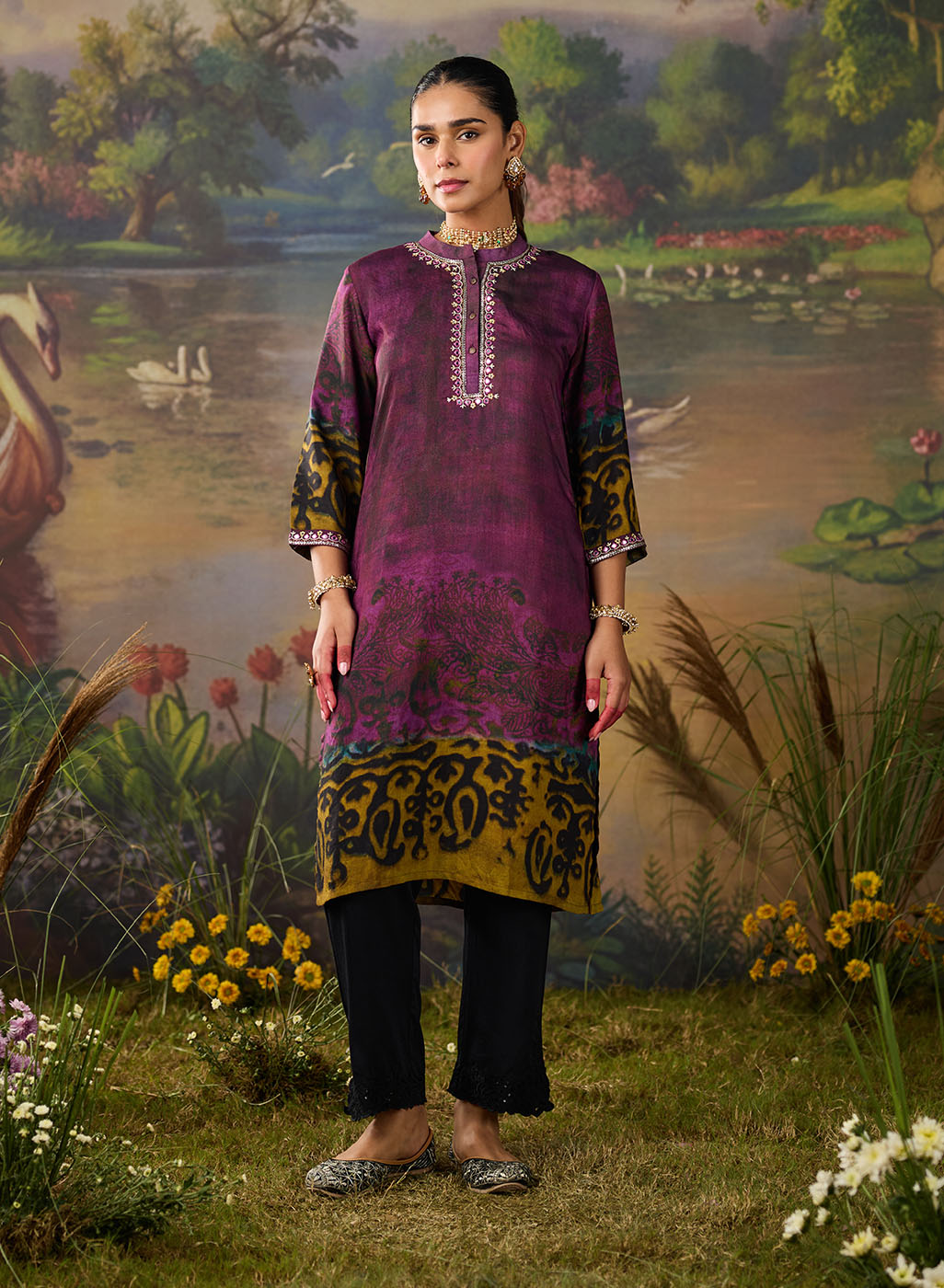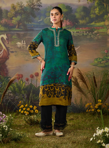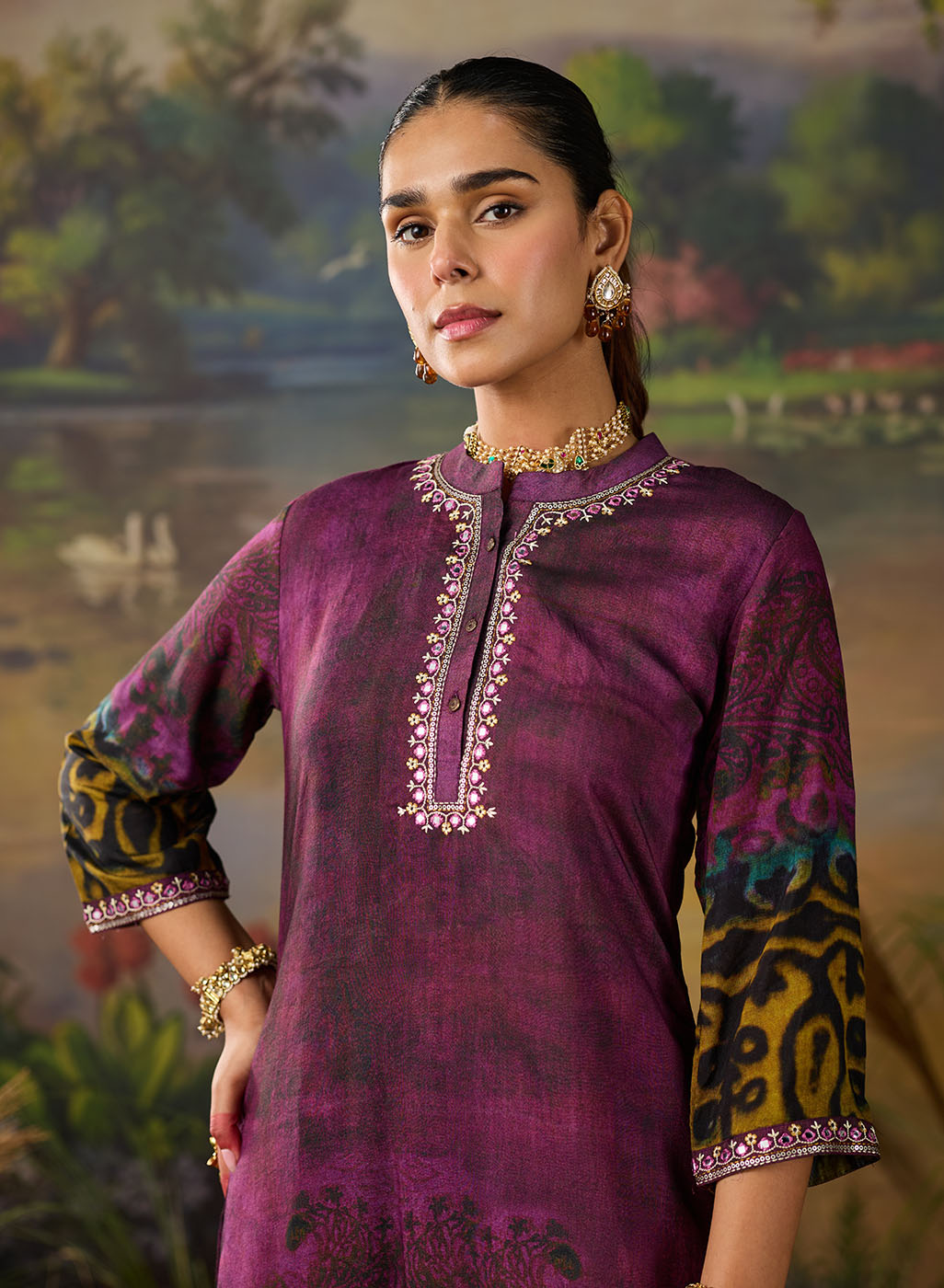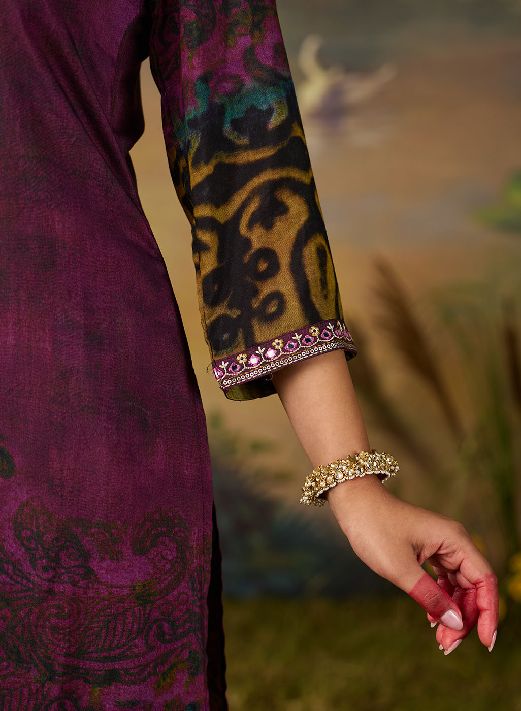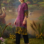Effortlessly chic and full of character, this dual-tone violet printed kurta brings a fresh twist to everyday ethnic wear. The deep violet and plum undertones create a rich canvas for the abstract, nature-inspired print. Finished with delicate resham embroidery on the neckline and sleeves, this printed kurta brings just the right amount of detail without being over the top.
