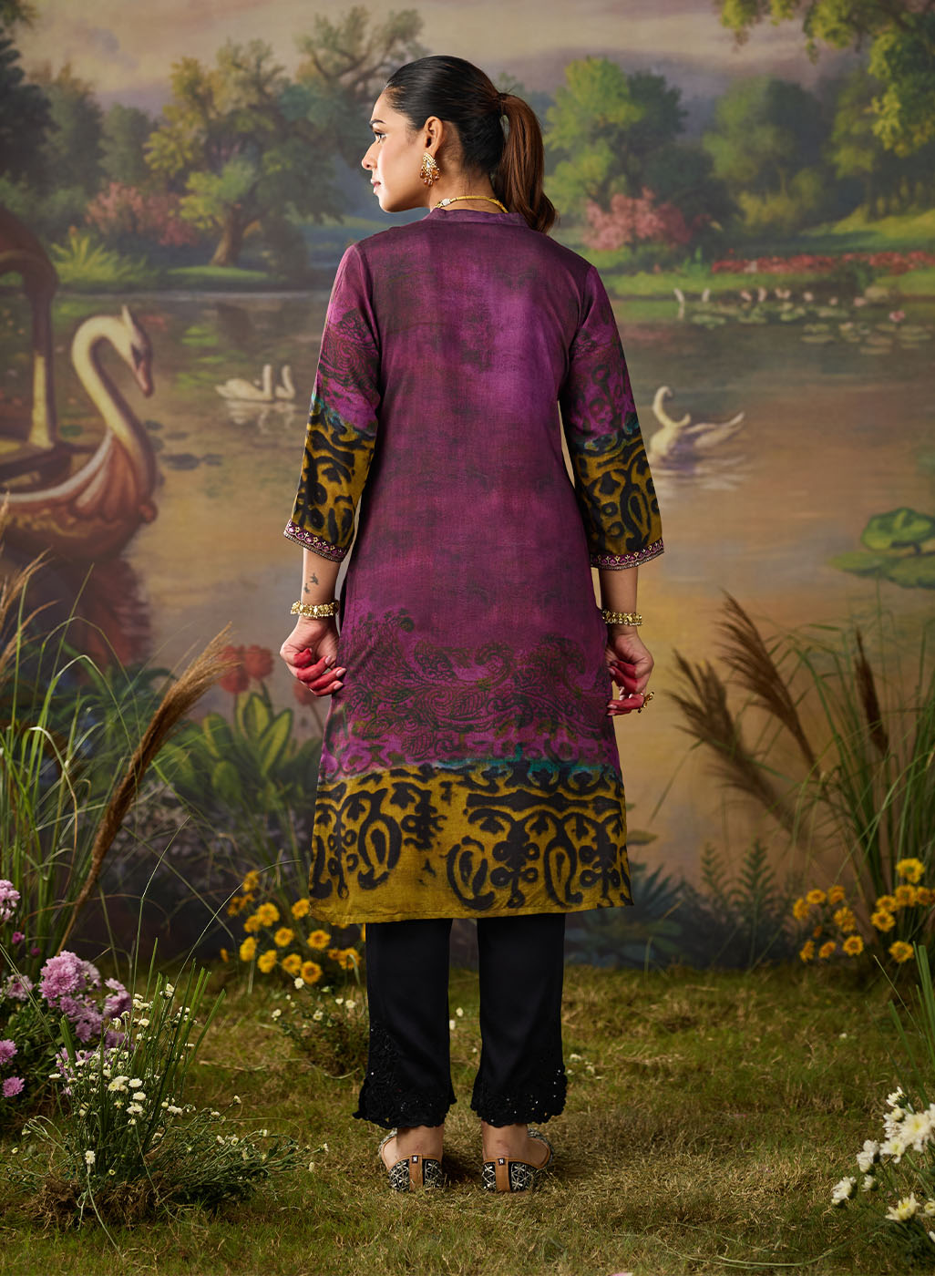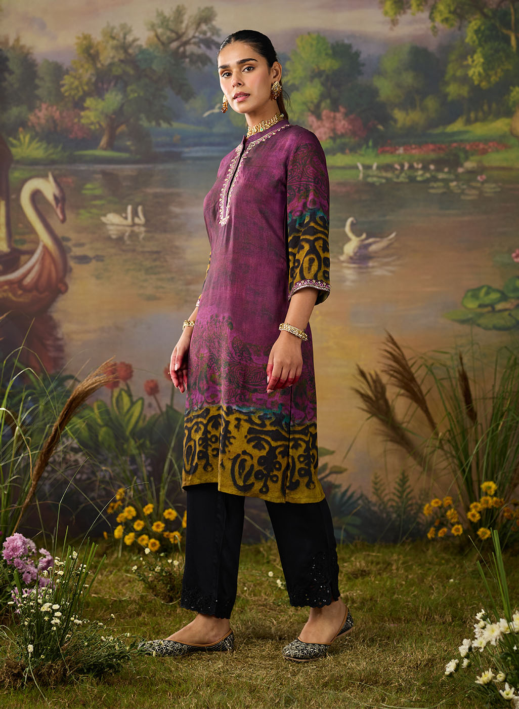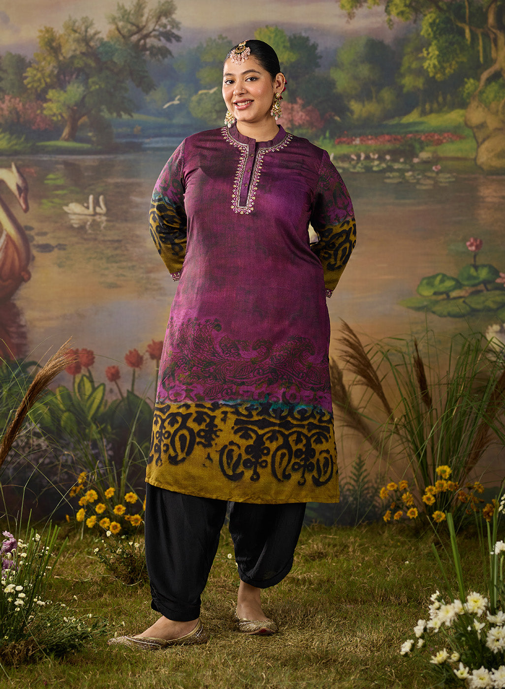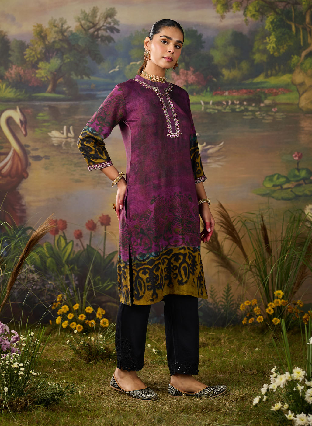 Effortlessly chic and full of character, this dual-tone violet printed kurta brings a fresh twist to everyday ethnic wear. The deep violet and plum undertones create a rich canvas for the abstract, nature-inspired print. Finished with delicate resham embroidery on the neckline and sleeves, this printed kurta brings just the right amount of detail without being over the top.