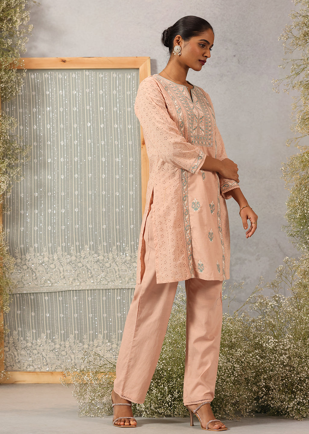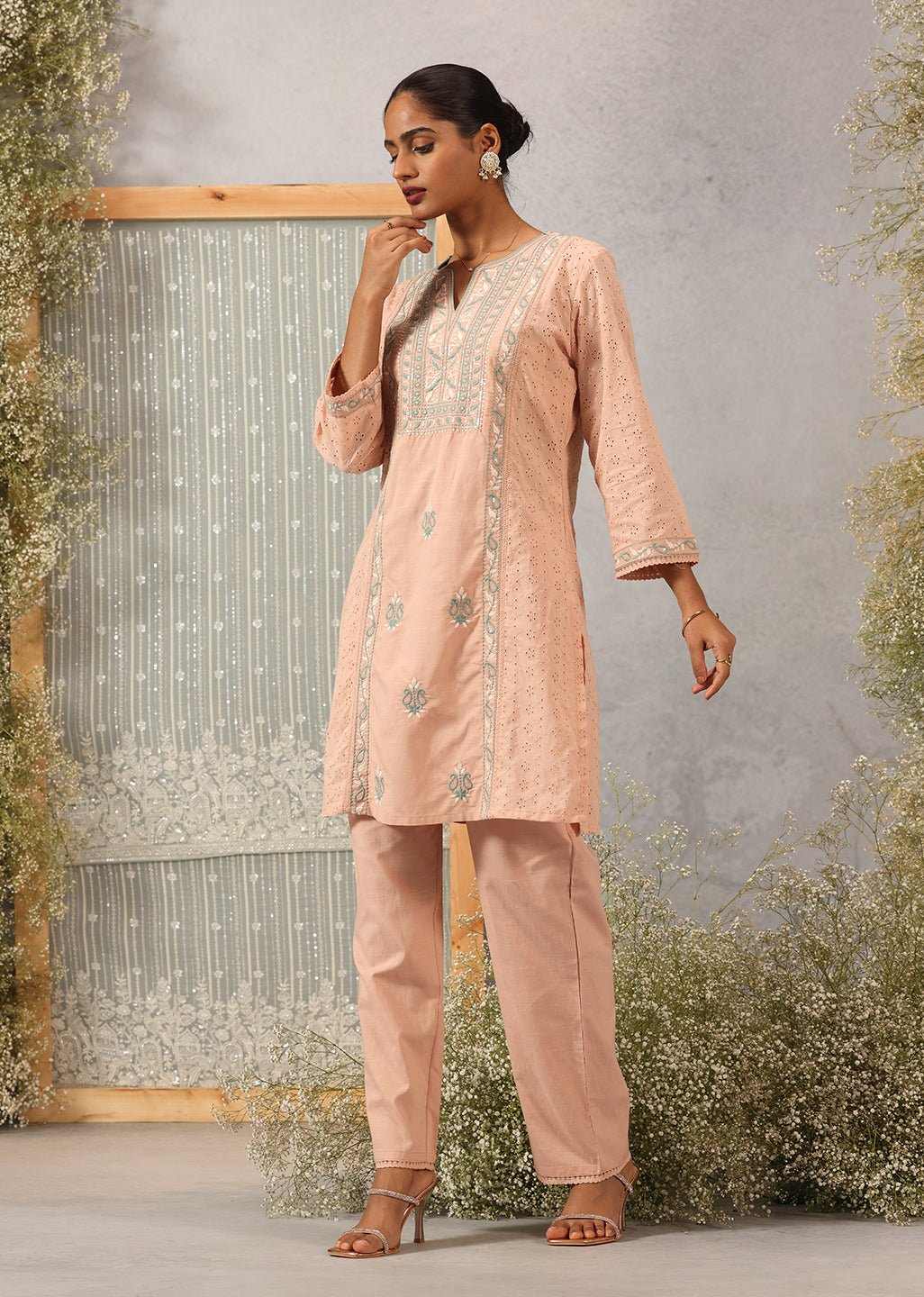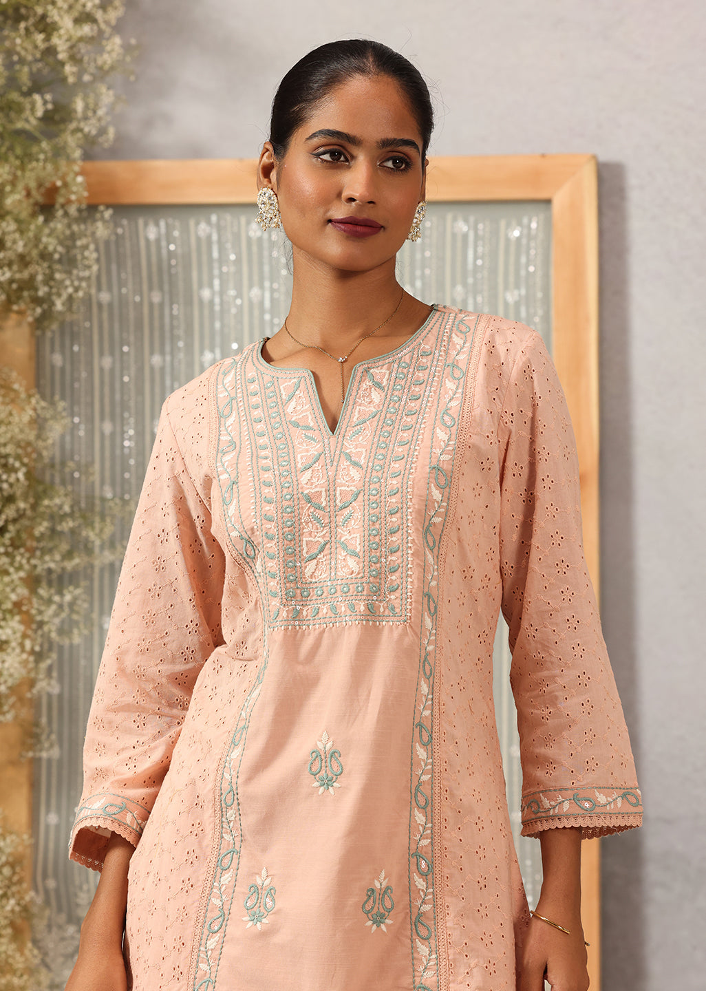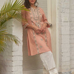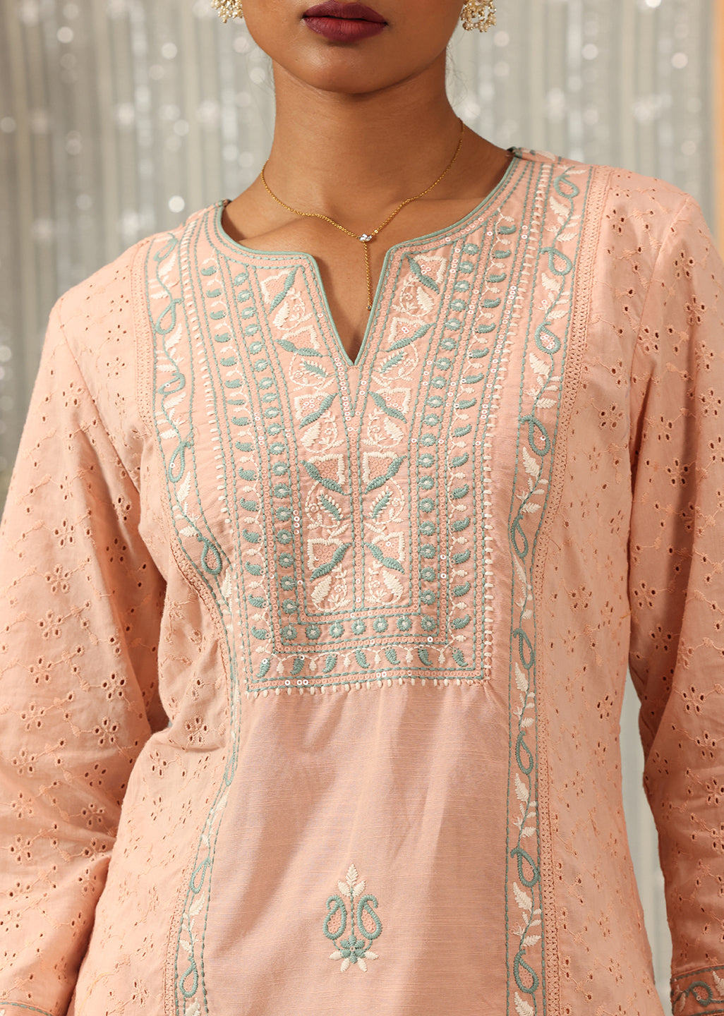 Amp up your style game with this peach embroidered kurta by Lakshita featuring a solid base with laid-out floral & paisley embroidered panels at the neckline and bodice. Crafted with the finest material, pair this kurta with a pair of off white palazzos  or jeans for a casual or semi-formal look.