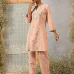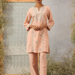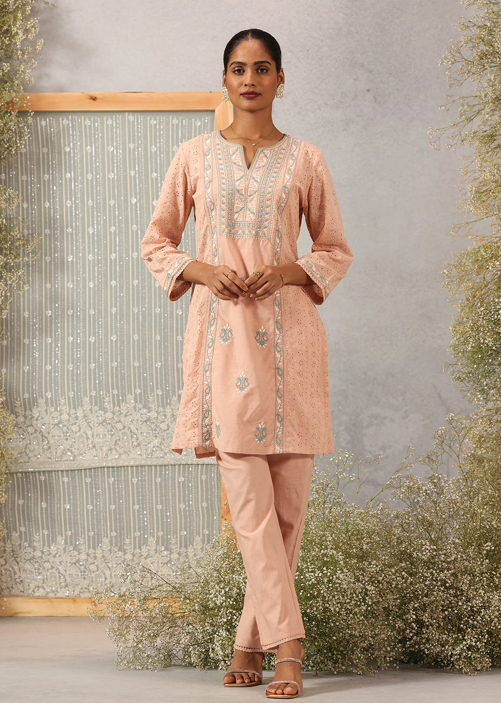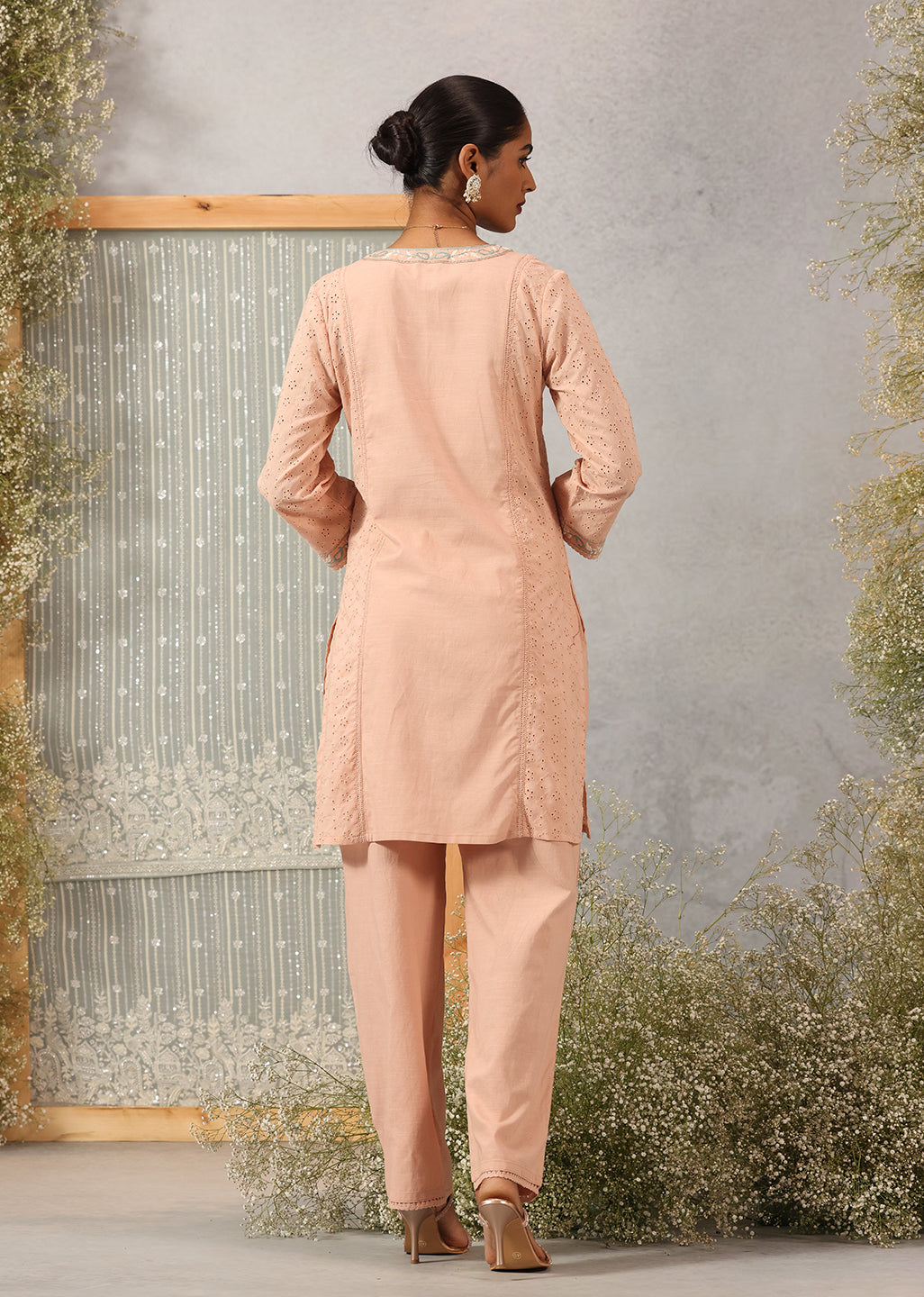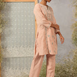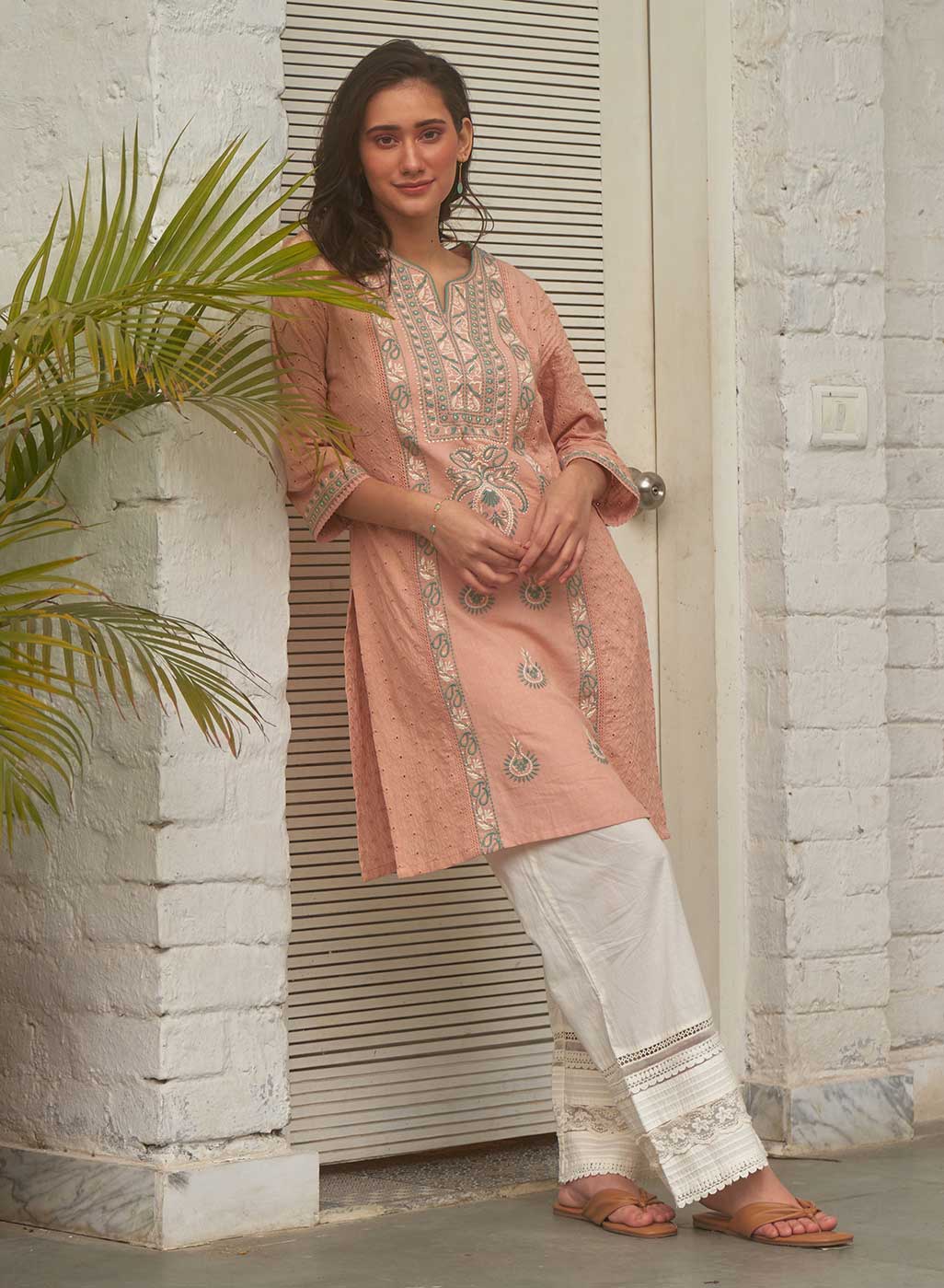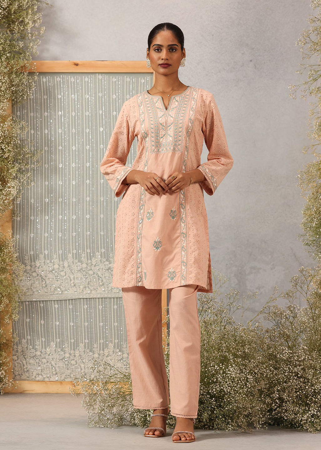 Amp up your style game with this peach embroidered kurta by Lakshita featuring a solid base with laid-out floral & paisley embroidered panels at the neckline and bodice. Crafted with the finest material, pair this kurta with a pair of off white palazzos  or jeans for a casual or semi-formal look.