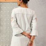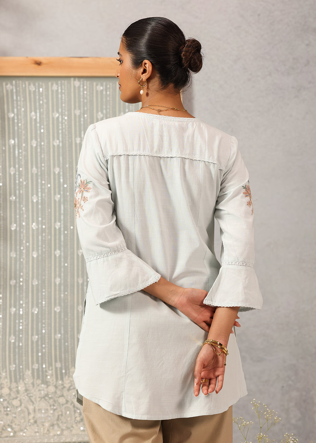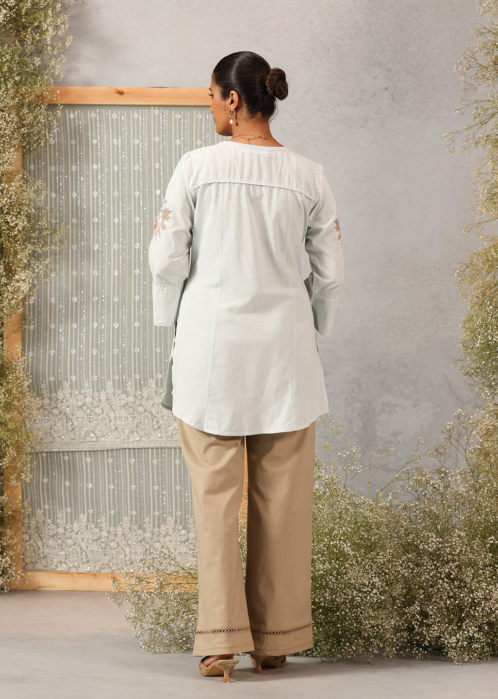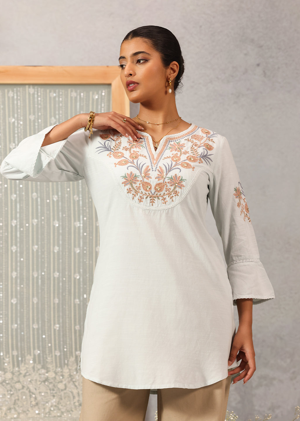 Get ready to exude some main-character vibes with this lovely spa-coloured cotton embroidered tunic. Dipped in a soothing shade, this embellished tunic defines what desi and chic elements look like when combined together. Complete the look with matching palazzos and oxidized jewellery.