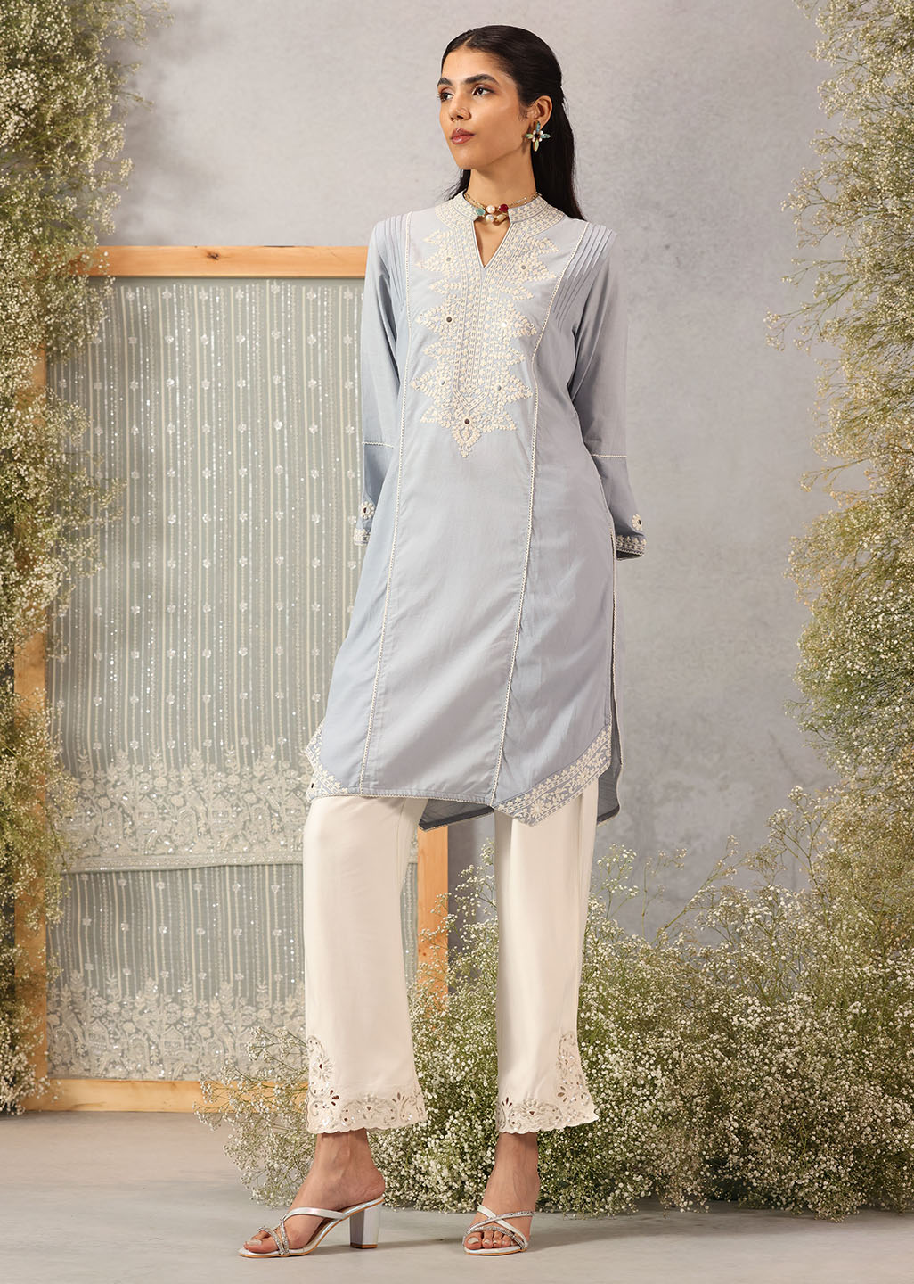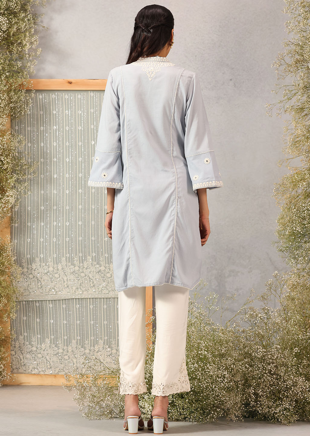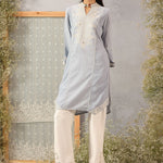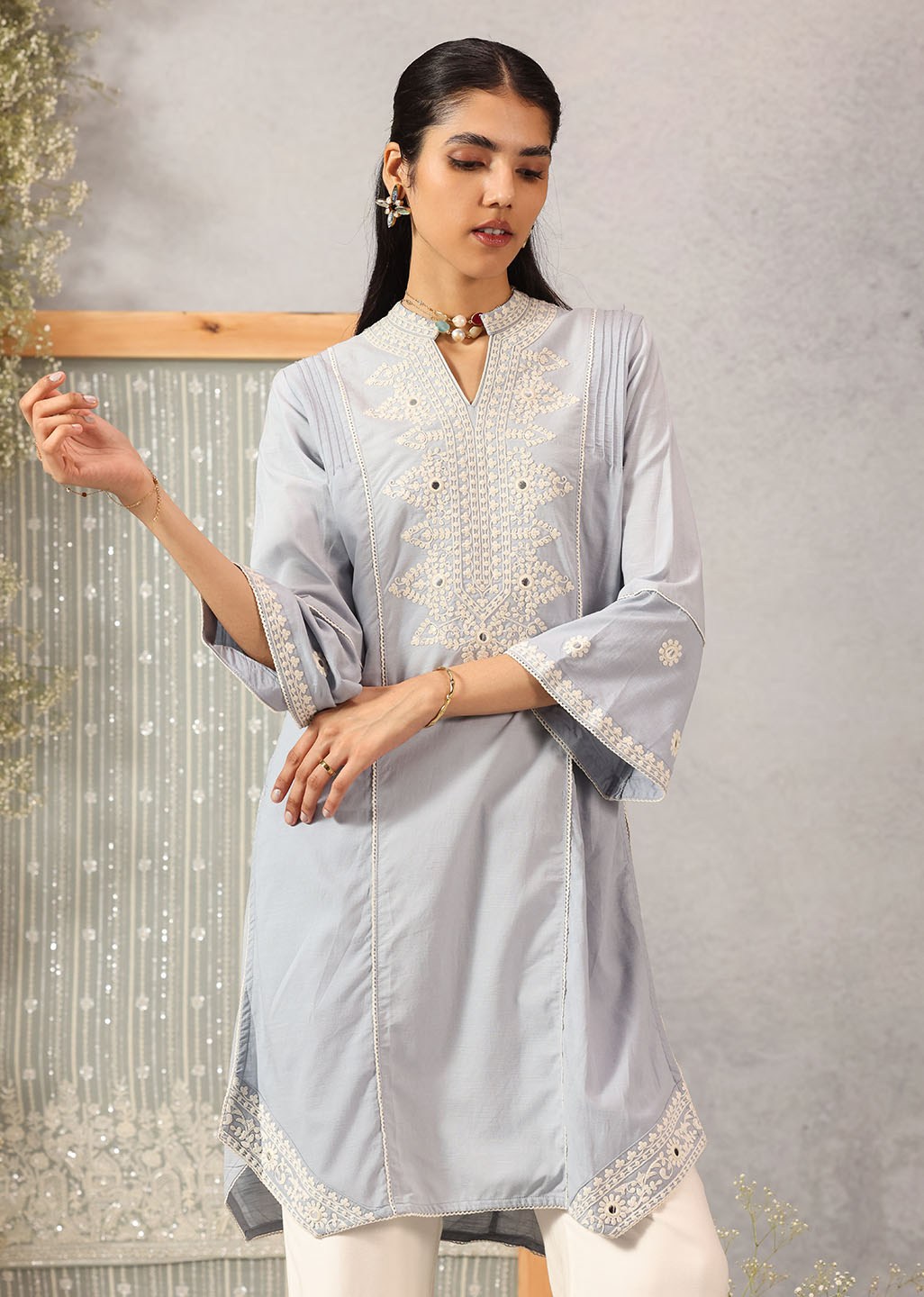 Spa Blue Mid-length Cotton Kurti for Women with Embroidery