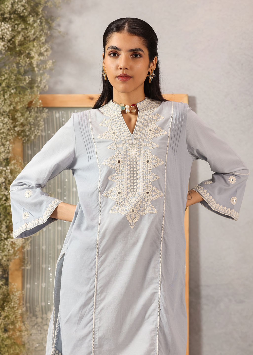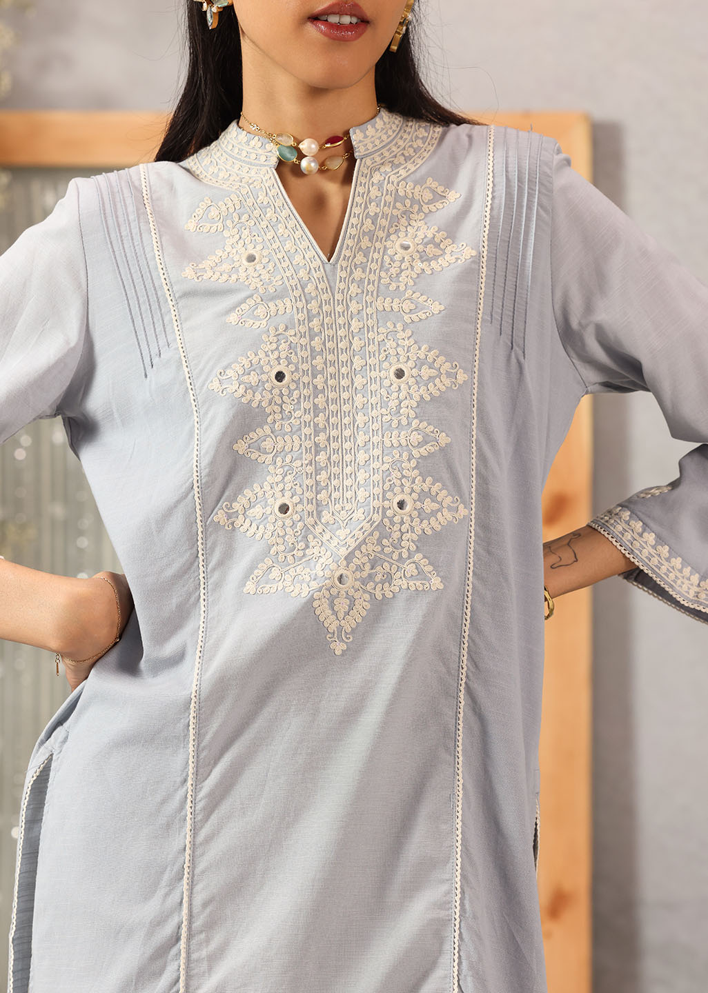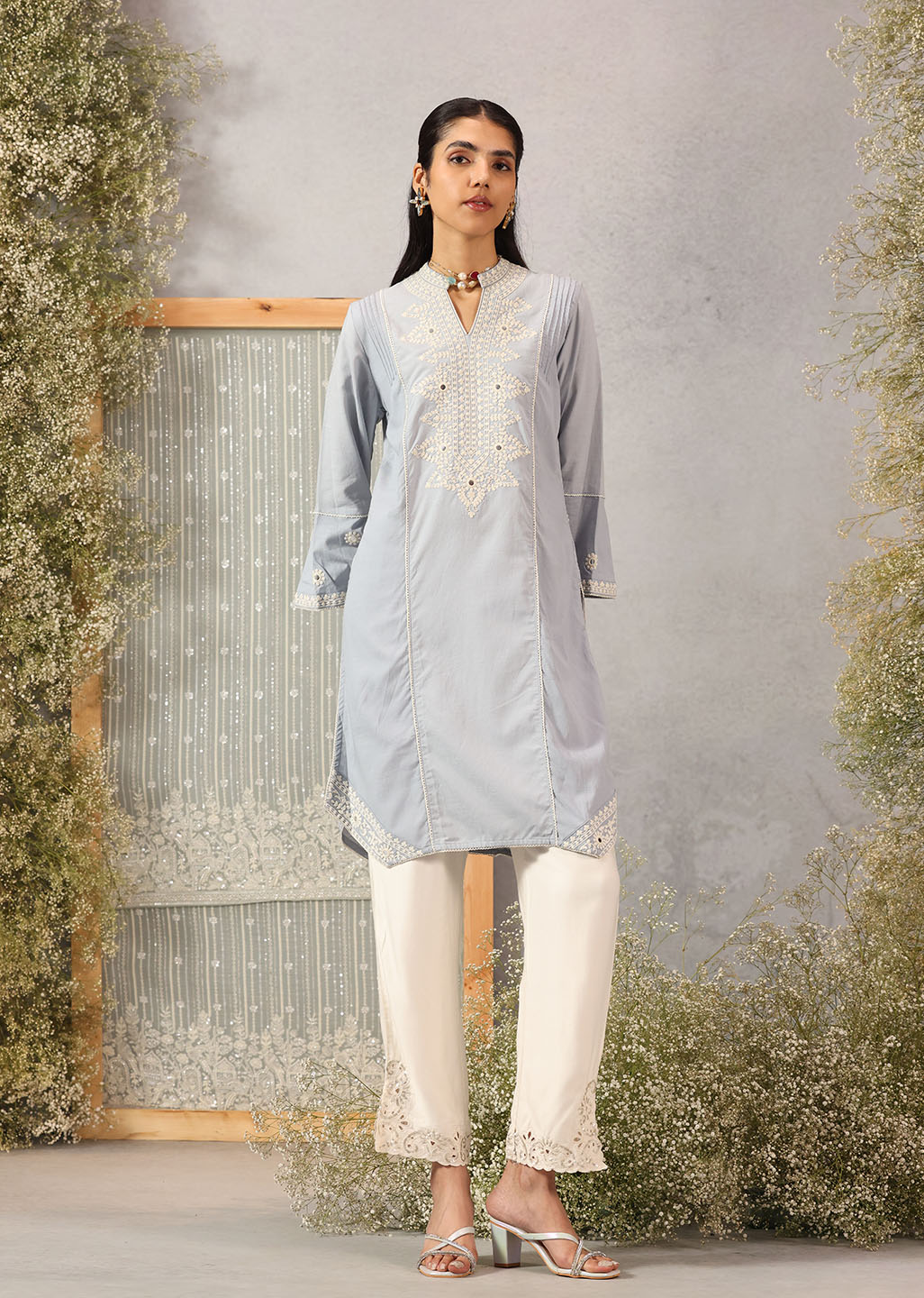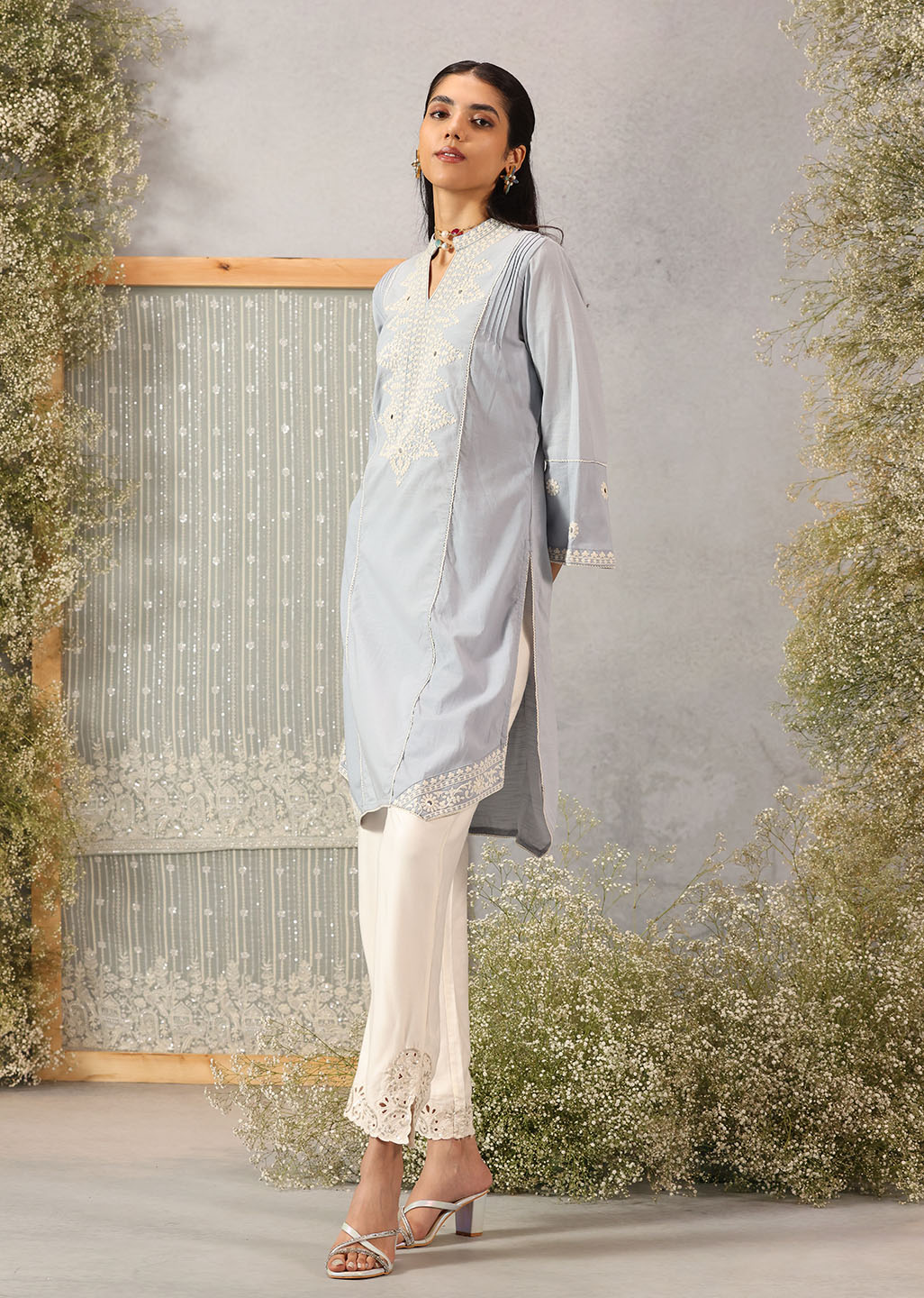 Spa Blue Mid-length Cotton Kurti for Women with Embroidery