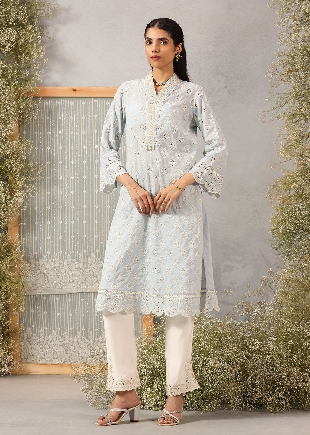 D.Teal Kurta Set With Intricate Embroidery & Front Slit