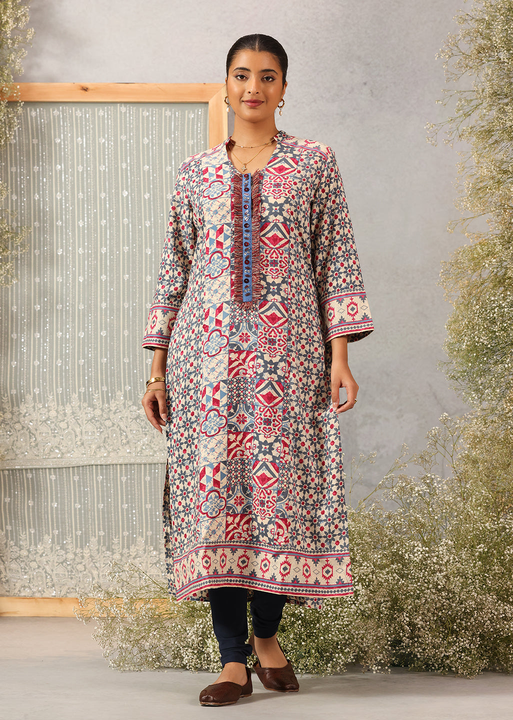 Teal Floral Print Dhaage Collection Kurta With Embroidery
