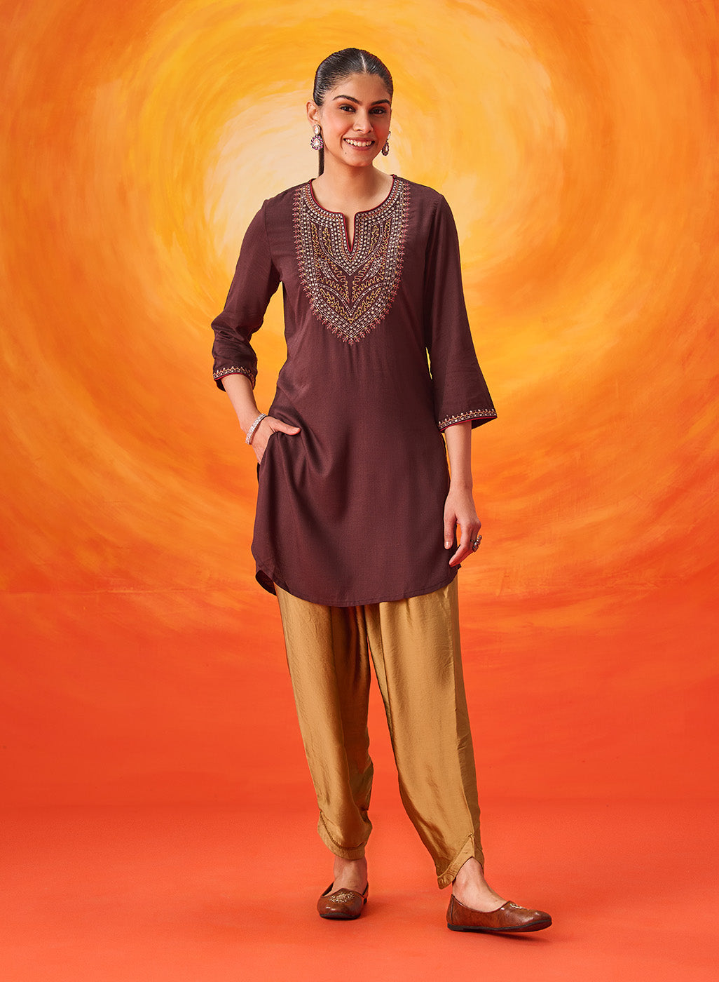 Brown Embroidered Dobby Rayon Kurti