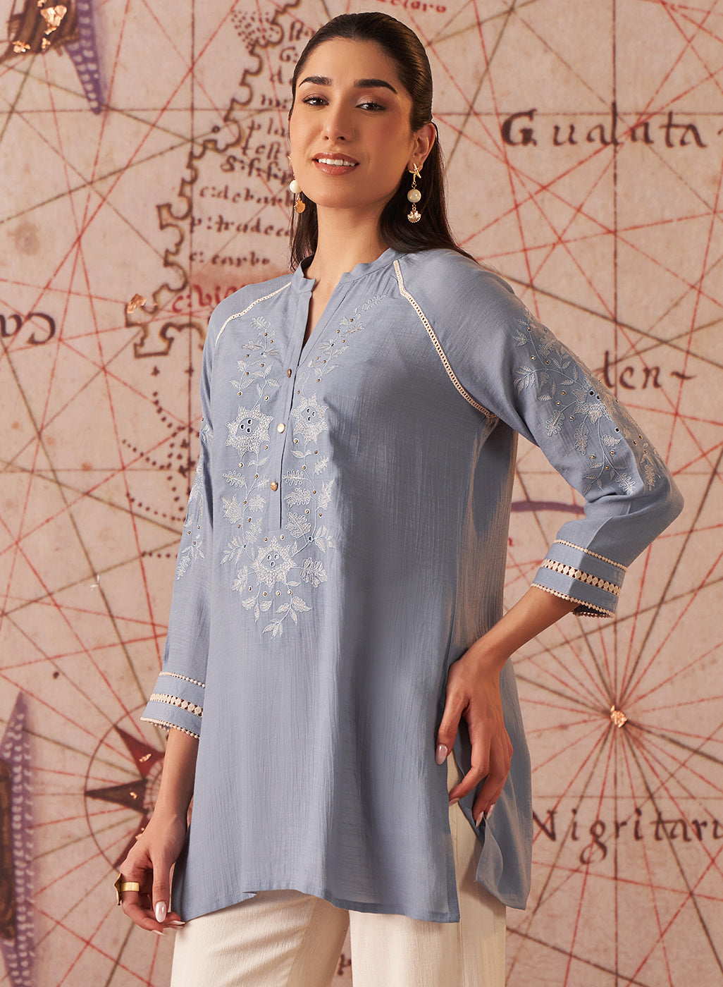 Ophelia Smokey Blue Embroidered Schiffli Cotton Top for Women