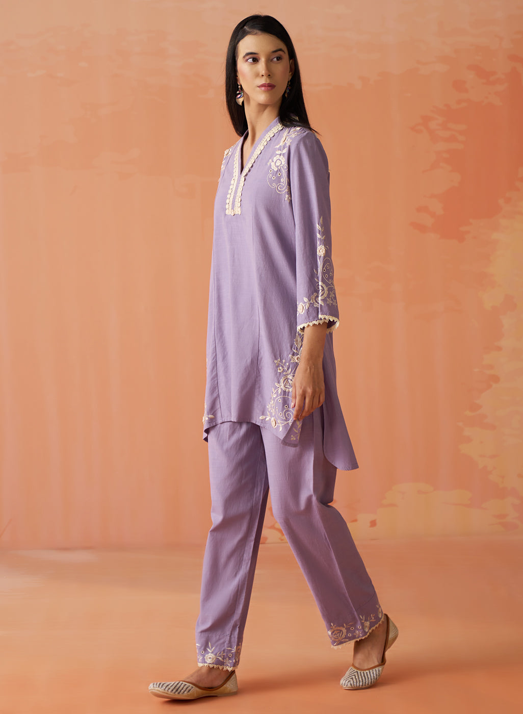 Aira Lavender Embroidered Cotton Linen Co-ord Set for Women