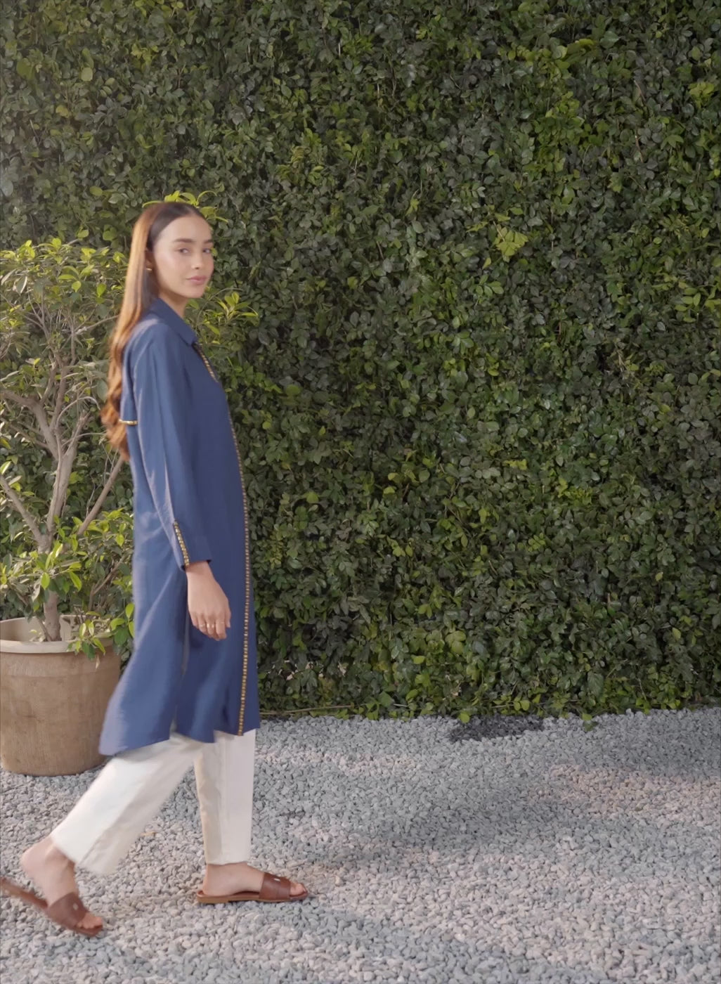 Mustard Embroidered Rayon Slub Kurta - Mid