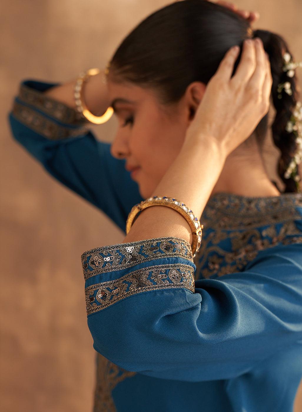 Let ethereal style be your saviour this festive season as you doll up in this vibrant teal kurta set from the house of Lakshita. Mixing heavy embroidery with intricate sequin details all the way down the front, the straight kurta is paired with matching straight pants. Add a pair of juttis and a sequinned dupatta to complement the ethnic styling.