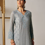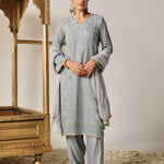 An ode to understated opulence, this powder-blue suit set blends delicate textures with effortless grace. The kurta’s intricate jaal work front panel, soft scalloped details, and subtle sheen create a look that feels refined yet quietly festive. Finished with a fluid dupatta and relaxed salwar-style bottoms, the set moves with elegance—perfect for intimate celebrations where sophistication speaks softly but beautifully.