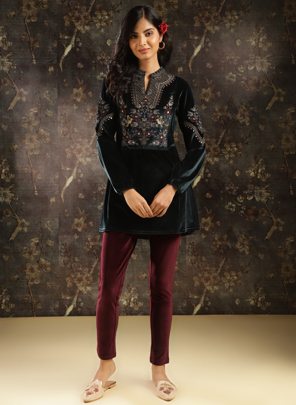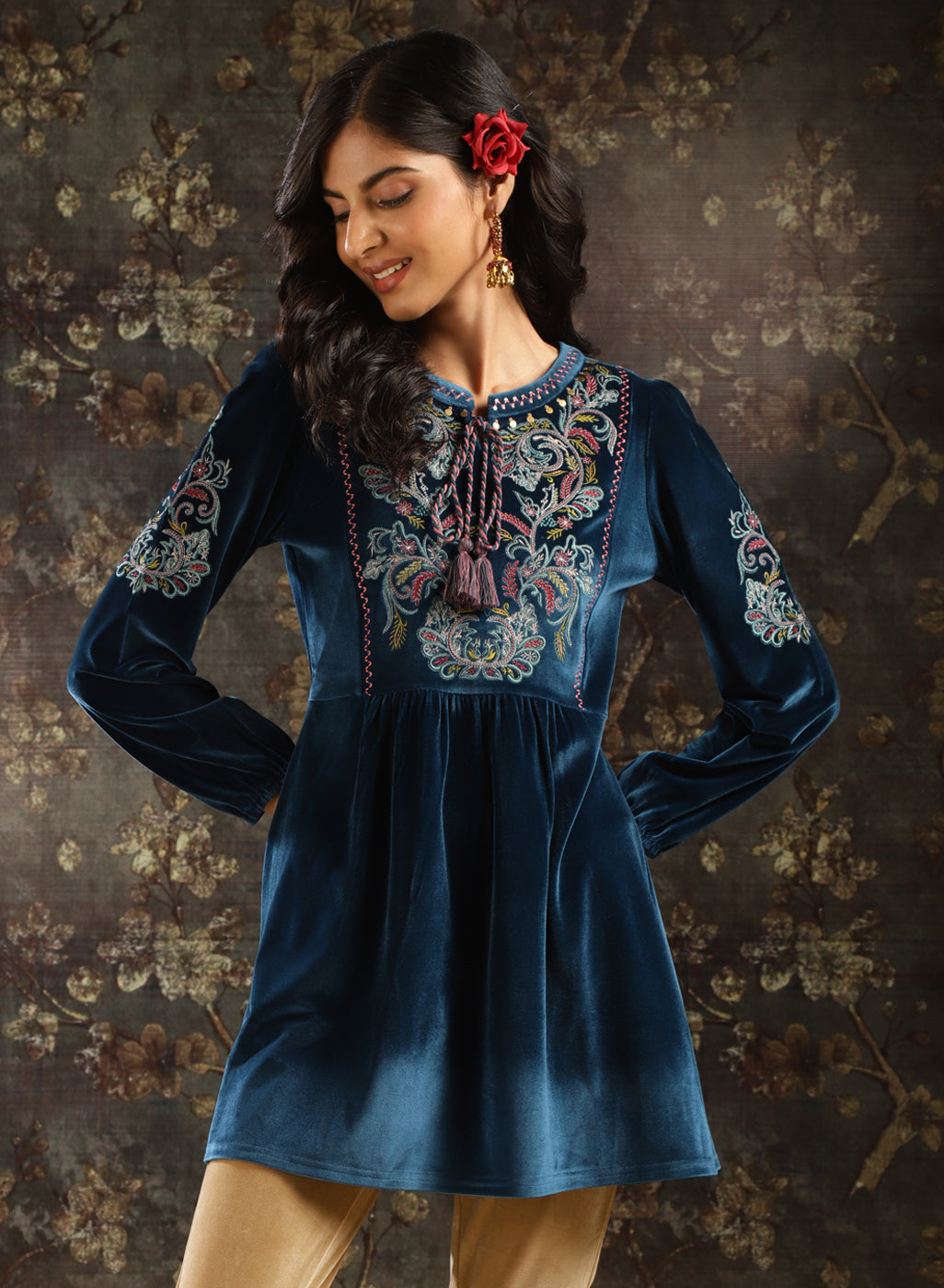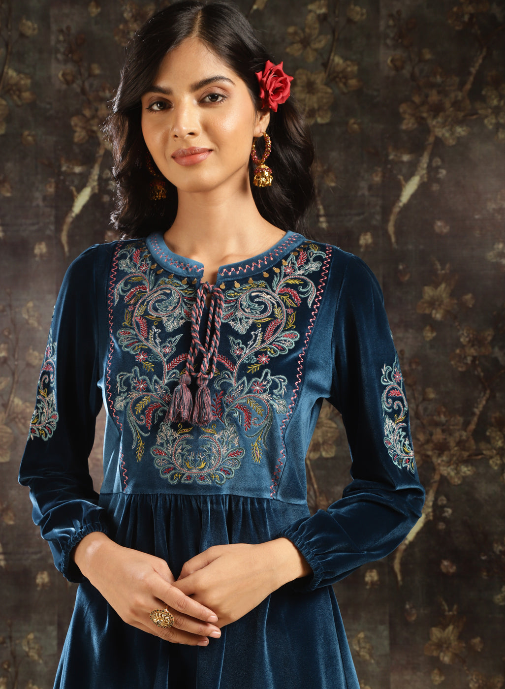 Navy Blue Velvet Kurta with Fine Mirror Beads Work