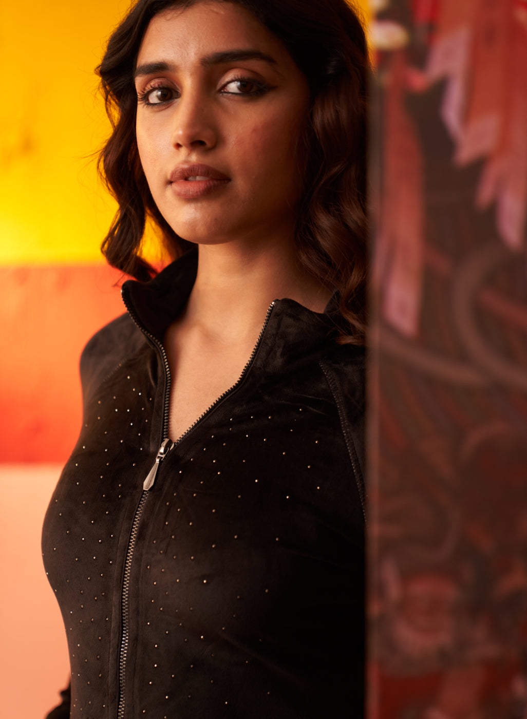 Charcoal Black Velvet Kurta Set With Heavy Front Yoke Zari Embroidery