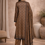 Full front view of Brown Ethnic Printed Velvet 3 Piece Kurta Set