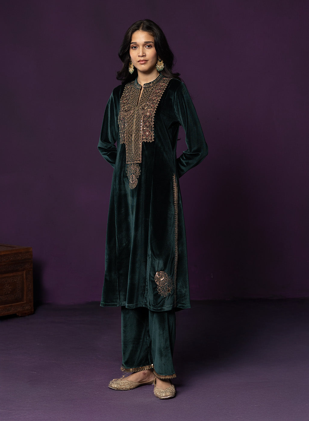 Purple Embellished Ethnic Marble Print Velvet Kurta Set