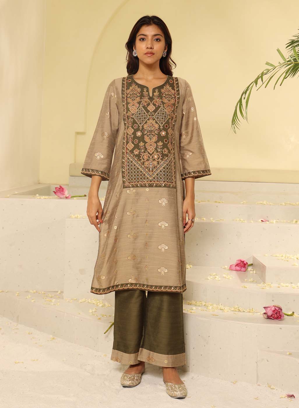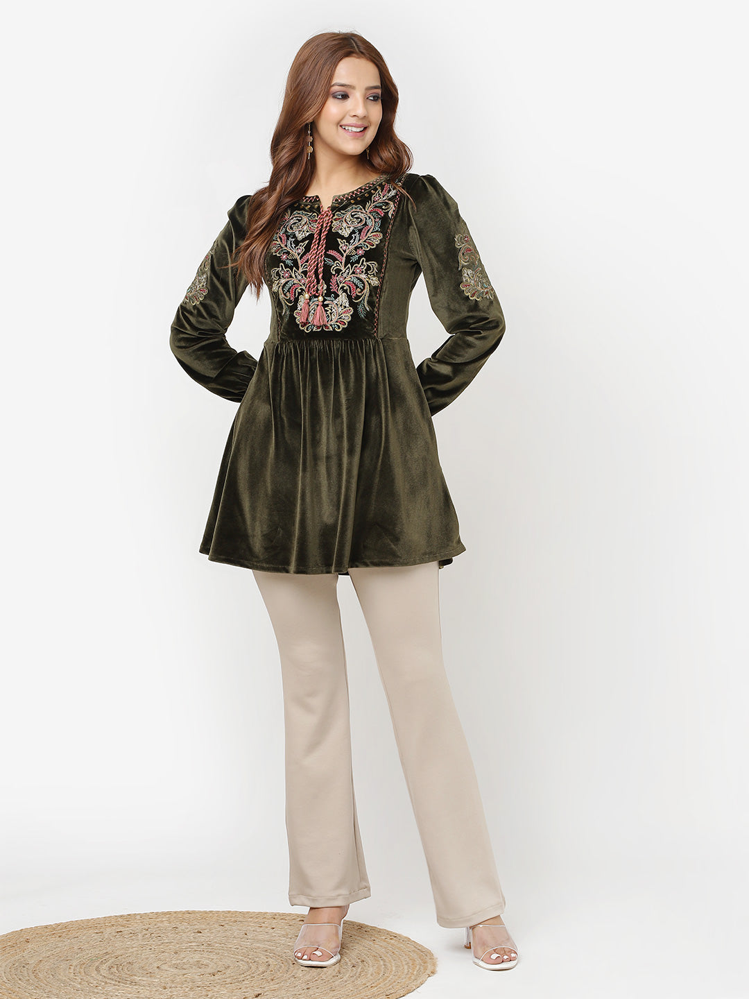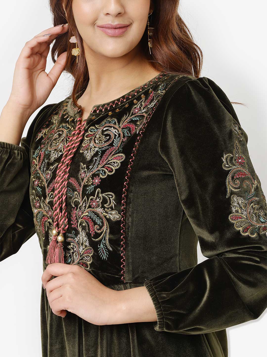Green Printed Velvet Kurta Set with Brass Work and Zari Work