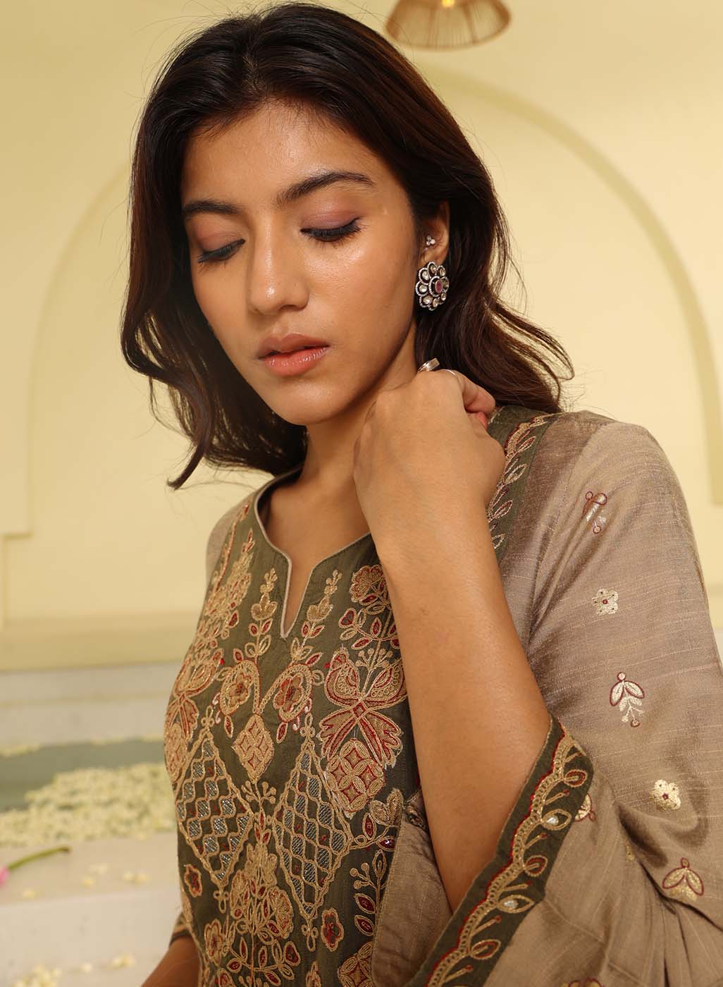Fern Green Printed Woollen Kurta Set with Zari Work and Stone Work