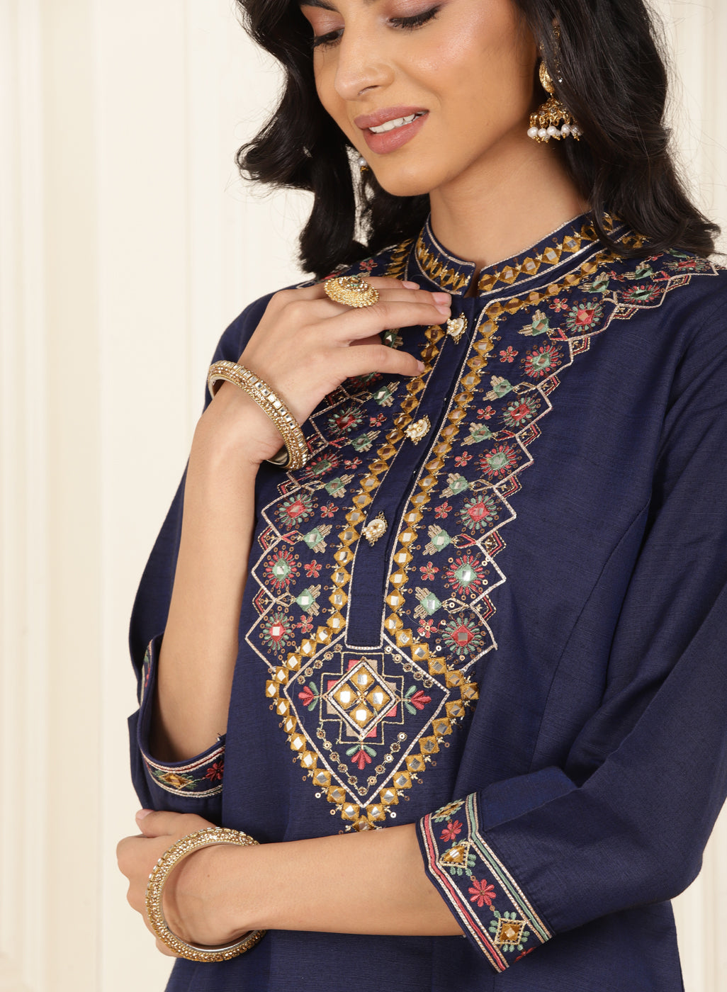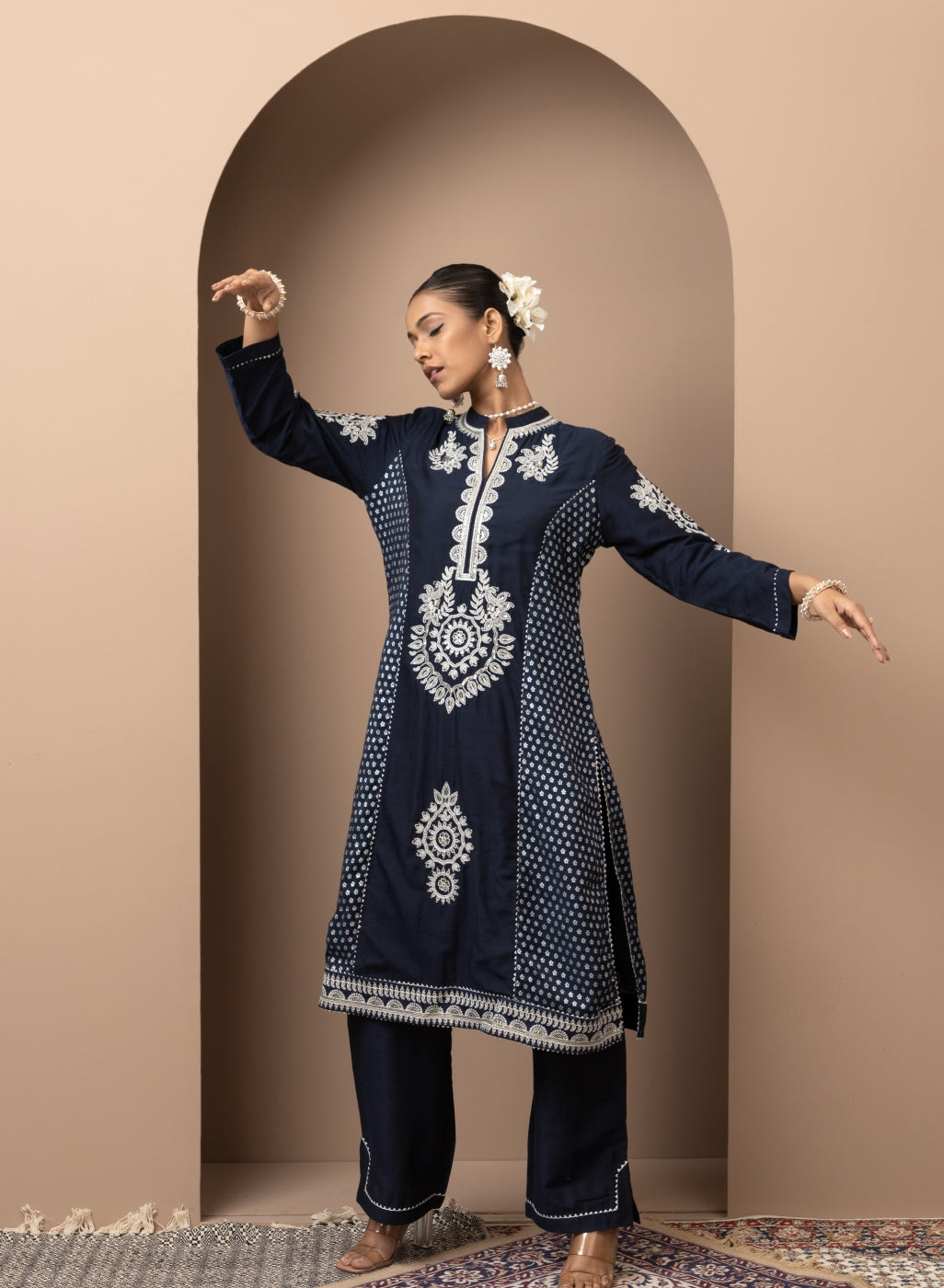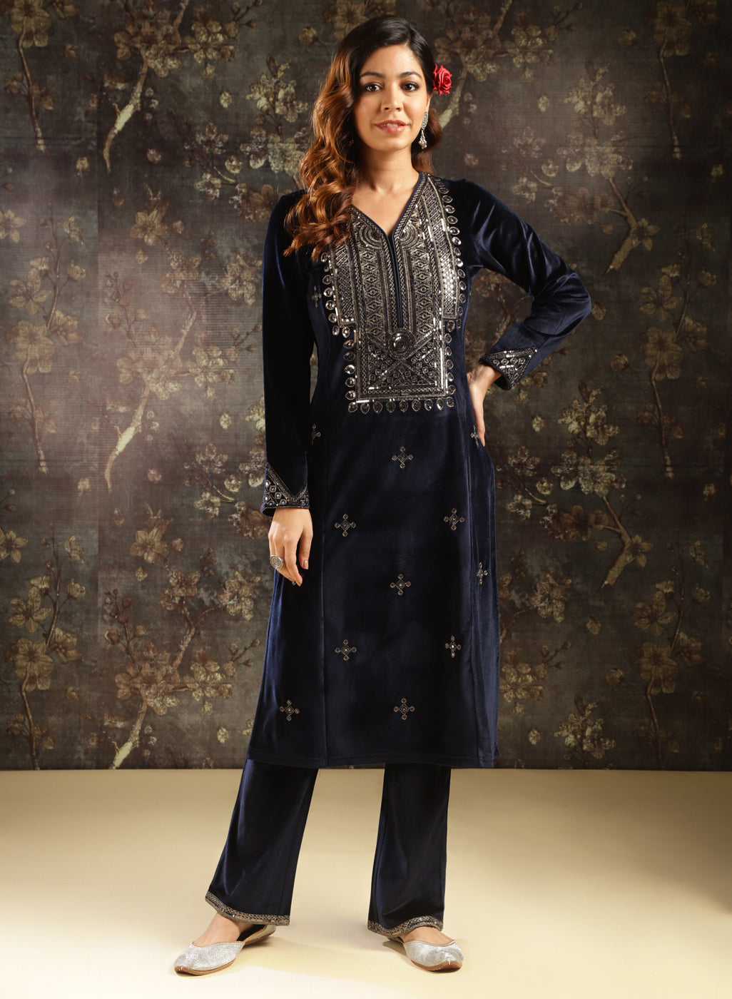 Navy Blue Embroidered Velvet Kurta Set for Women