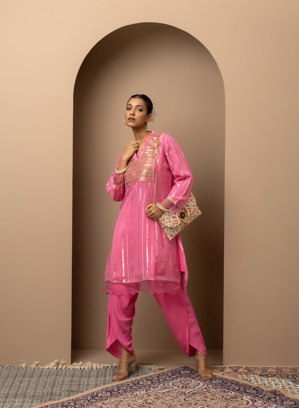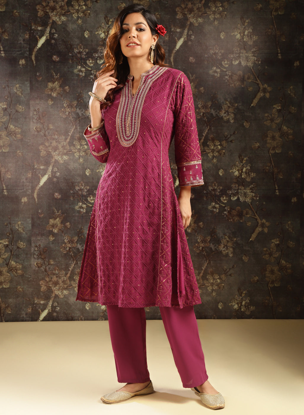 Fuchsia Printed Velvet Kurta Set with Brass Work and Zari Work