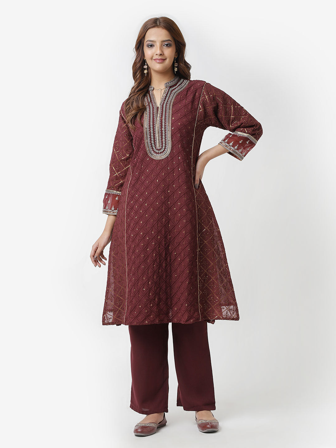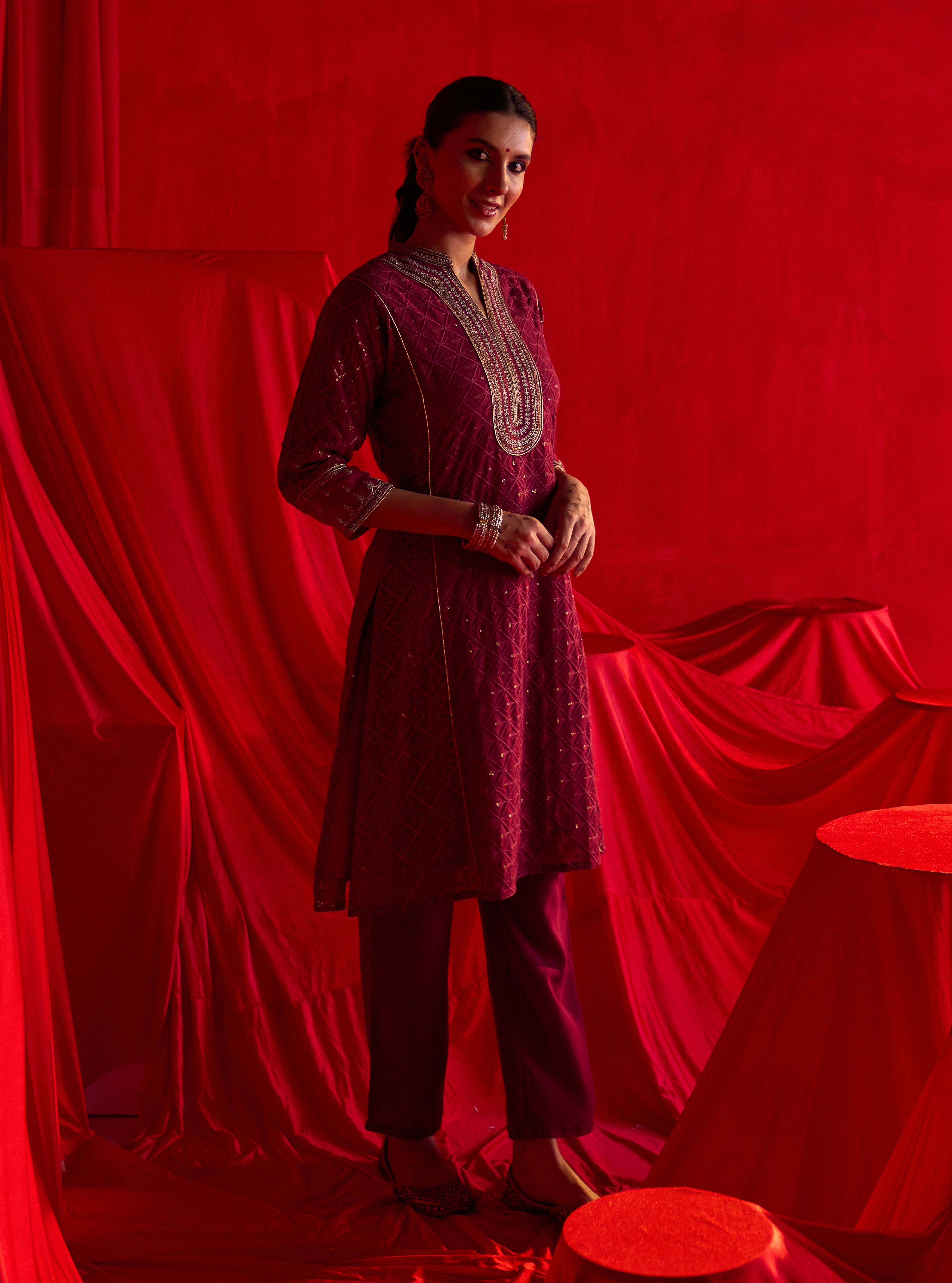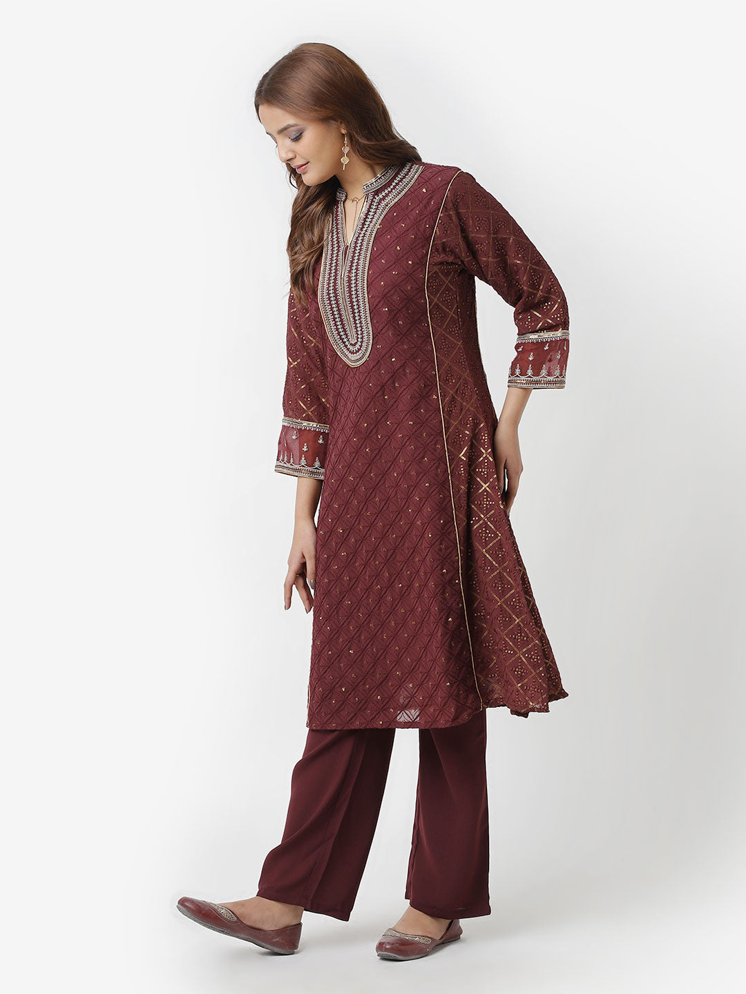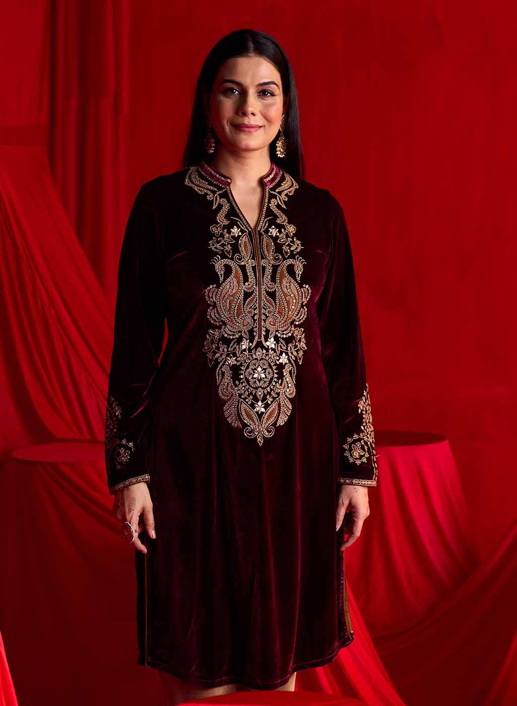 Maroon Women’s Woollen Kurti with Embroidered Yoke and Button Detailing on Cuffs