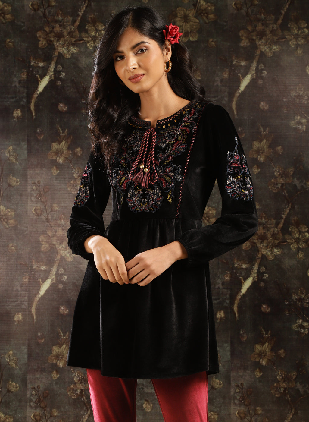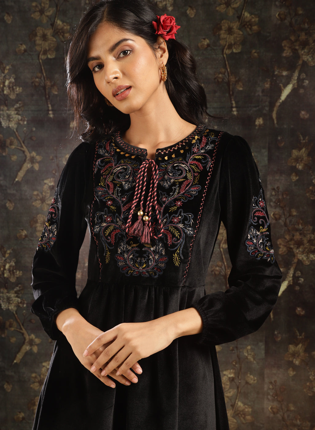 Black Women’s Woollen Kurti with Embroidered Yoke and Button Detailing on Cuffs