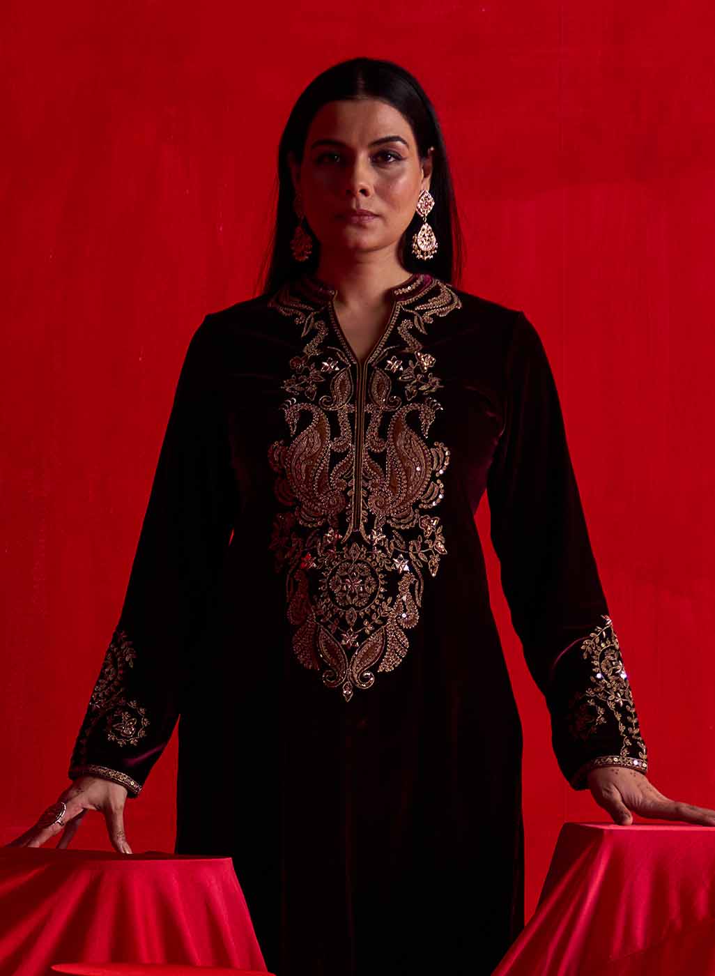 Black Printed Velvet Kurta Set with Brass Work and Zari Work