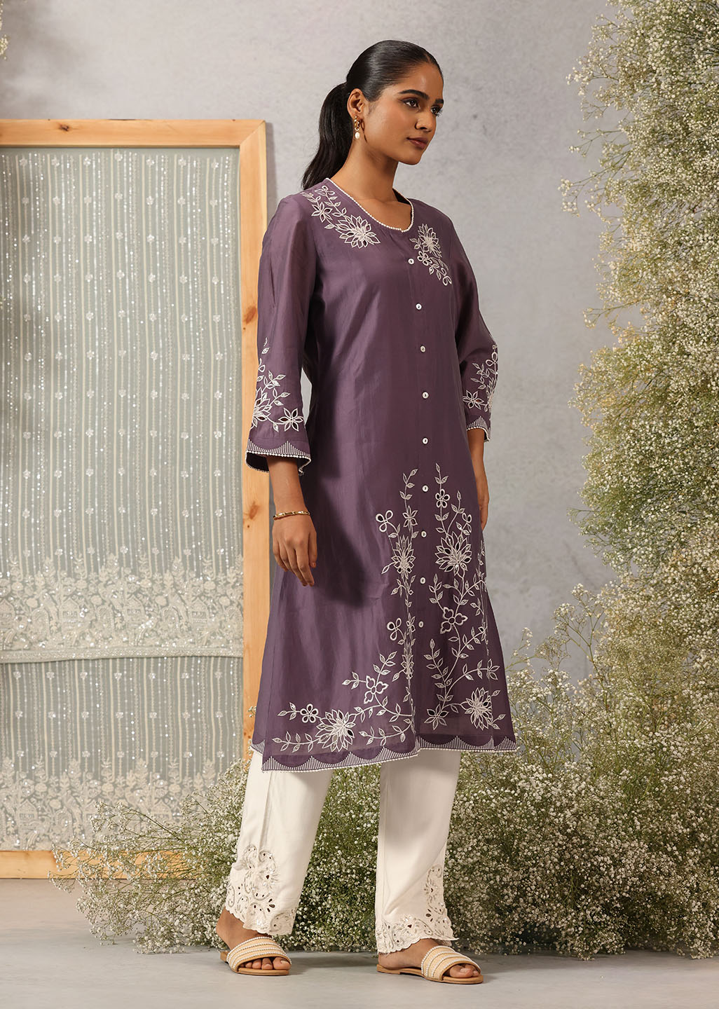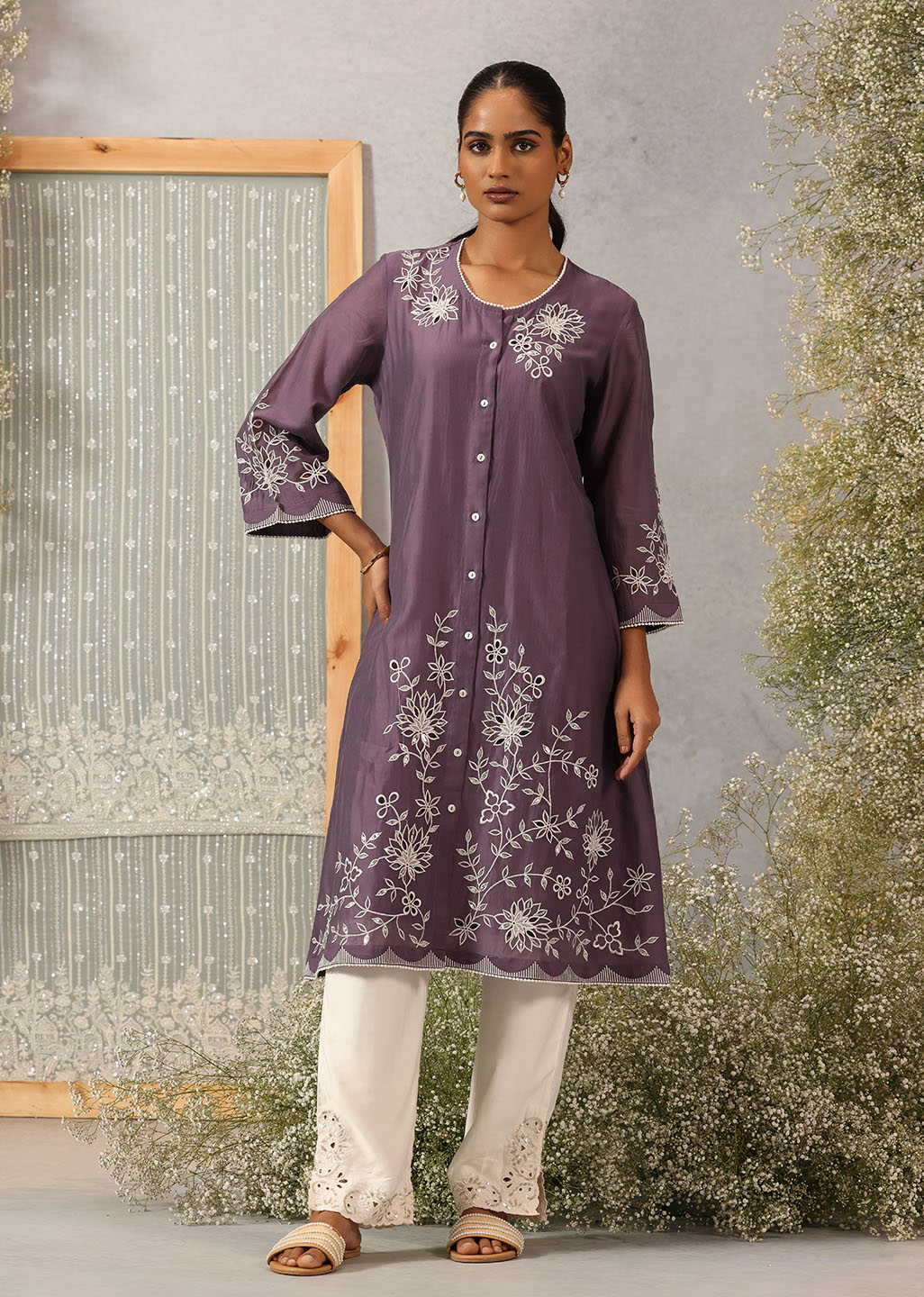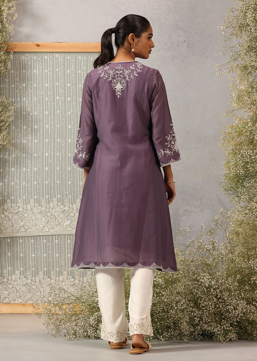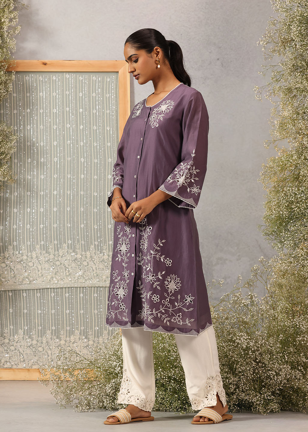 This purple-hued kurta embodies softness and serenity. The A-line silhouette drapes gently, while the floral silk threadwork unfurls across the neckline, sleeves, hem, and back with graceful artistry. Scuplted cutwork, shimmering accents, and delicate lace edging bring a whisper of celebration to its tranquil palette, making it an elegant choice for both day and dusk.
