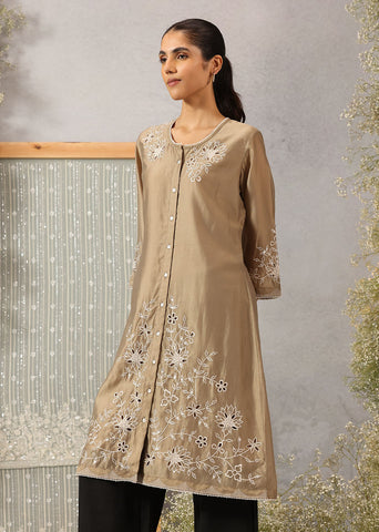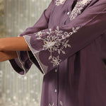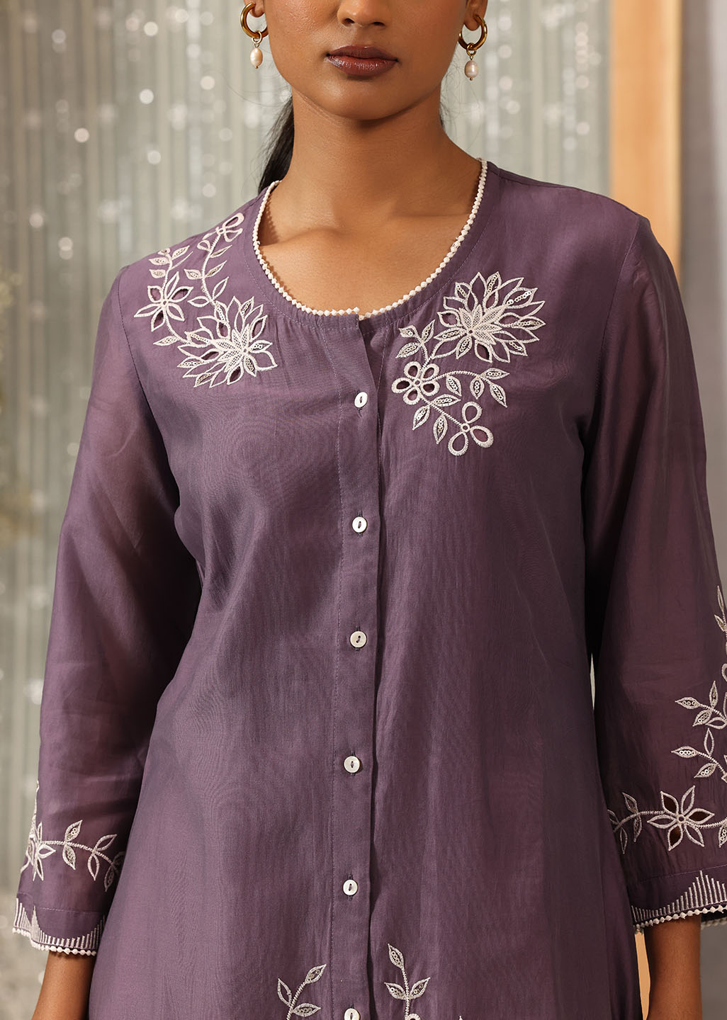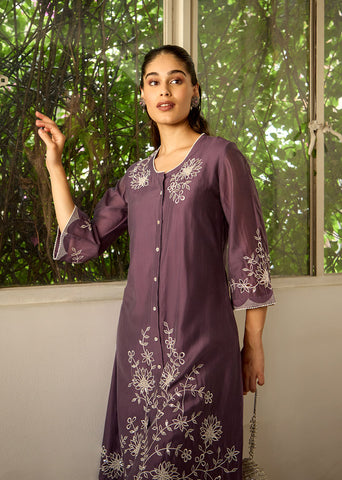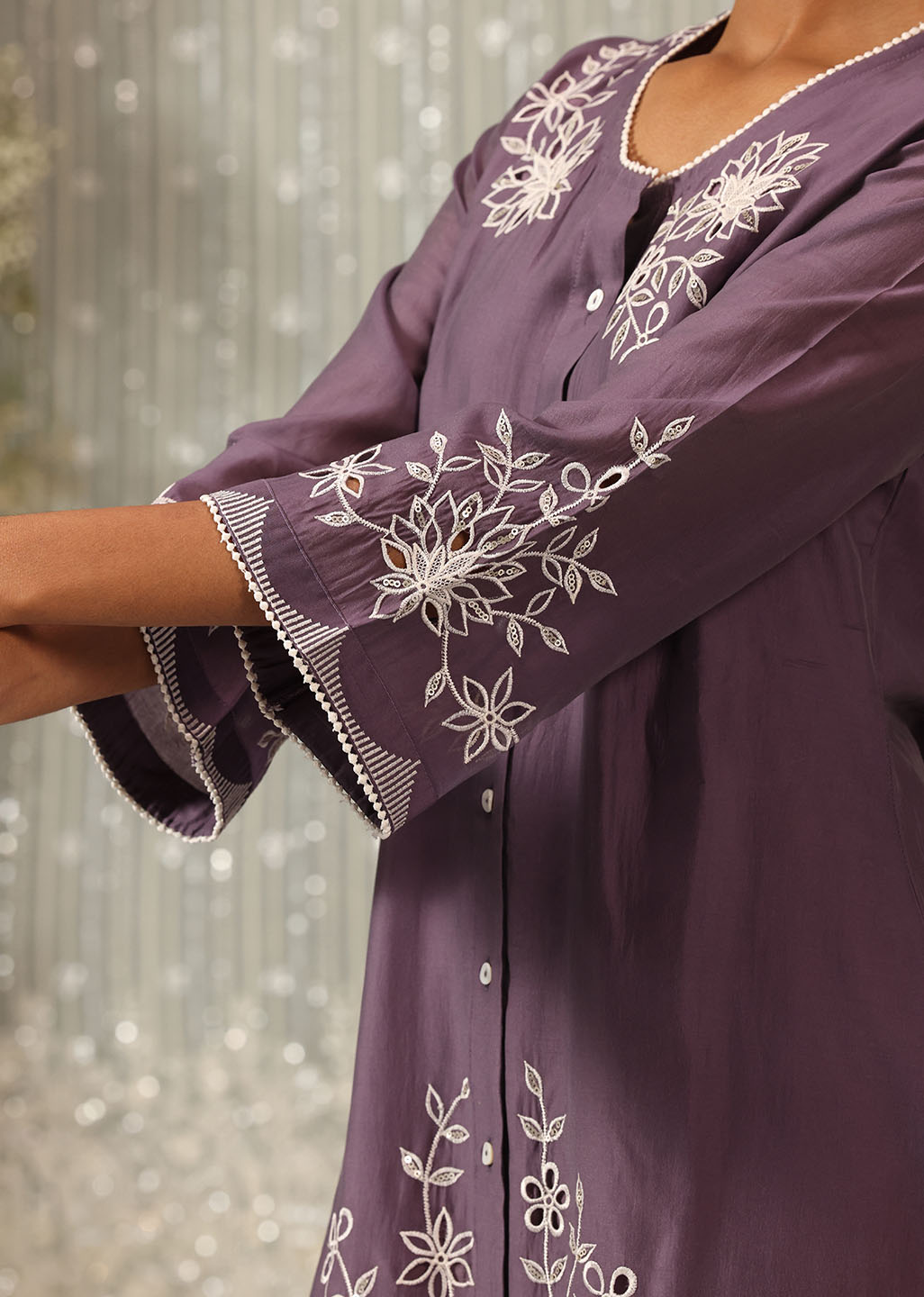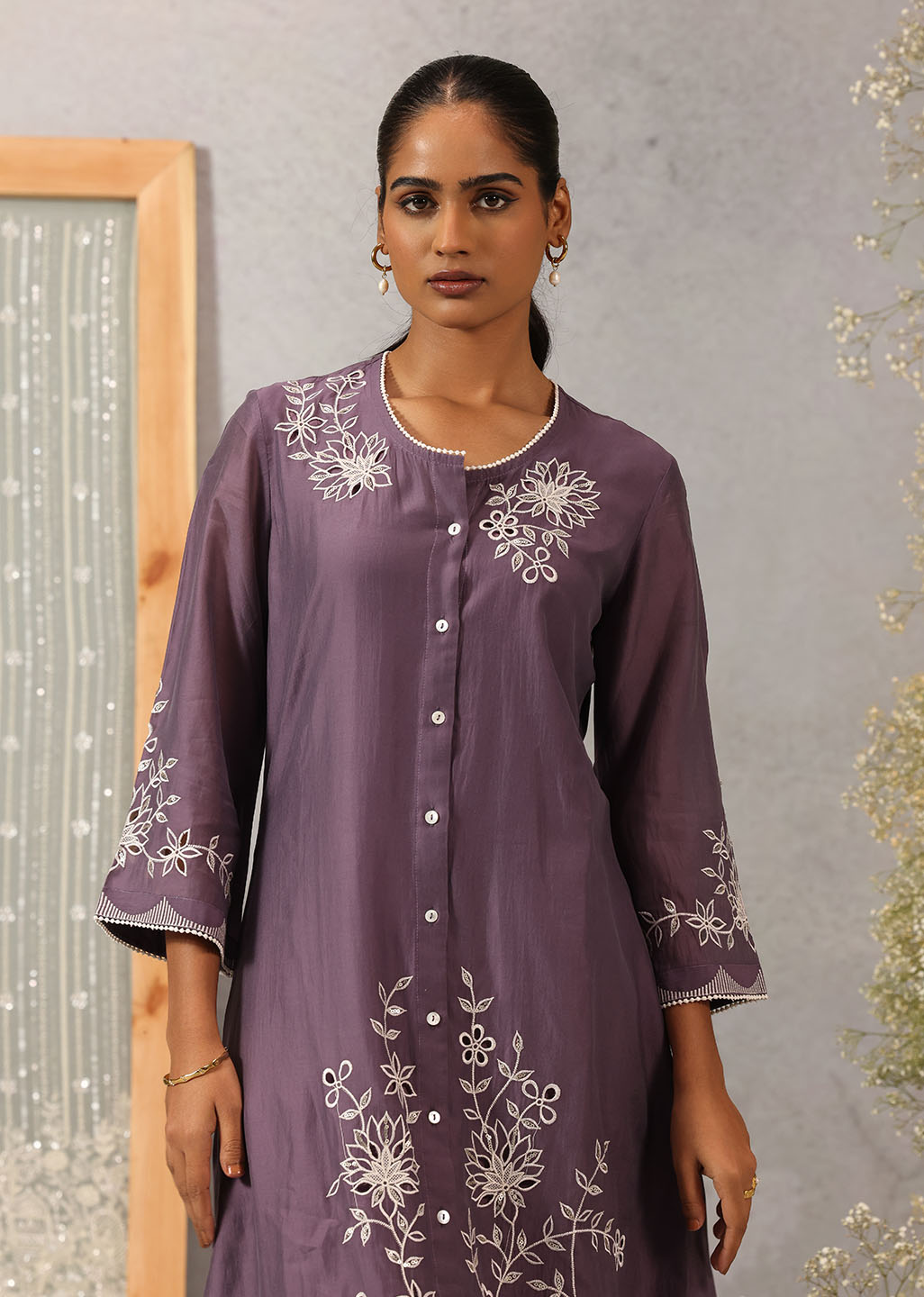 This purple-hued kurta embodies softness and serenity. The A-line silhouette drapes gently, while the floral silk threadwork unfurls across the neckline, sleeves, hem, and back with graceful artistry. Scuplted cutwork, shimmering accents, and delicate lace edging bring a whisper of celebration to its tranquil palette, making it an elegant choice for both day and dusk.
