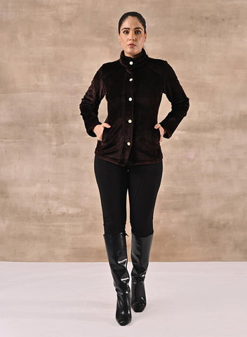 Brown Corduroy High Neck Jacket with Button Detailing - Lakshita