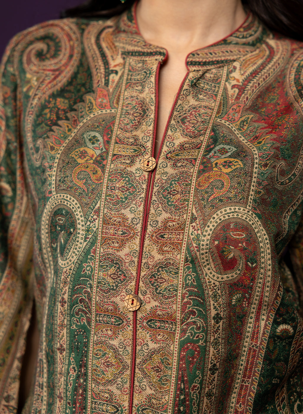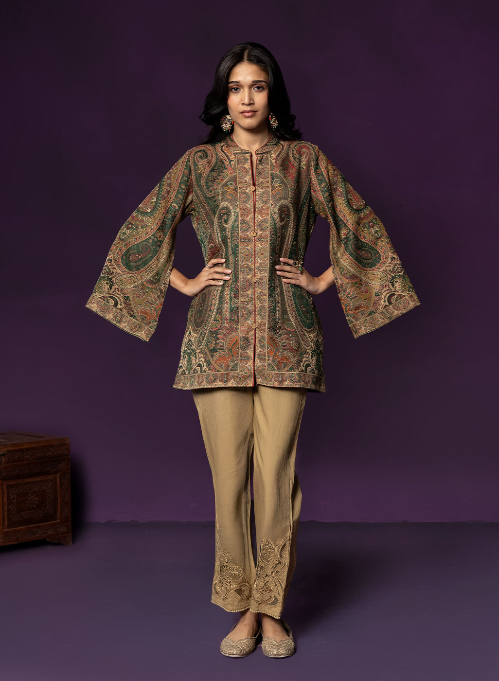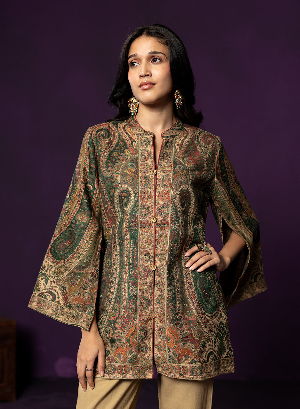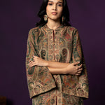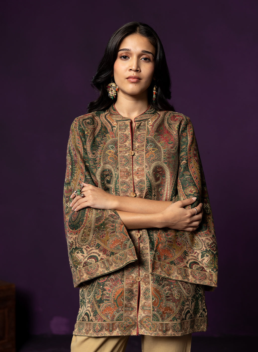 Drawing from the opulence of Mughal artistry, this forest-green jamawar cape-style jacket is a vision of timeless grace. The traditional intricate paisley motifs juxtapose against the contemporary mandarin collar and cape-style sleeves. A perfect blend of tradition and ease, it's that statement piece you'll reach for when you want effortless elegance.