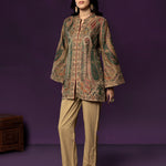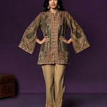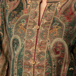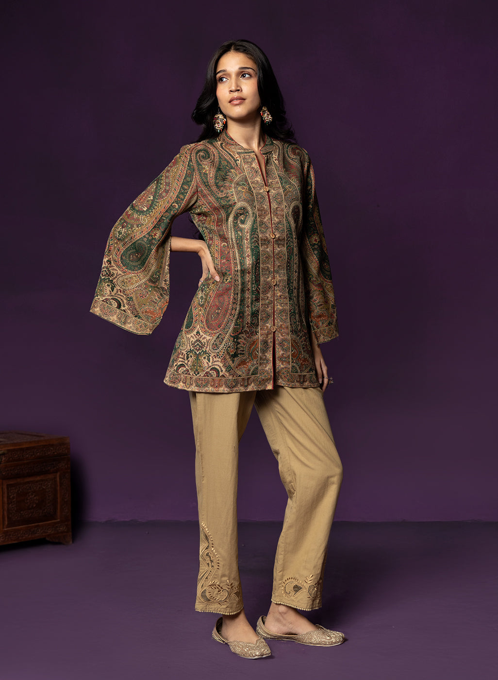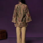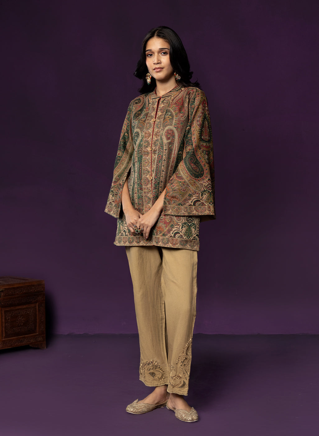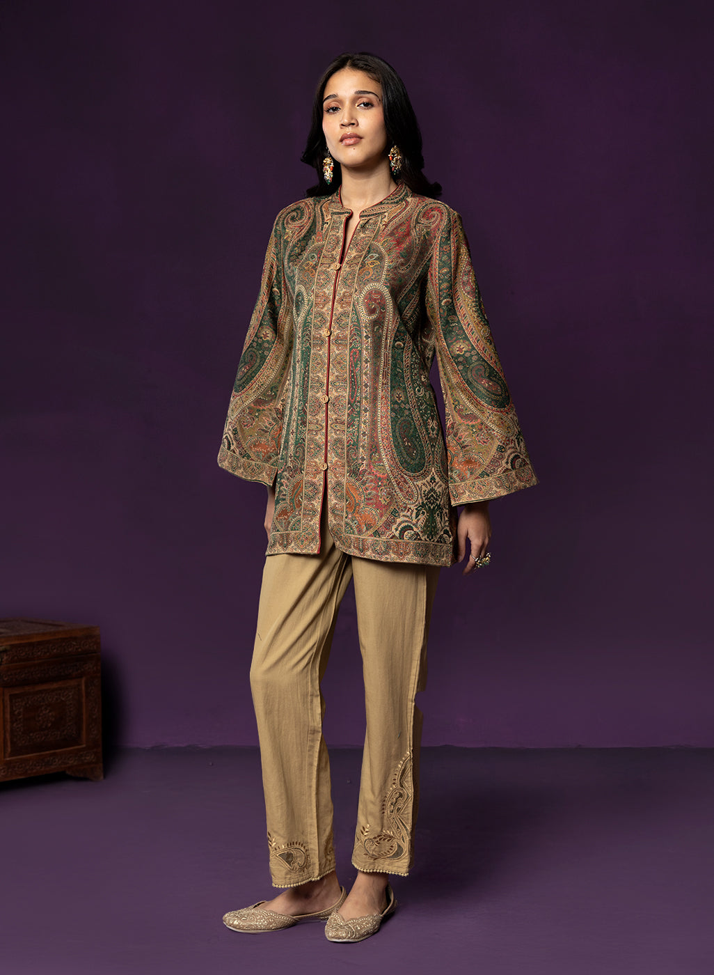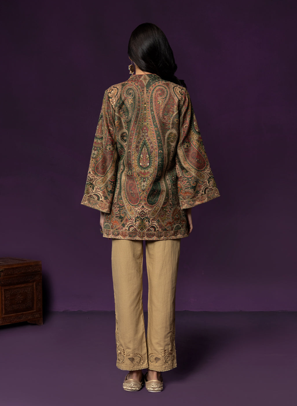 Drawing from the opulence of Mughal artistry, this forest-green jamawar cape-style jacket is a vision of timeless grace. The traditional intricate paisley motifs juxtapose against the contemporary mandarin collar and cape-style sleeves. A perfect blend of tradition and ease, it's that statement piece you'll reach for when you want effortless elegance.