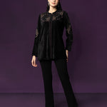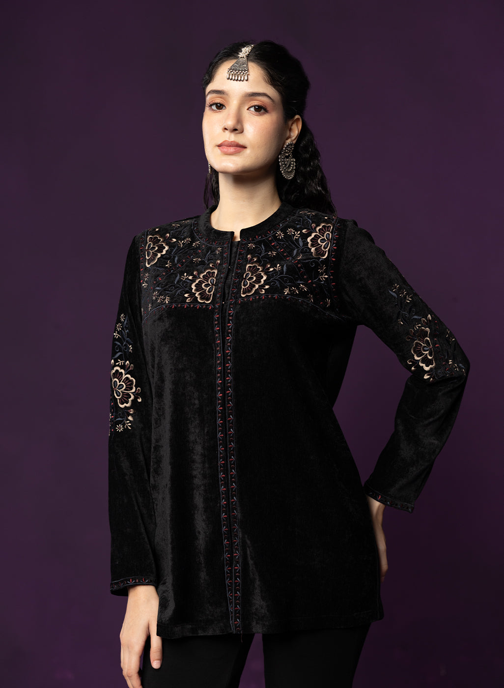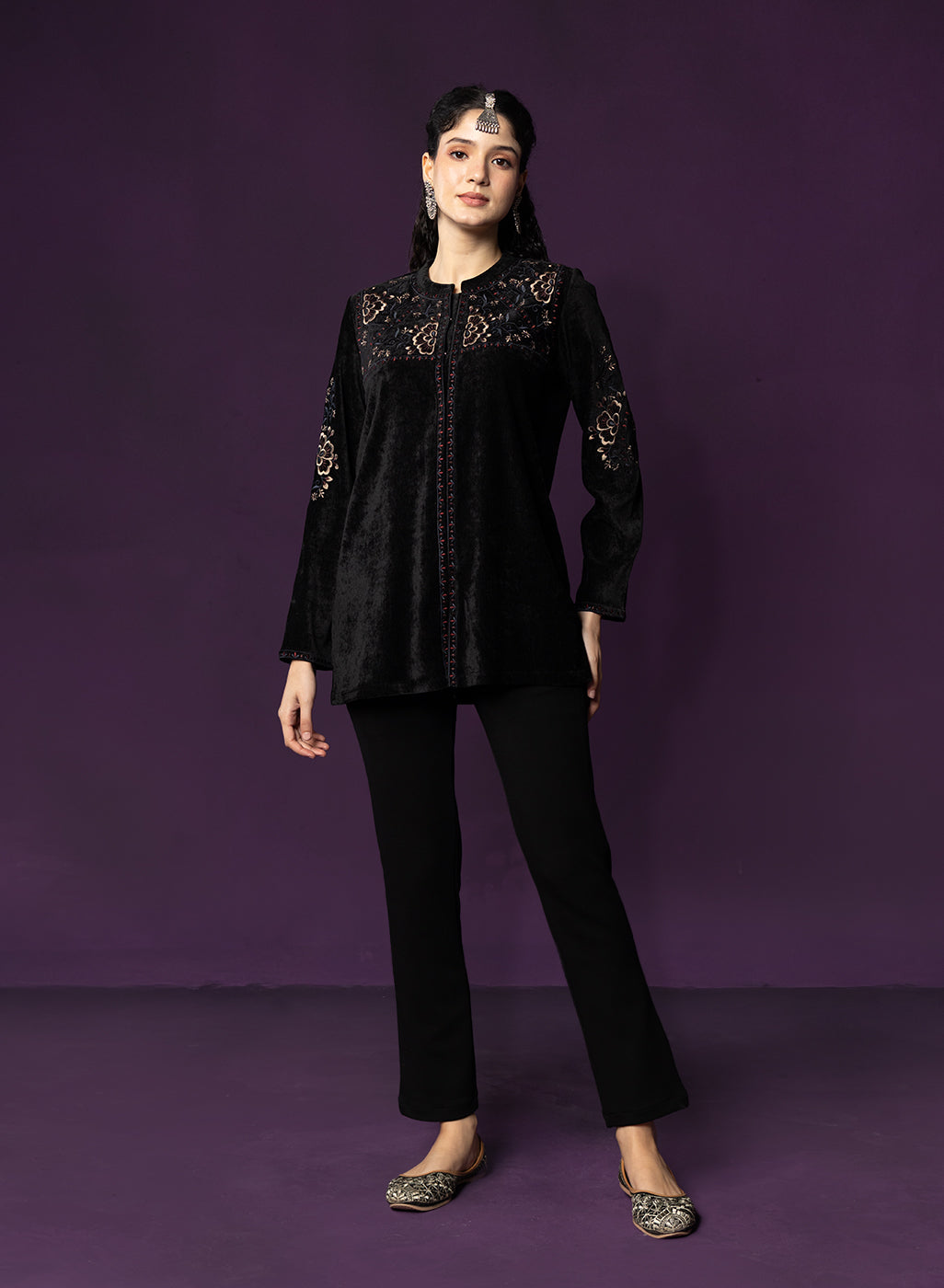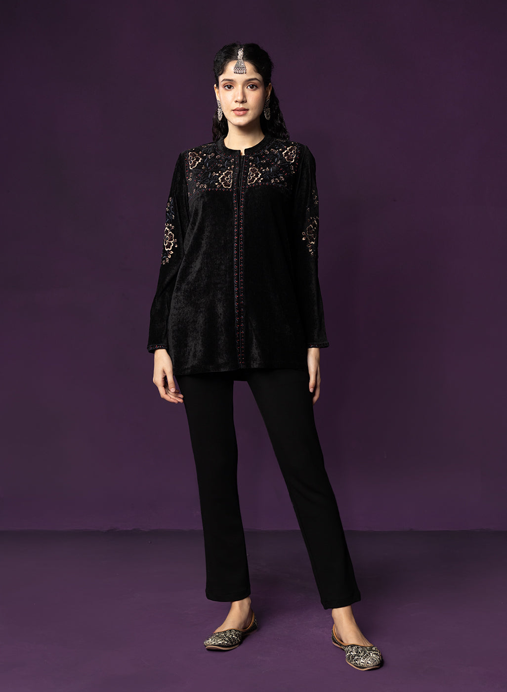 Classic, comfy, and a little bit chic, this black velvet top brings together timeless craftsmanship and easy elegance. The resham embroidery across the front, back yoke, and sleeves adds a beautiful handcrafted charm, while the front closure and mandarin collar lend it a structured, contemporary finish.
