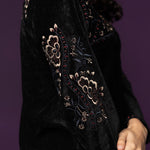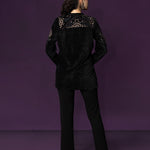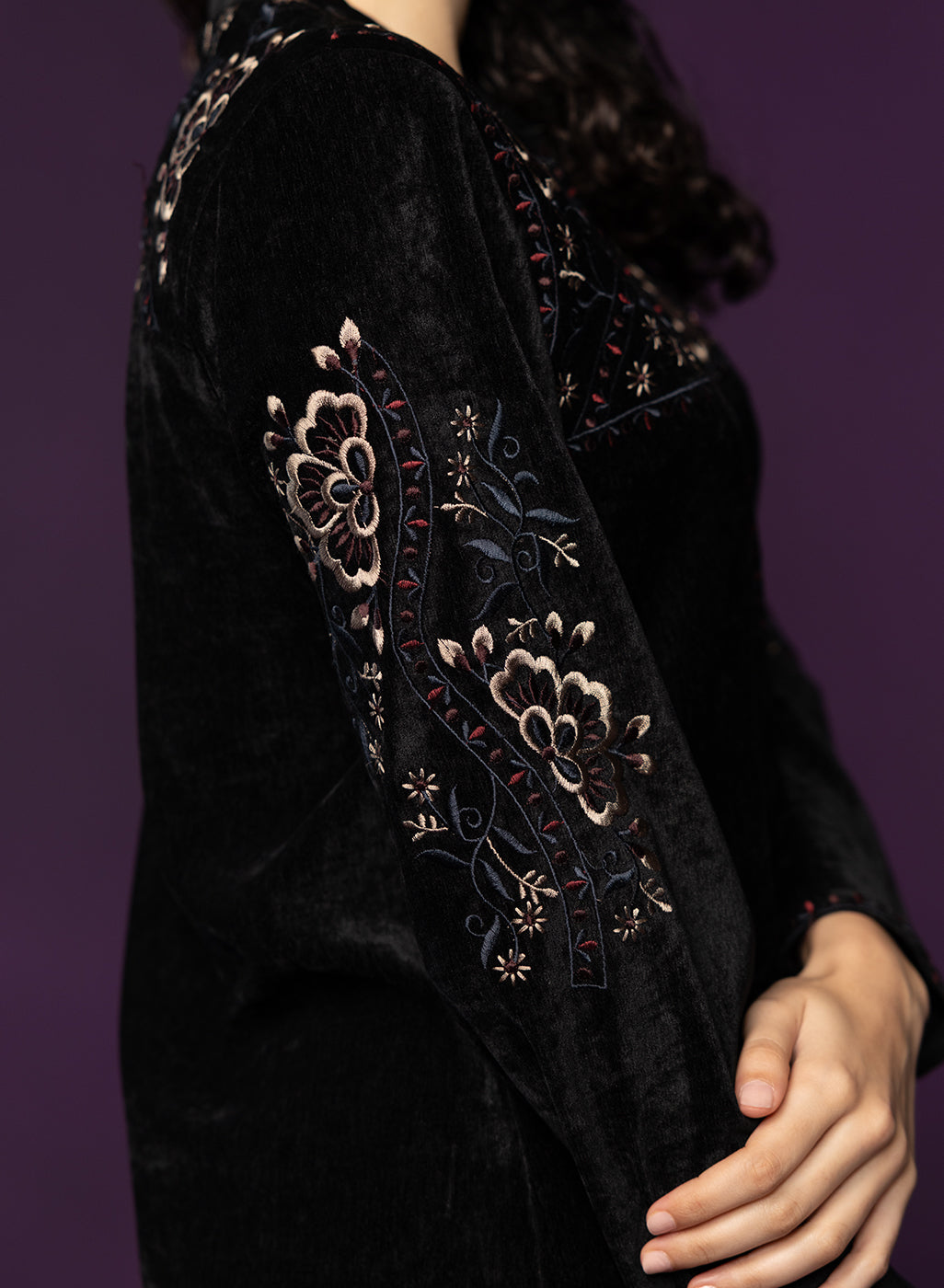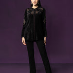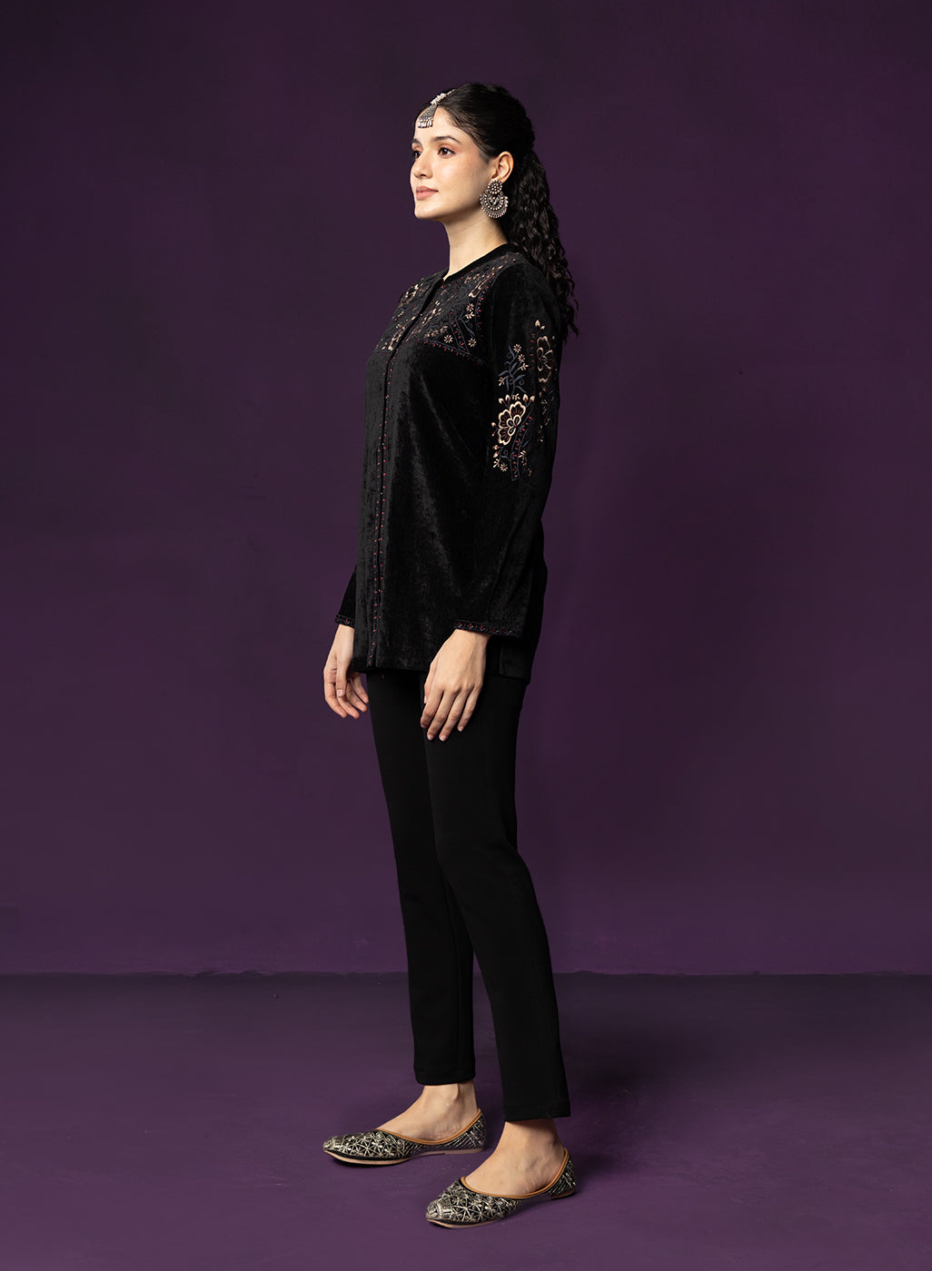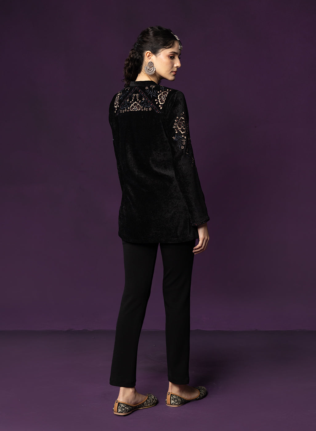 Classic, comfy, and a little bit chic, this black velvet top brings together timeless craftsmanship and easy elegance. The resham embroidery across the front, back yoke, and sleeves adds a beautiful handcrafted charm, while the front closure and mandarin collar lend it a structured, contemporary finish.