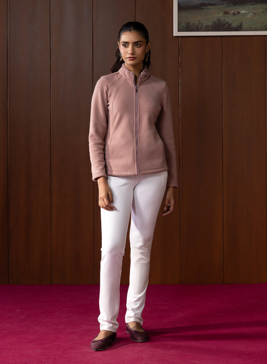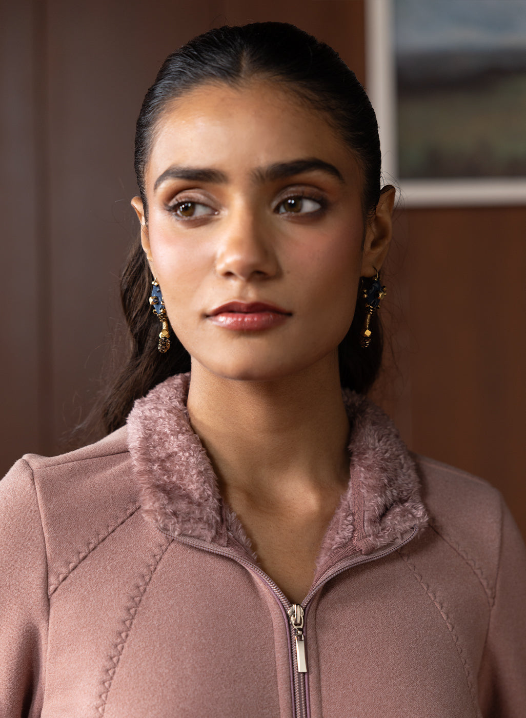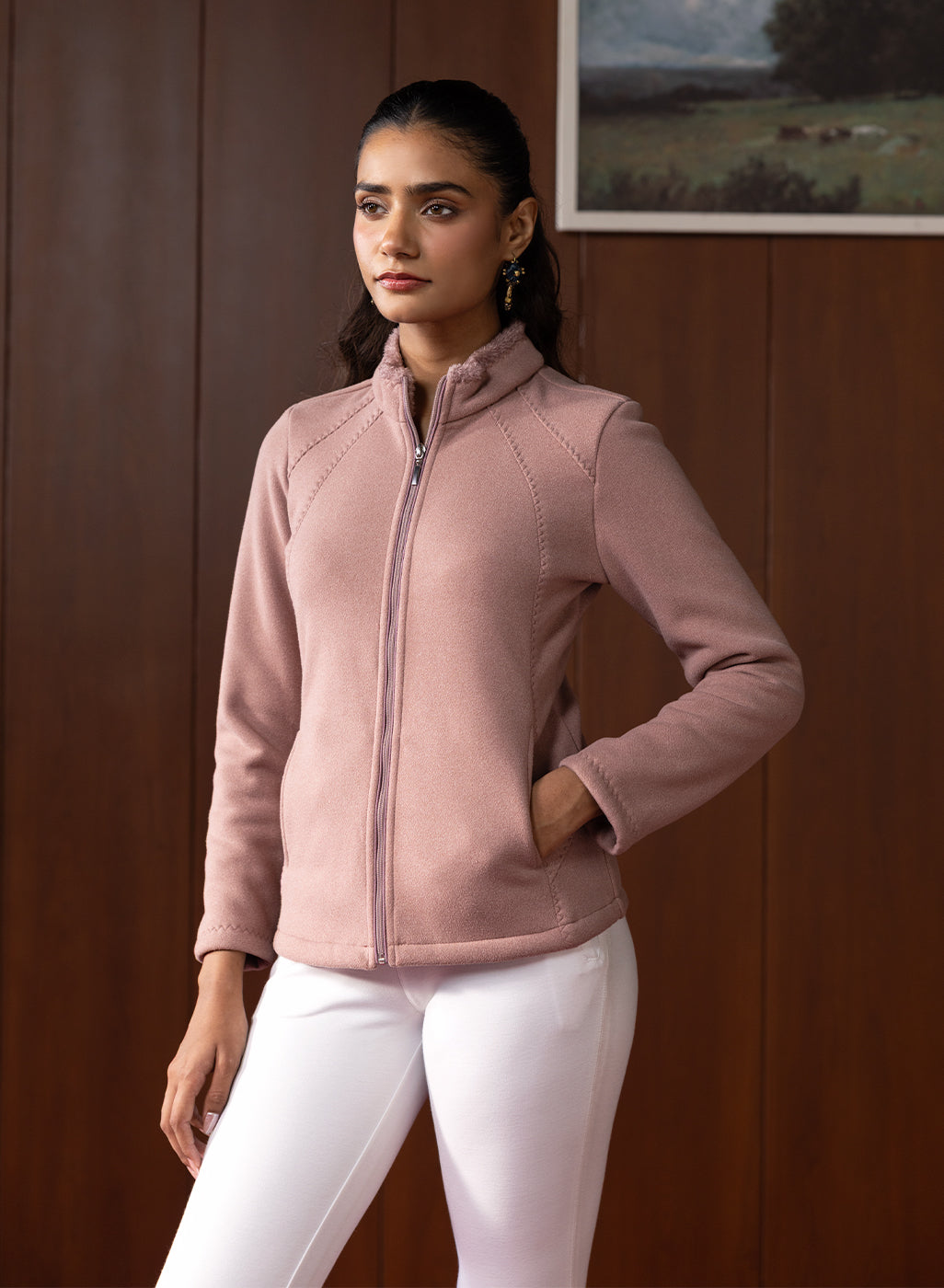 Soft tones meet snug comfort in this blush pink jacket. Tailored from plush fabric with panel detailing, it feels as good as it looks. The warm fur lining adds a layer of coziness, while the high neck and zip closure keep the chill out. This is perfect for those who like to stay warm with a touch of femininity!