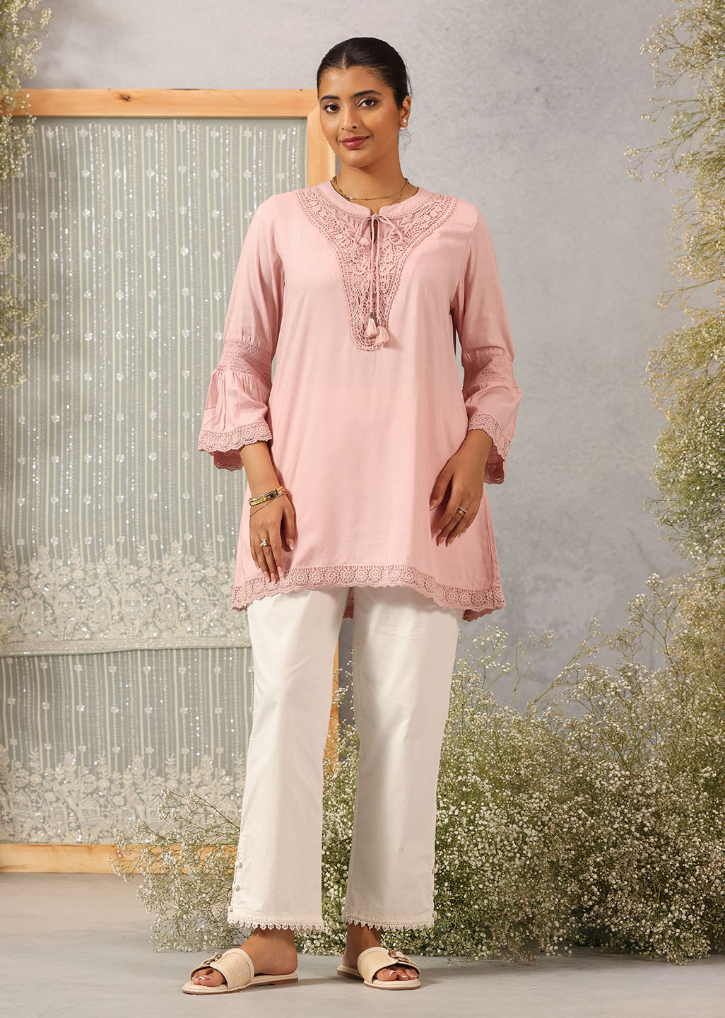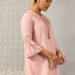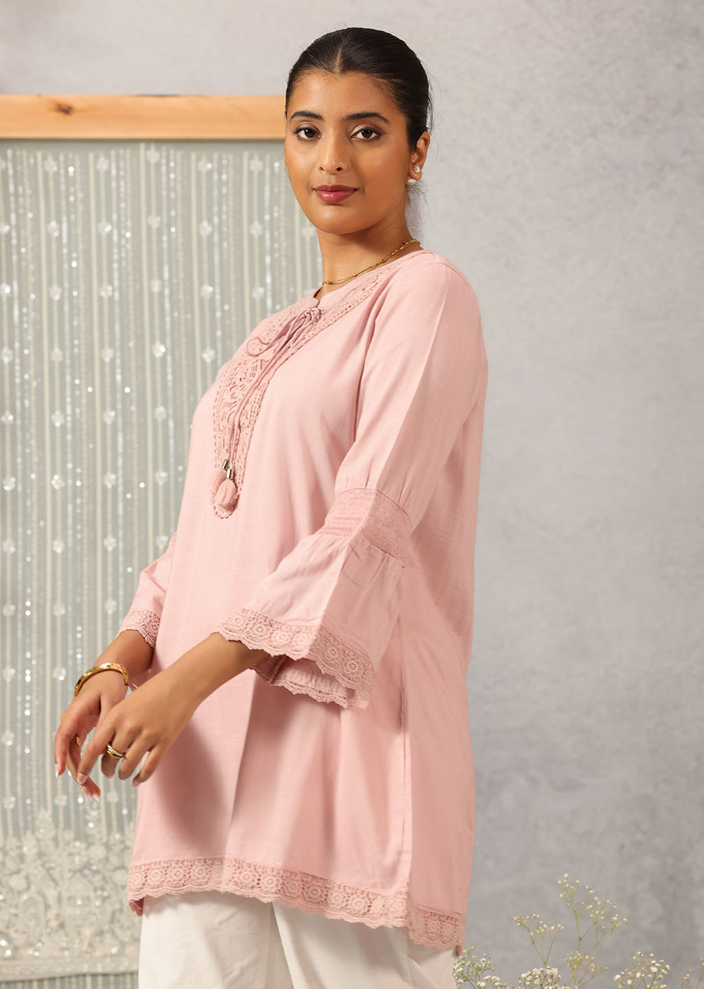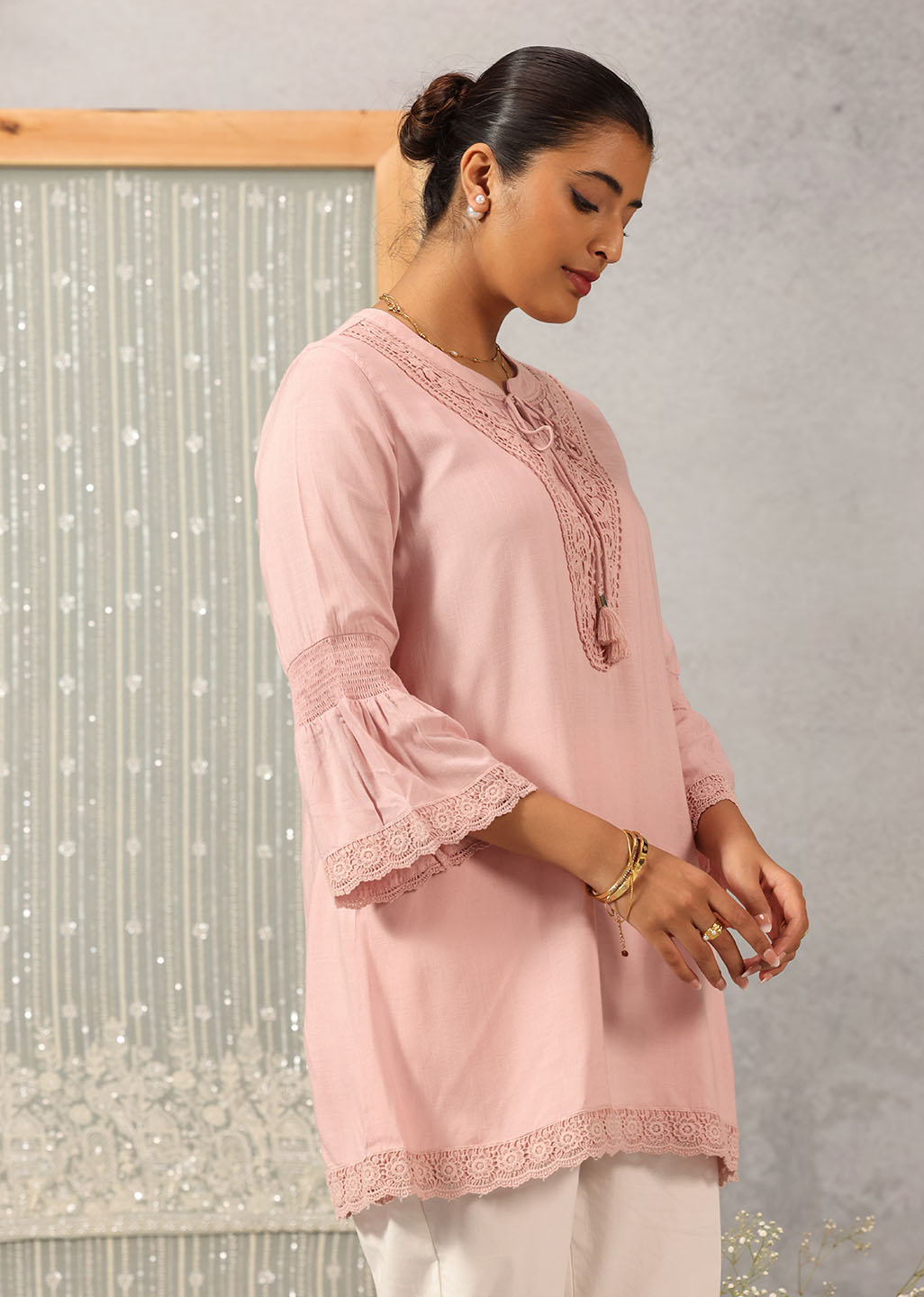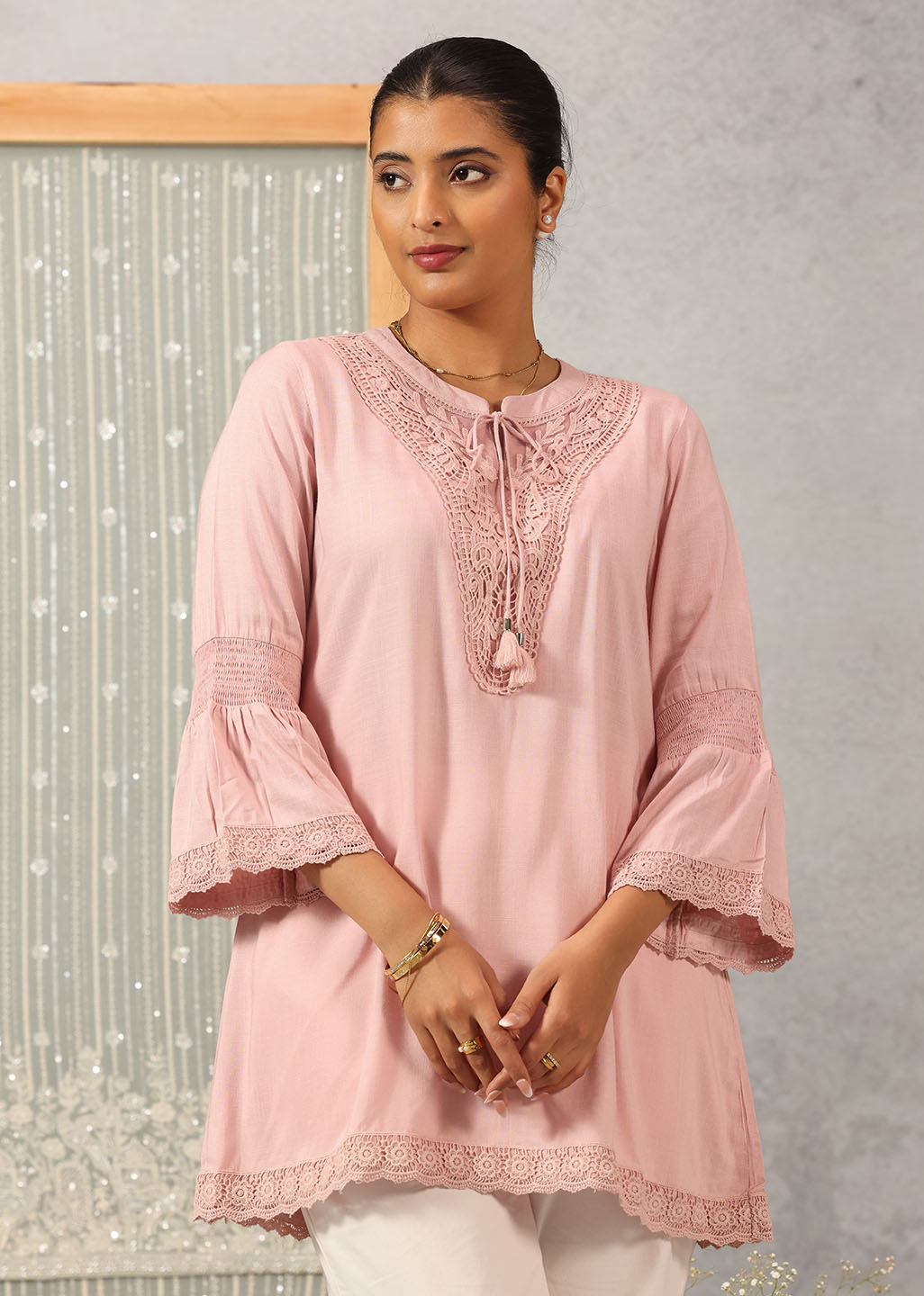 Pink Solid Tunic with Keyhole Neck and Bell Sleeves
