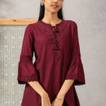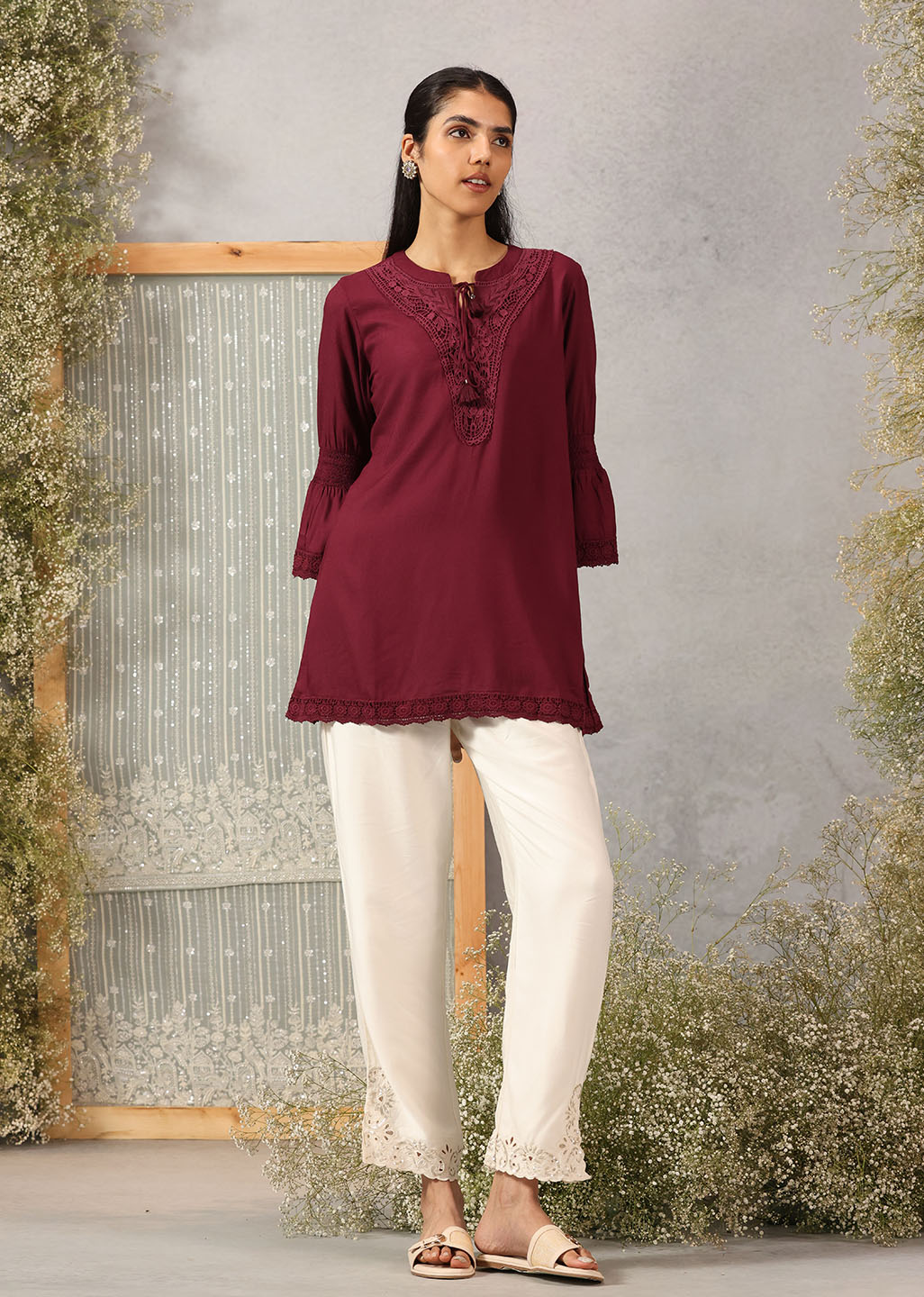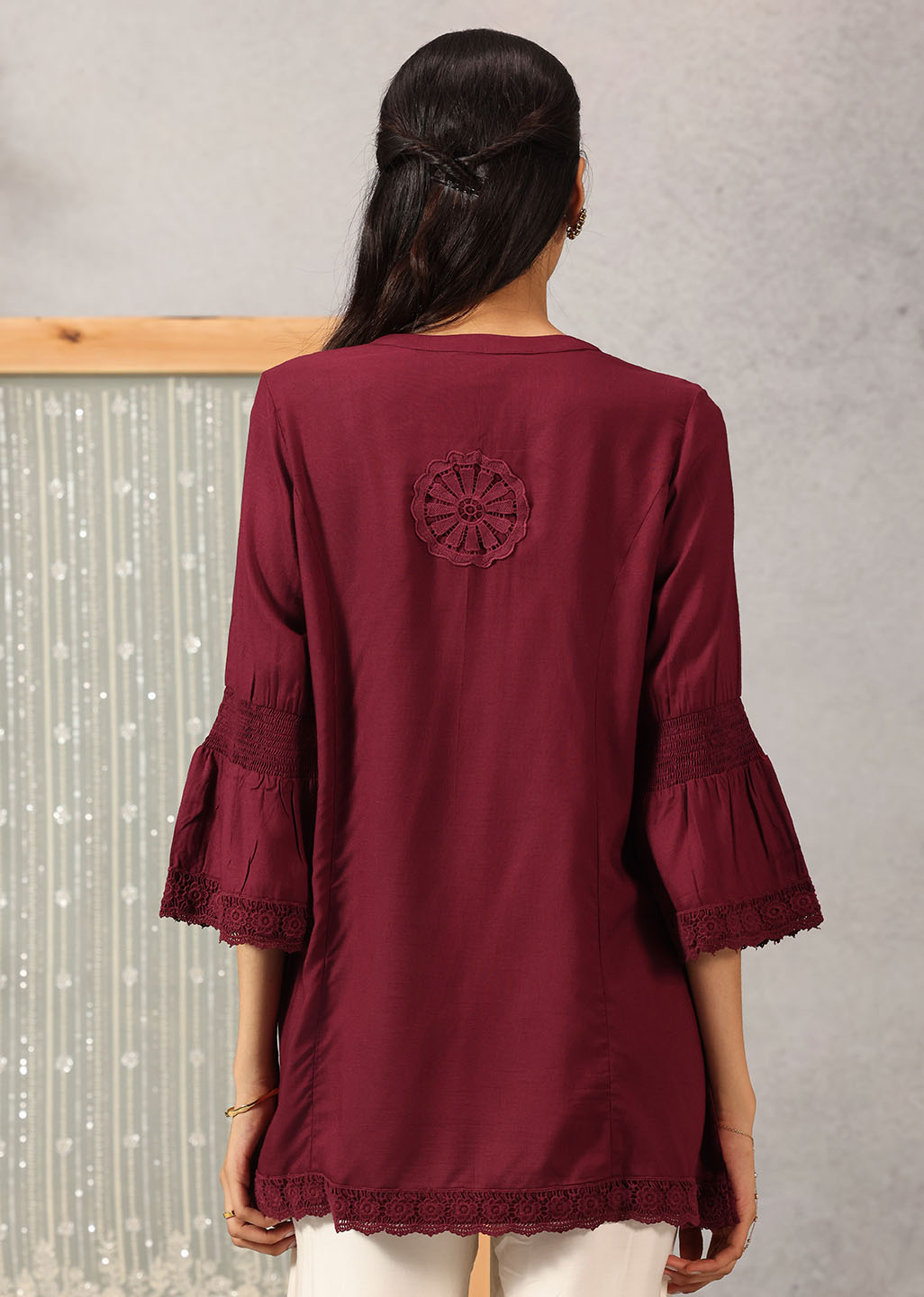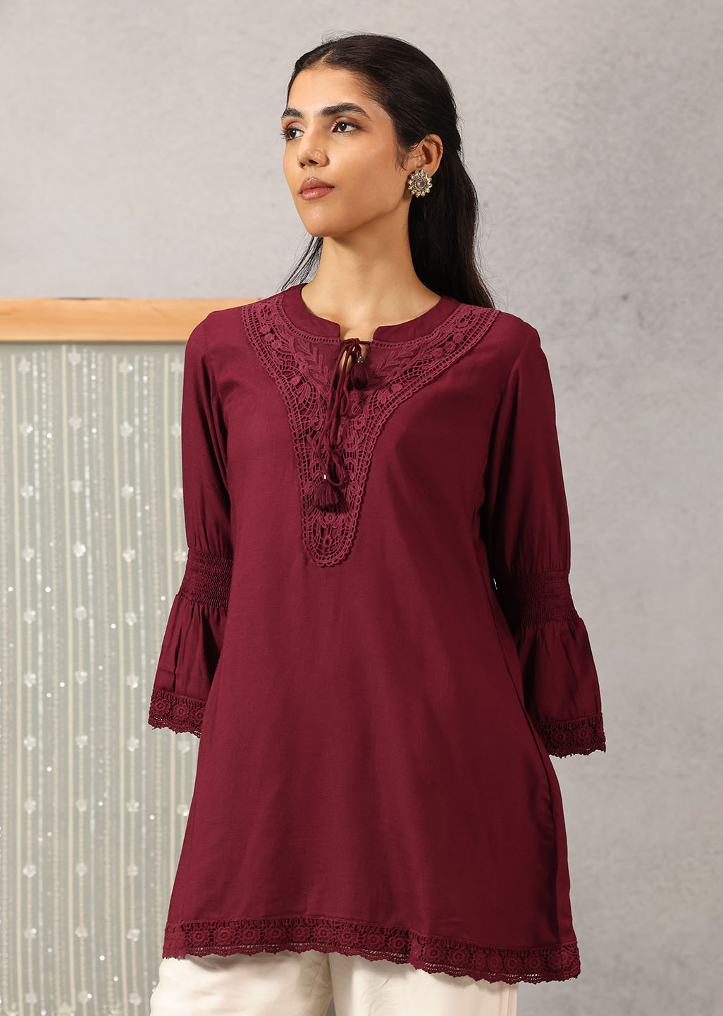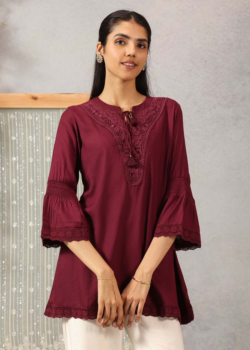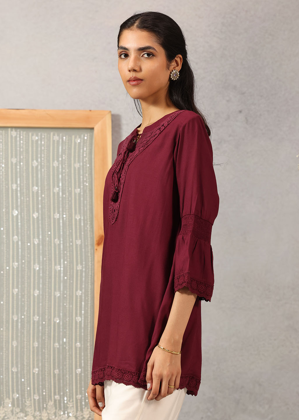Ruby Wine Solid Tunic with Keyhole Neck and Bell Sleeves