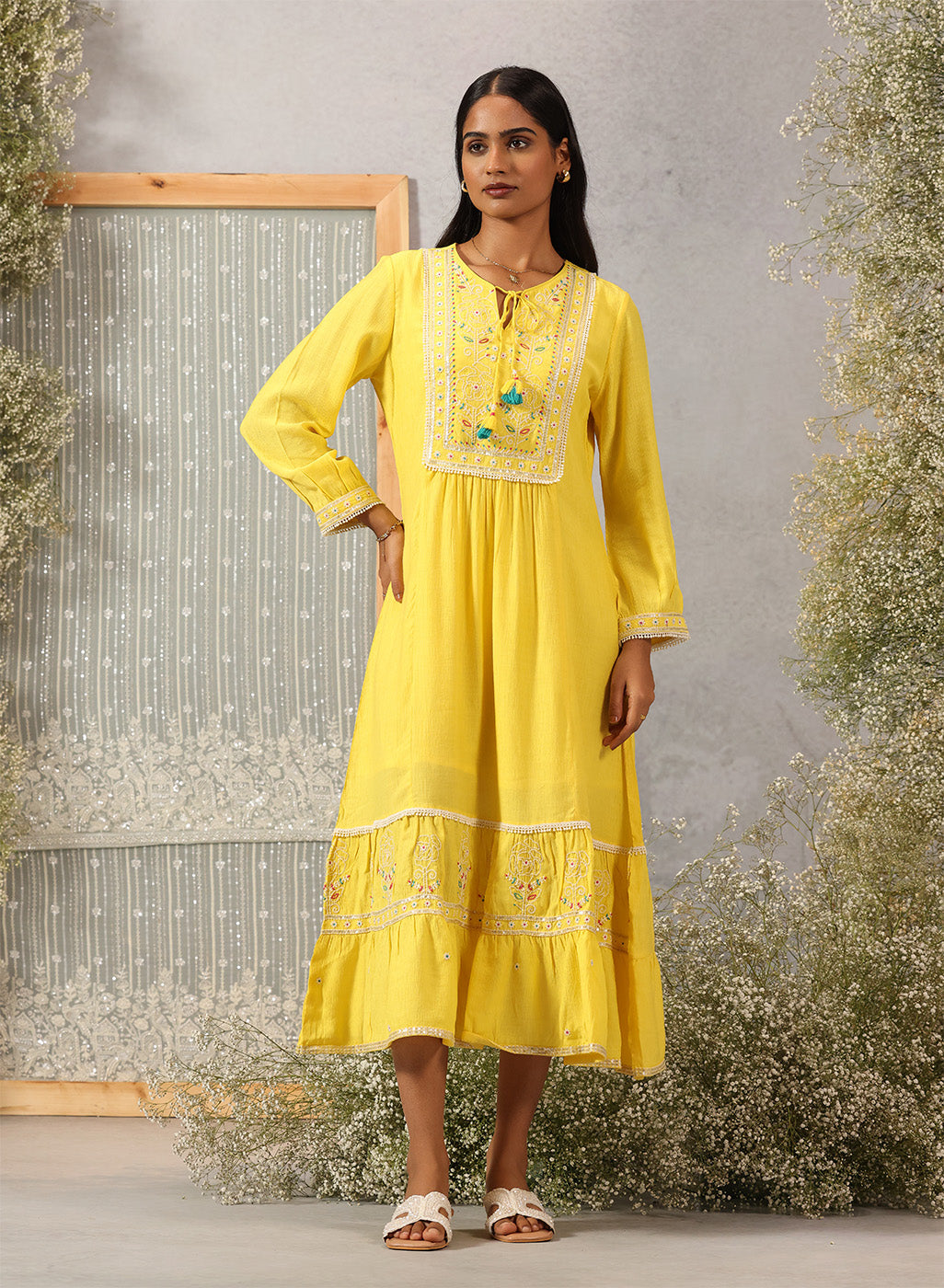 Nairang Buttercup Yellow Embroidered Crinckled Viscose Dress for Women