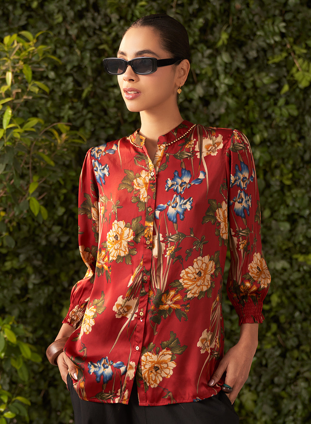 Lisa Navy Blue Printed Satin A-line Shirt for Women