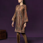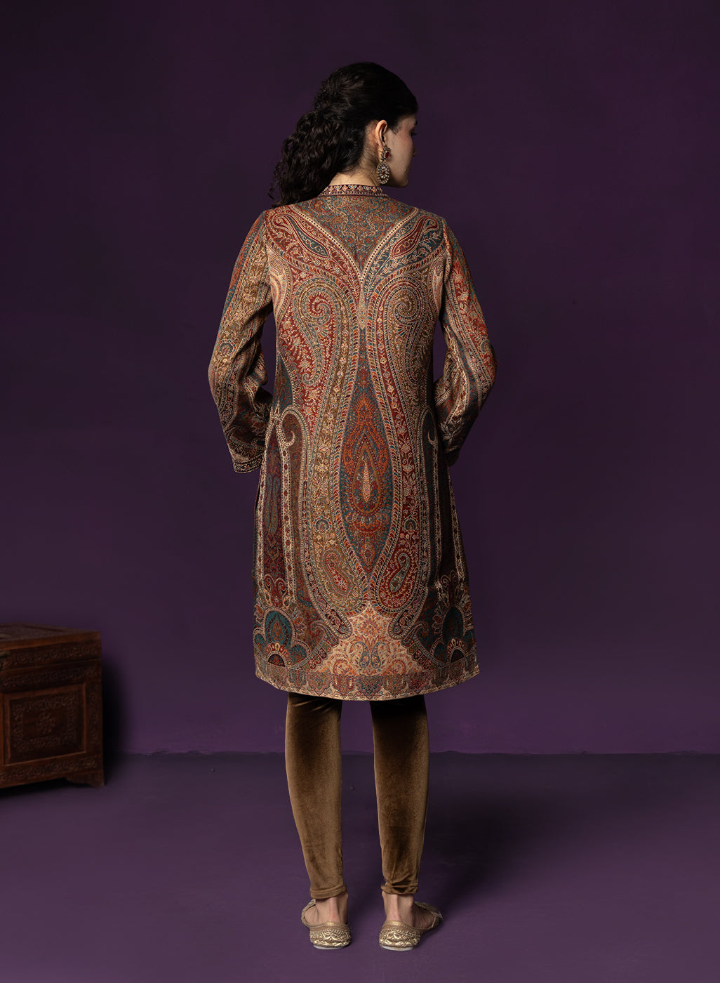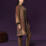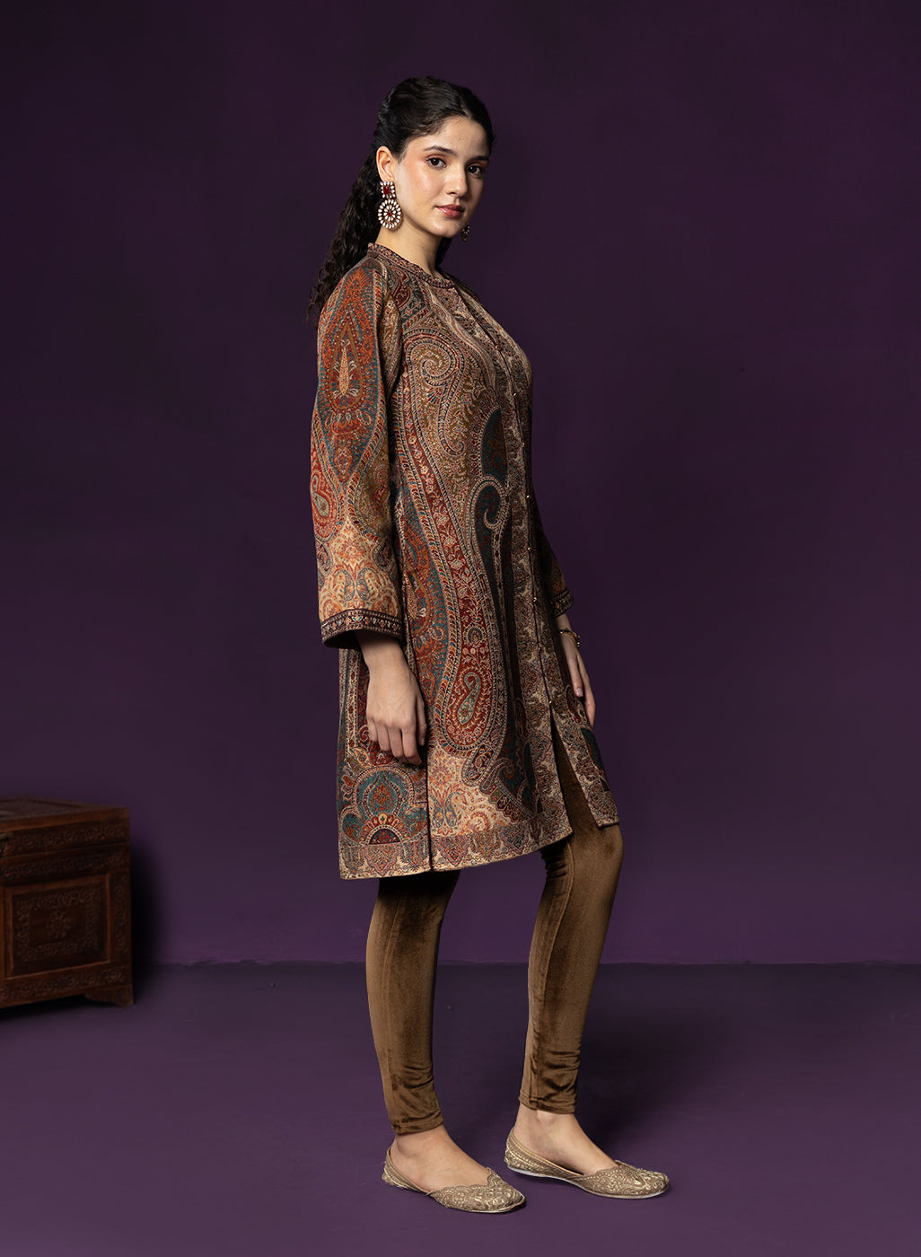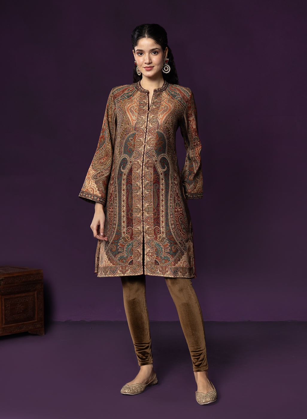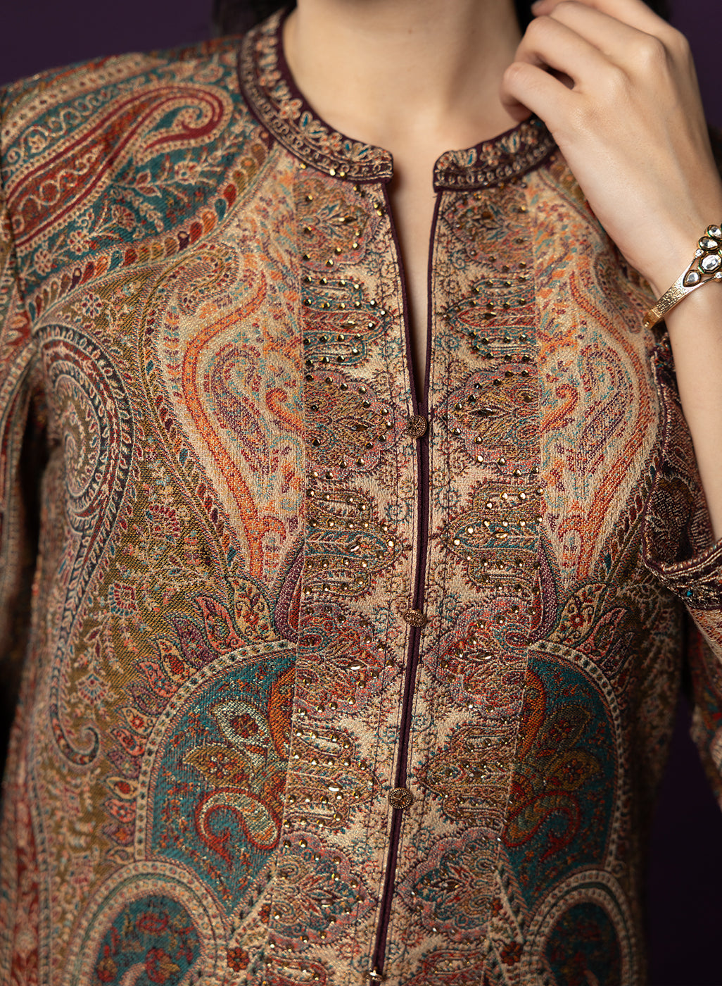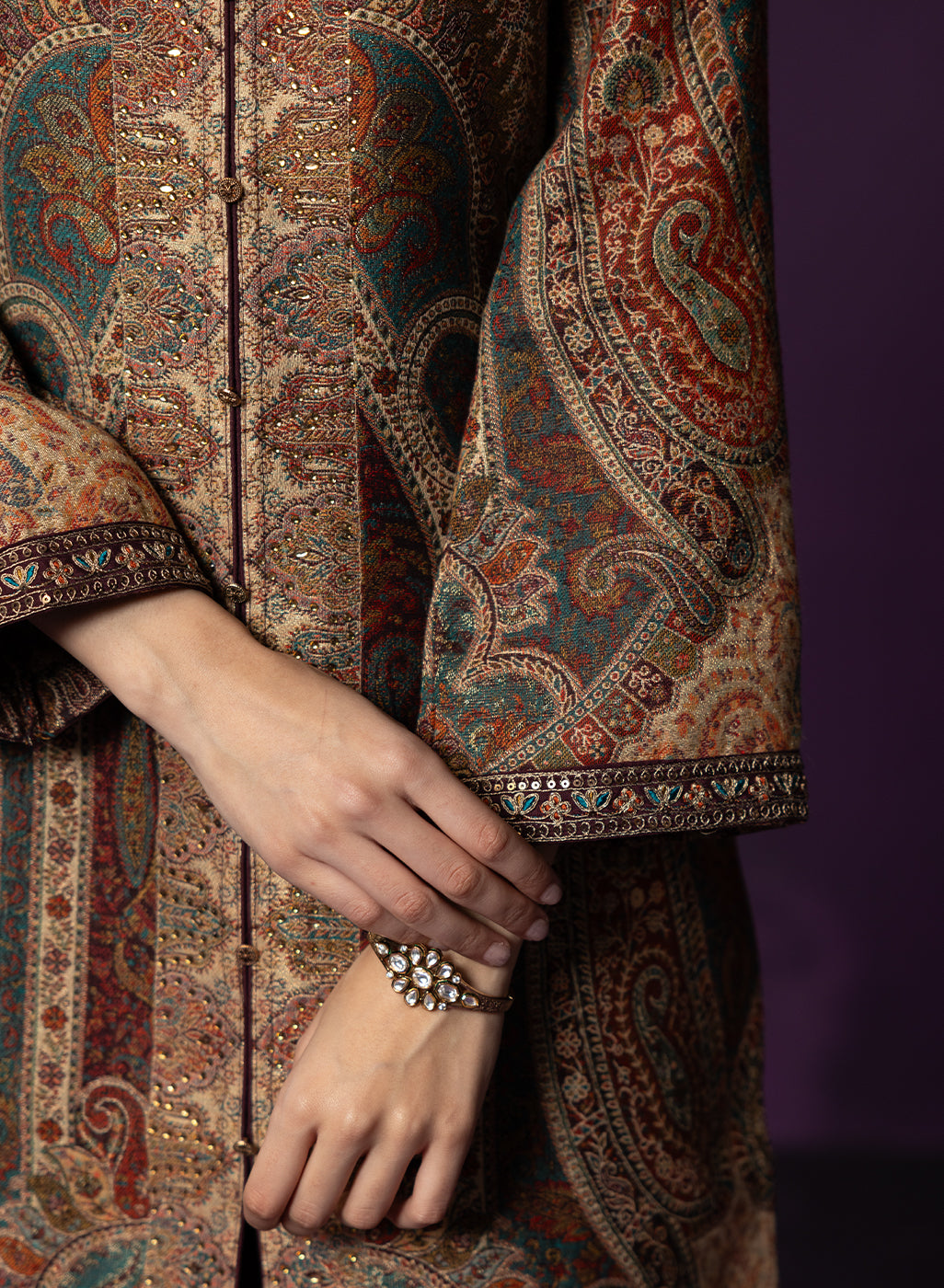 Immerse yourself in the old-world grandeur of Jamawar with this exquisite wine kurta. Inspired by the royal looms of Kashmir, its intricate paisley motifs, luxurious texture, and detailed handwork evoke the charm of heirloom craftsmanship. Every element—from the ornate neck detailing to the delicate shimmer of sequins—enhances its timeless, heritage-rich appeal, making it a piece that feels both regal and deeply nostalgic.