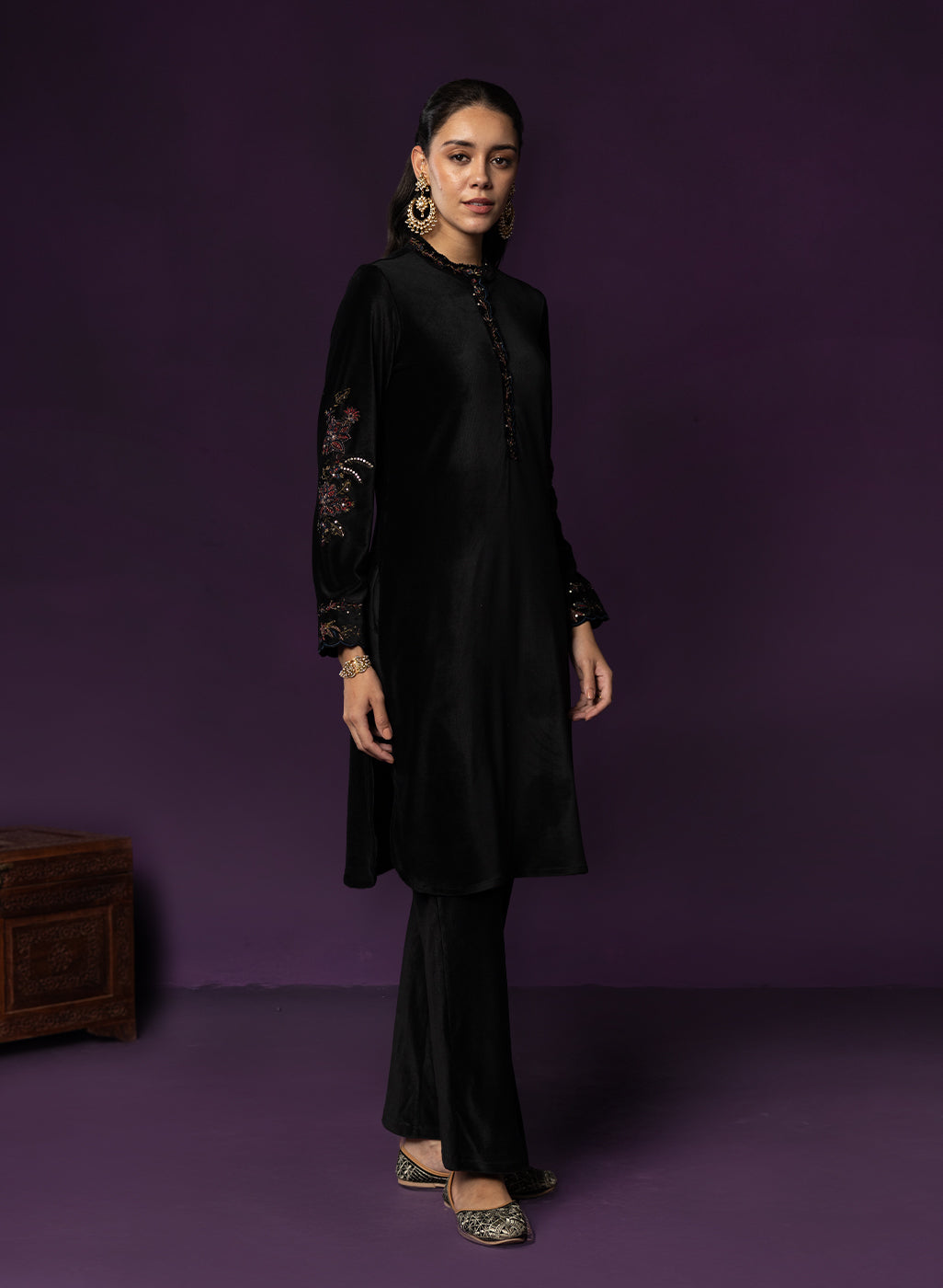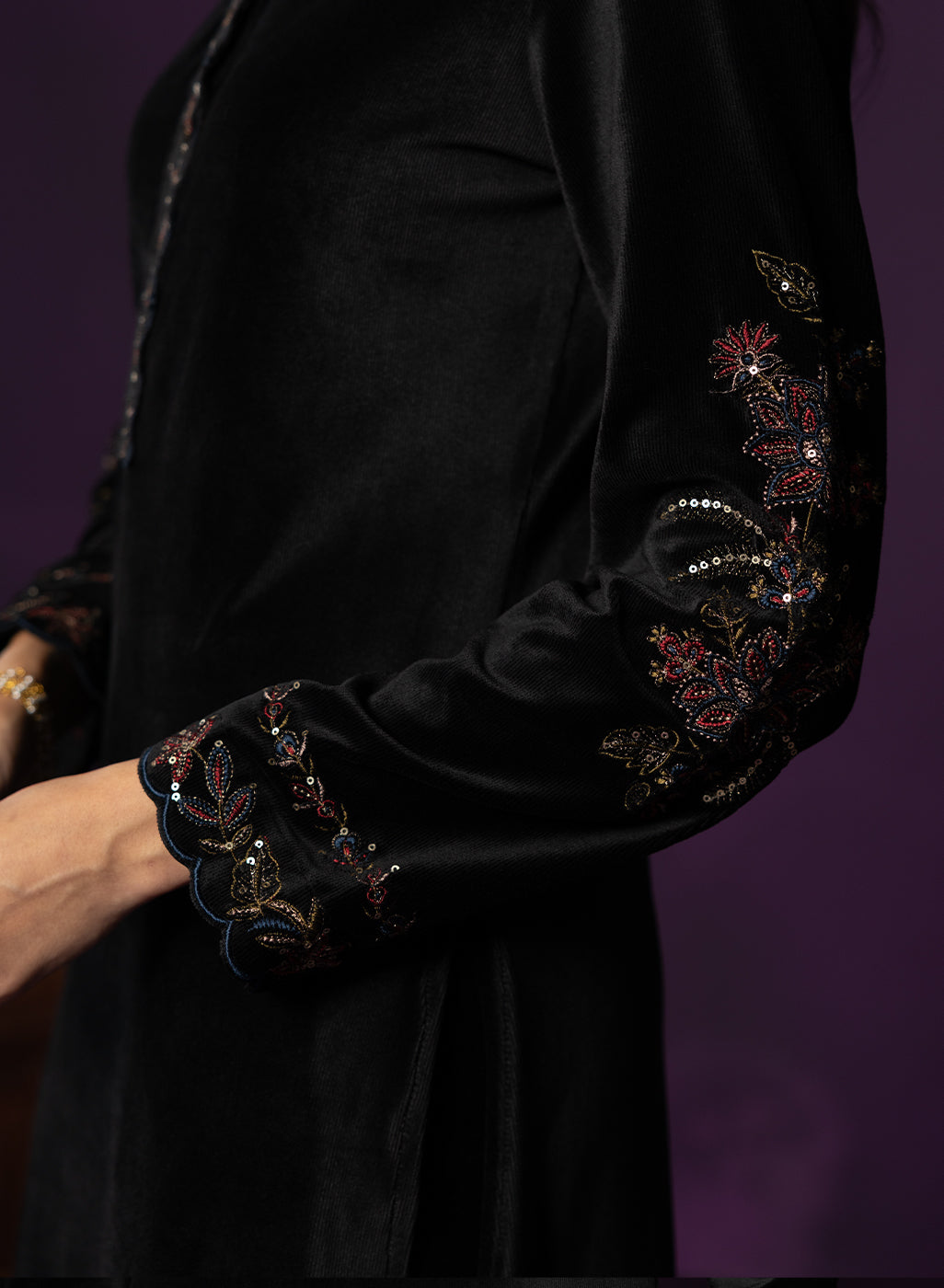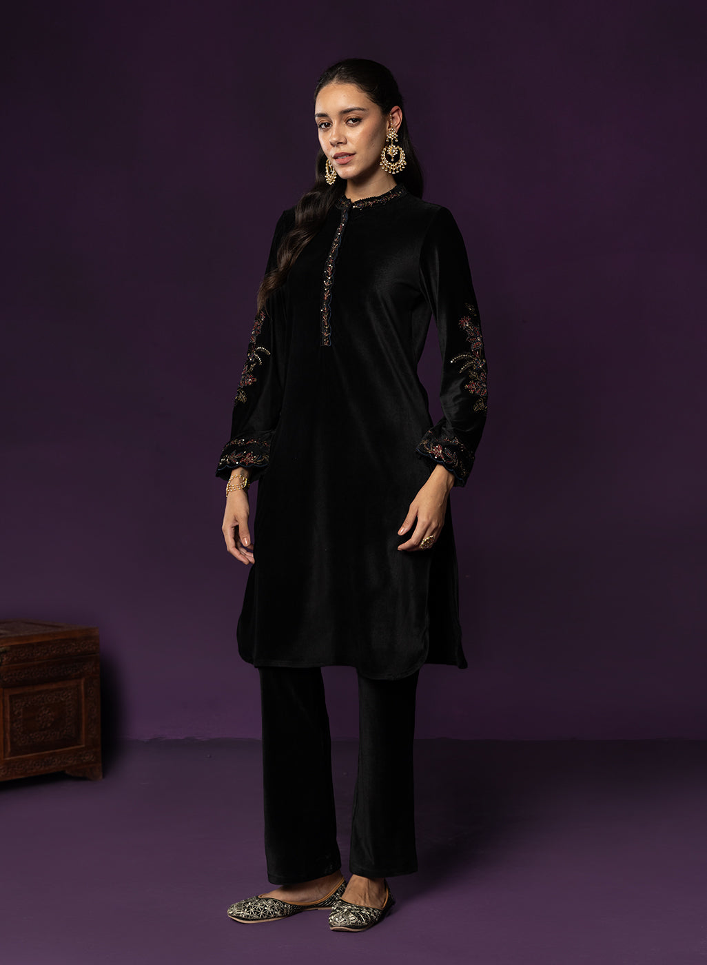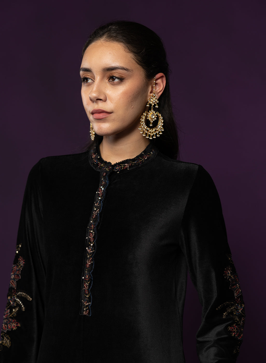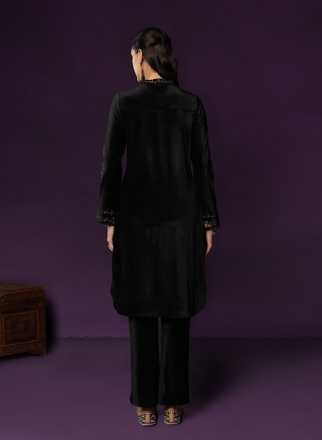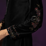 Elegant, timeless, and effortlessly chic, this black velvet co-ord set is the definition of understated glamour. Its simplicity takes centre stage, allowing the plush texture of velvet and the subtle shimmer of resham, zari, and sequin embroidery to shine. Perfect for those who love classic pieces with a touch of festive finesse, this ensemble transitions beautifully from day celebrations to evening soirées.