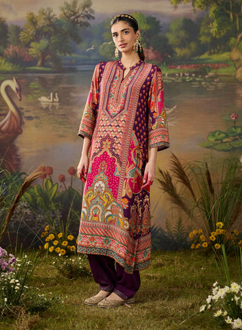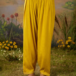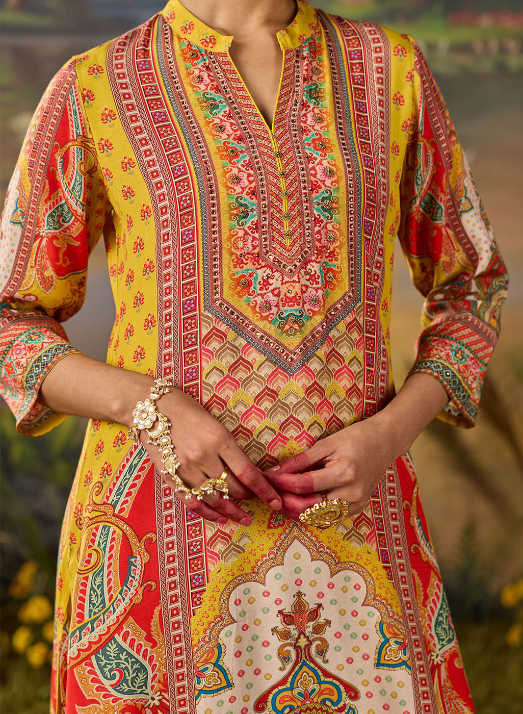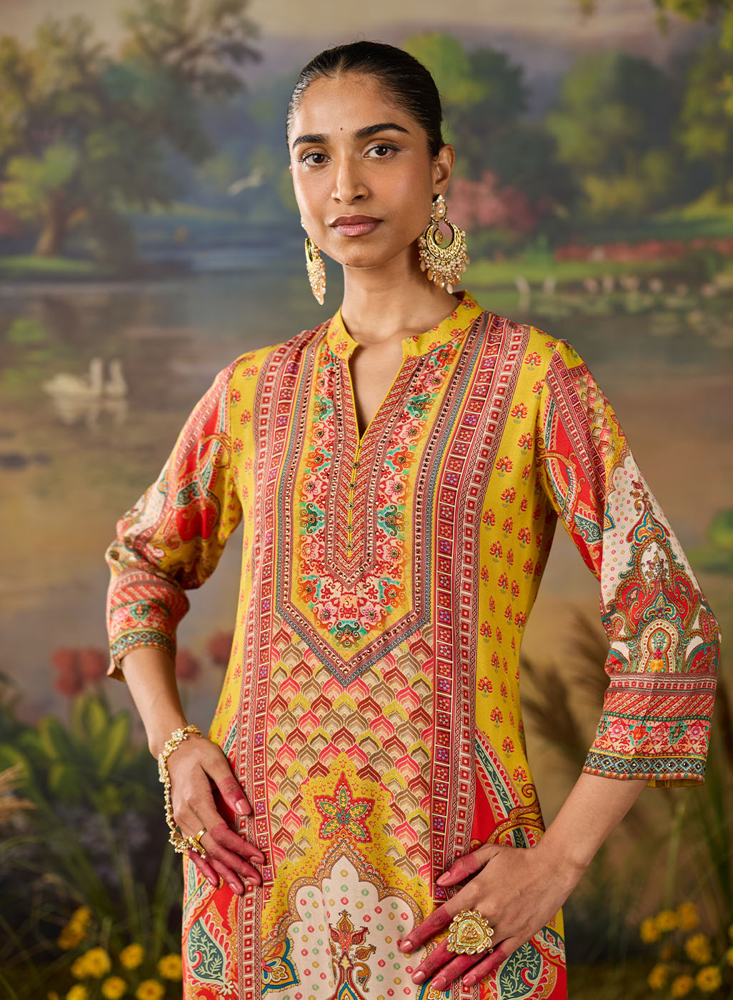 Bright, bold, and steeped in tradition. This mustard heritage print kurta set is a true celebration of Indian craftsmanship and design. Crafted in lustrous printed shantoon set, the fabric carries an all-over print inspired by intricate motifs seen in royal architecture and age-old textiles. The straight silhouette is beautifully detailed with delicate embroidery and rhinestone embellishments at the neckline. Paired with a matching salwar, this traditional mustard kurta set is perfect for when you want to make a statement without compromising on comfort.